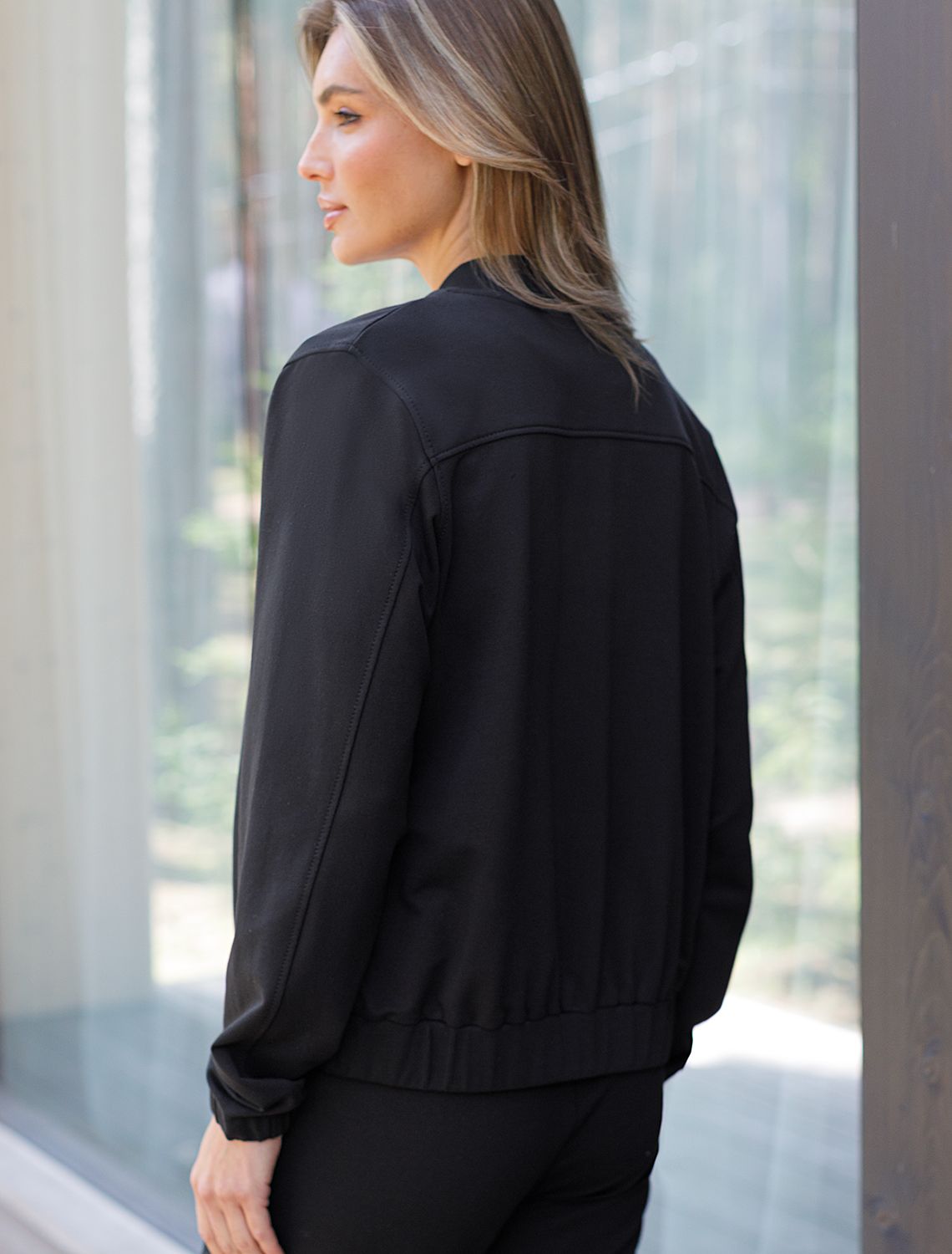 Бомбер черного цвета среднего объема на молнии с карманами из премиального футера двухнитки — это стильный выбор для ценительниц минимализма и комфорта. Натуральный состав обеспечивает дышащий эффект, мягкость и приятные тактильные ощущения, Эластичный материал позволяет свободно двигаться без лишнего стеснения, а также отлично сохраняет форму даже после длительного ношения. Манжеты на рукавах и резинка по низу обеспечивают надежную посадку, сохраняя тепло в прохладную погоду. Повседневный бомбер отличается аккуратным силуэтом без лишнего объема и универсальной длиной, которая идеально подходит для повседневного и спортивного образа. Прорезные карманы по бокам добавляют функциональности, сохраняя при этом стильный внешний вид. Бомбер из футера украшен деликатной вышивкой в виде эмблемы бренда, которая придает особый шарм и подчеркивает индивидуальность владелицы. Такой изысканный элемент декора гармонично сочетается с лаконичным дизайном, отвечая современным тенденциям моды. Так же на одном из карманов расположен небольшой металлический логотип бренда.