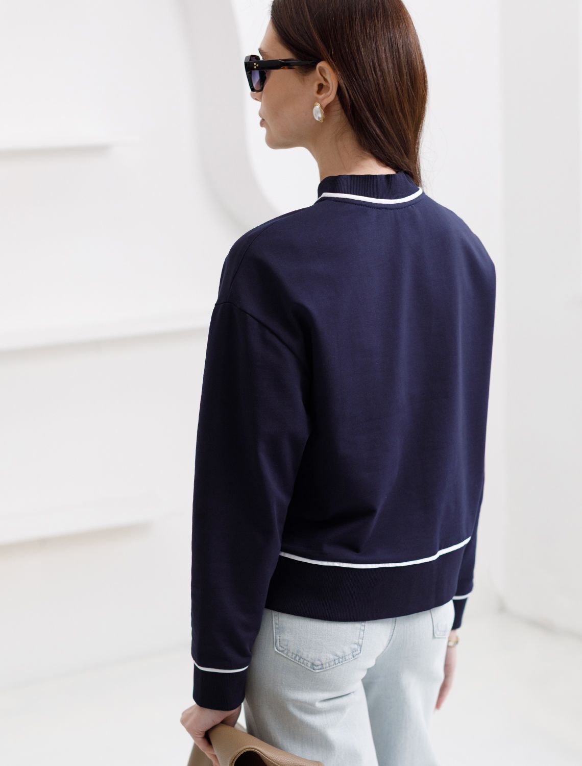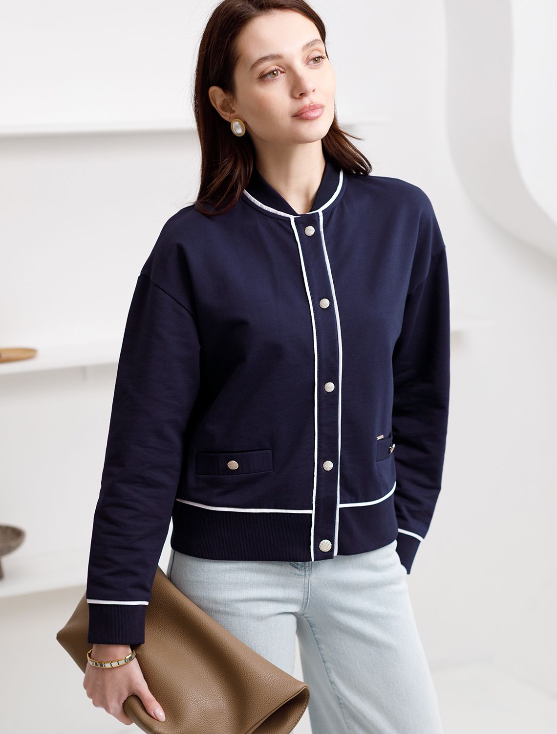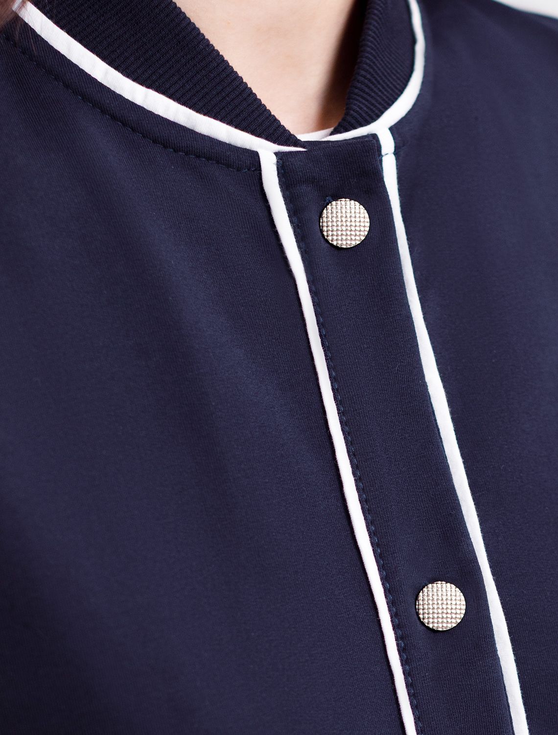 Бомбер темно-синего цвета среднего объема с застежкой на пуговицы выполнен из премиального футера двухнитки плотностью 240 Г/м2. Натуральный состав ткани обеспечивает дышащий эффект, мягкость и приятные тактильные ощущения, Эластичный материал позволяет свободно двигаться без стеснения, а также отлично сохраняет форму даже после длительного ношения. Гладкая лицевая сторона придает бомберу опрятный и дорогой вид. Повседневный бомбер отличается аккуратным силуэтом без лишнего объема и универсальной длиной, которая идеально подходит для повседневного образа. Особенность бомбера - контрастные канты на горловине, манжетах, поясе и вдоль застежки, которые добавляют современный акцент и делают его более выразительным. Представленная размерная линейка позволяет подобрать оптимальный вариант для любой фигуры и размера, на маленький или плюс сайз, обеспечивая свободу движений без компромиссов по стилю. Этот легкий бомбер станет отличным дополнением к базовому гардеробу, сочетая практичность с элегантностью