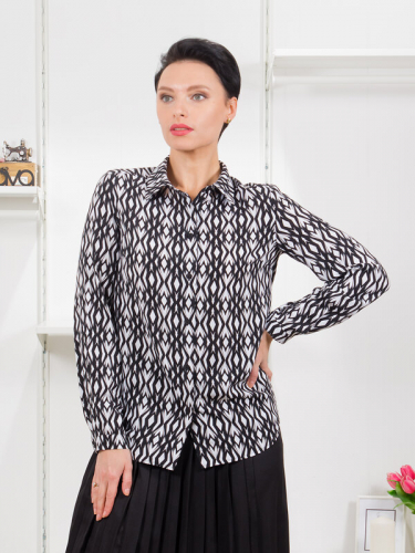 Элегантность и женственность - вот основные впечатления об этой модели. Аккуратные складки от кокетки переда обеспечат оптимальную посадку по груди. Рукав комфортной ширины завершен манжетами. Полукруглый вырез универсален для любой фигуры и формы лица. Пуговки с навесными петлями - изящный акцент, завершающий модель.