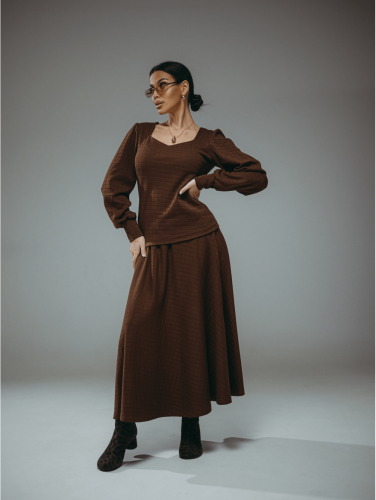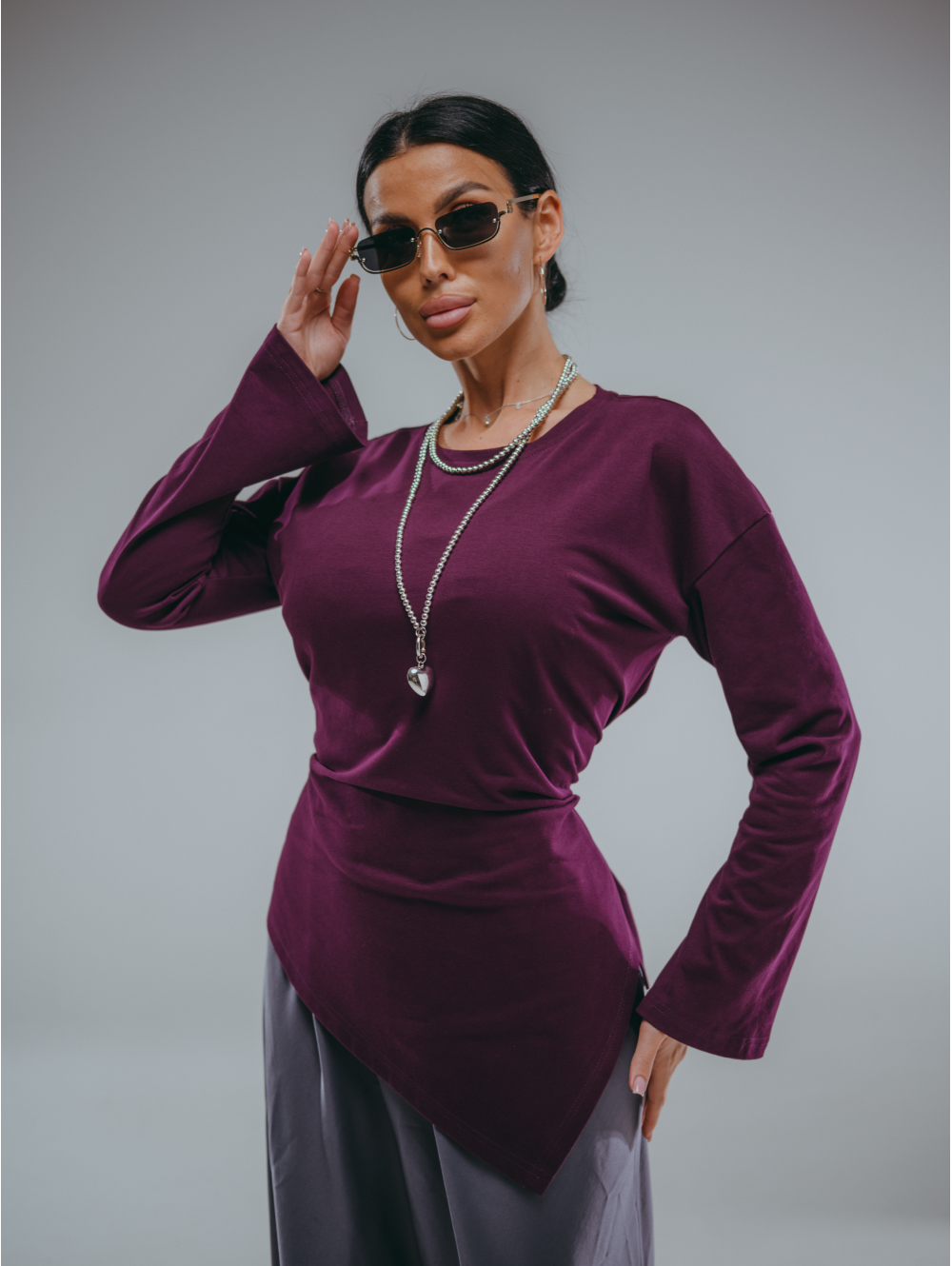 с длинным расклешенным к низу рукавом, низ ассиметричной геометрической формы.