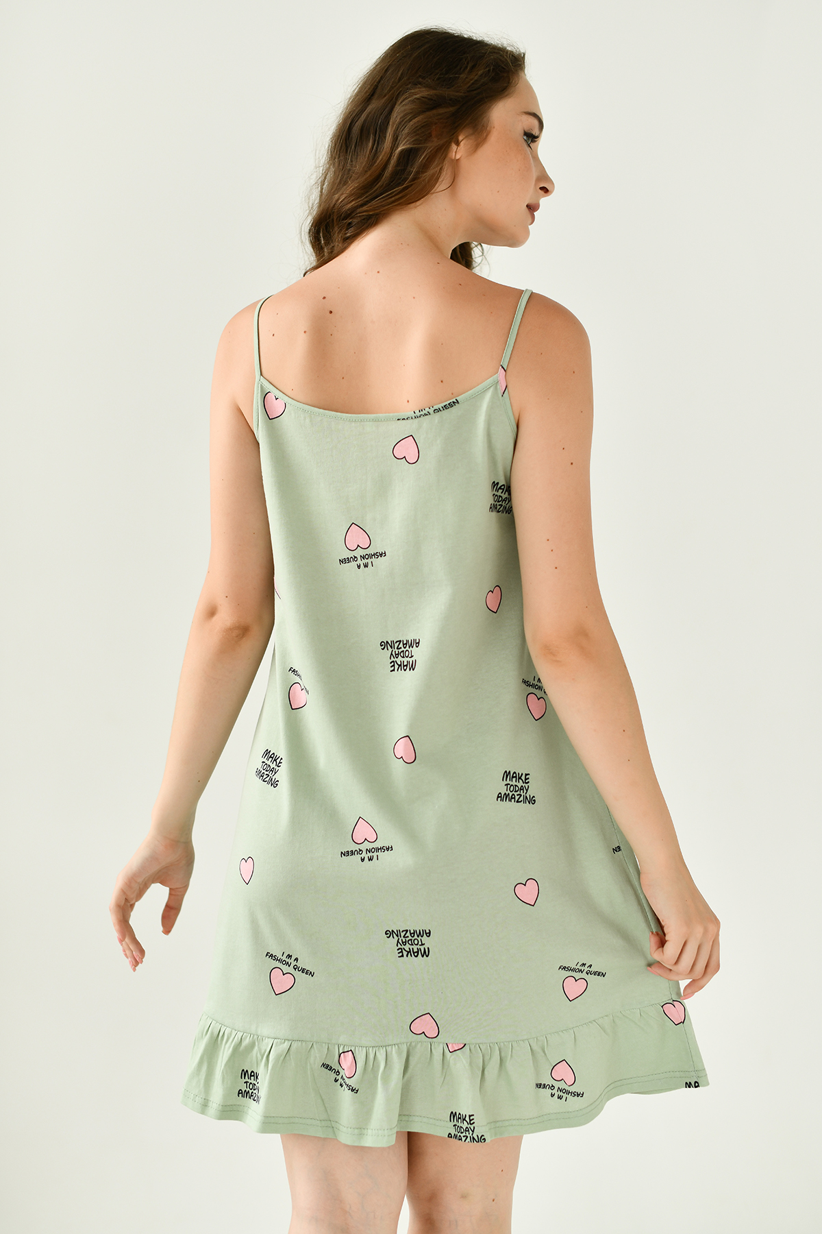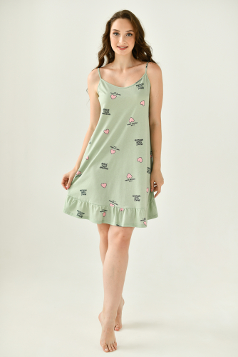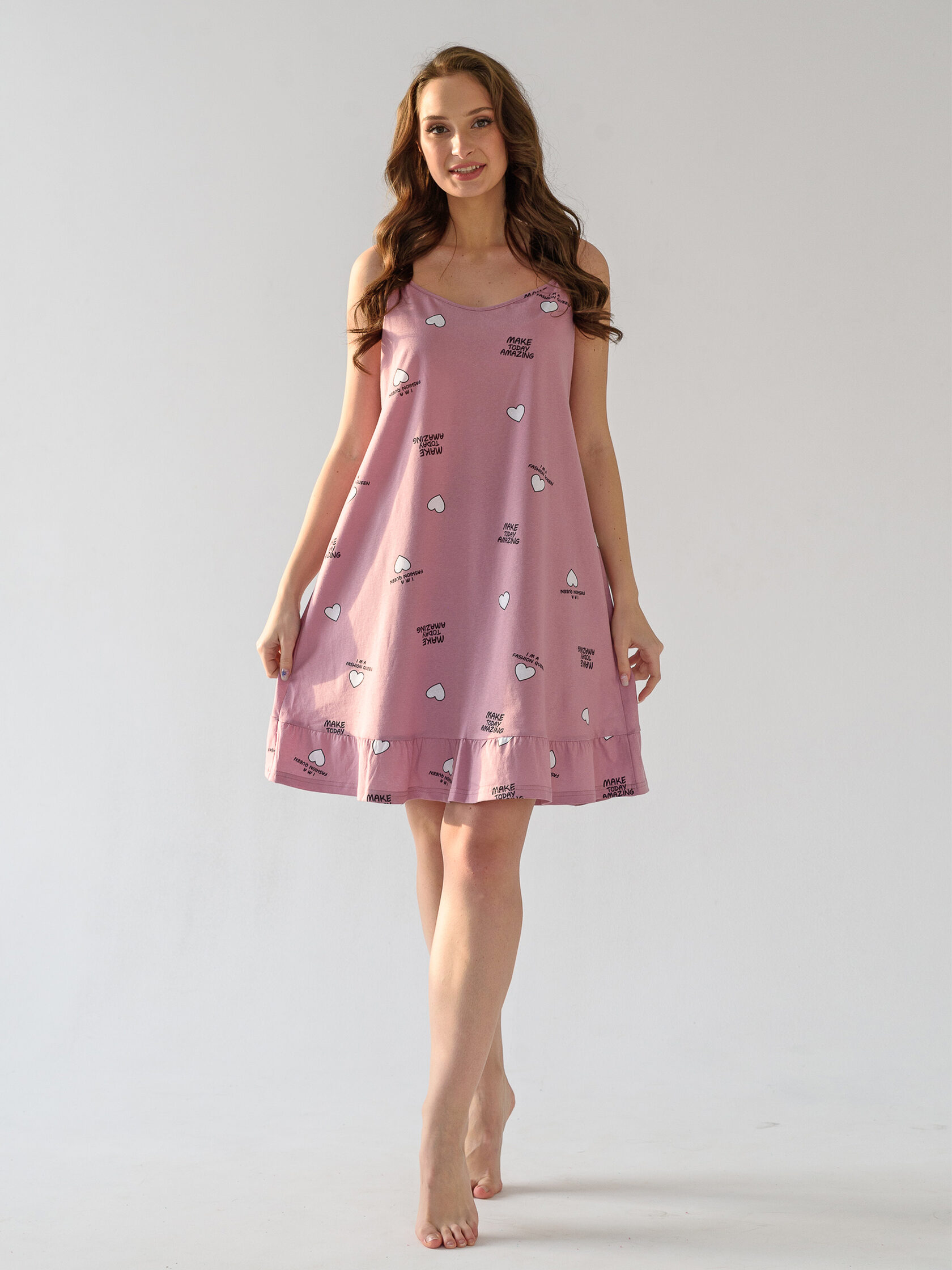 Сорочка женская хлопчатобумажного полотна. Изделие полуприлегающего А -силуэта, длиной немного выше линии колена. Тонкие бретели сорочки и притачной волан по низу изделия, создают волшебный лёгкий и романтичный образ.
