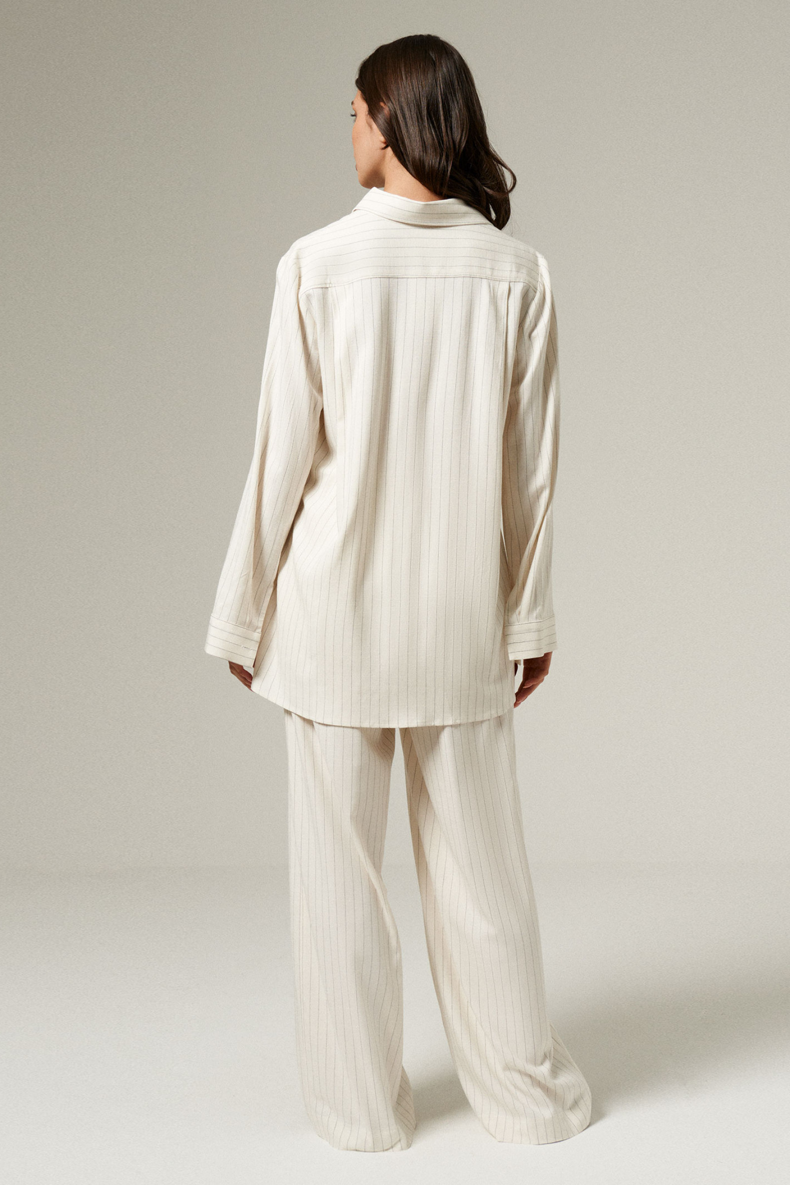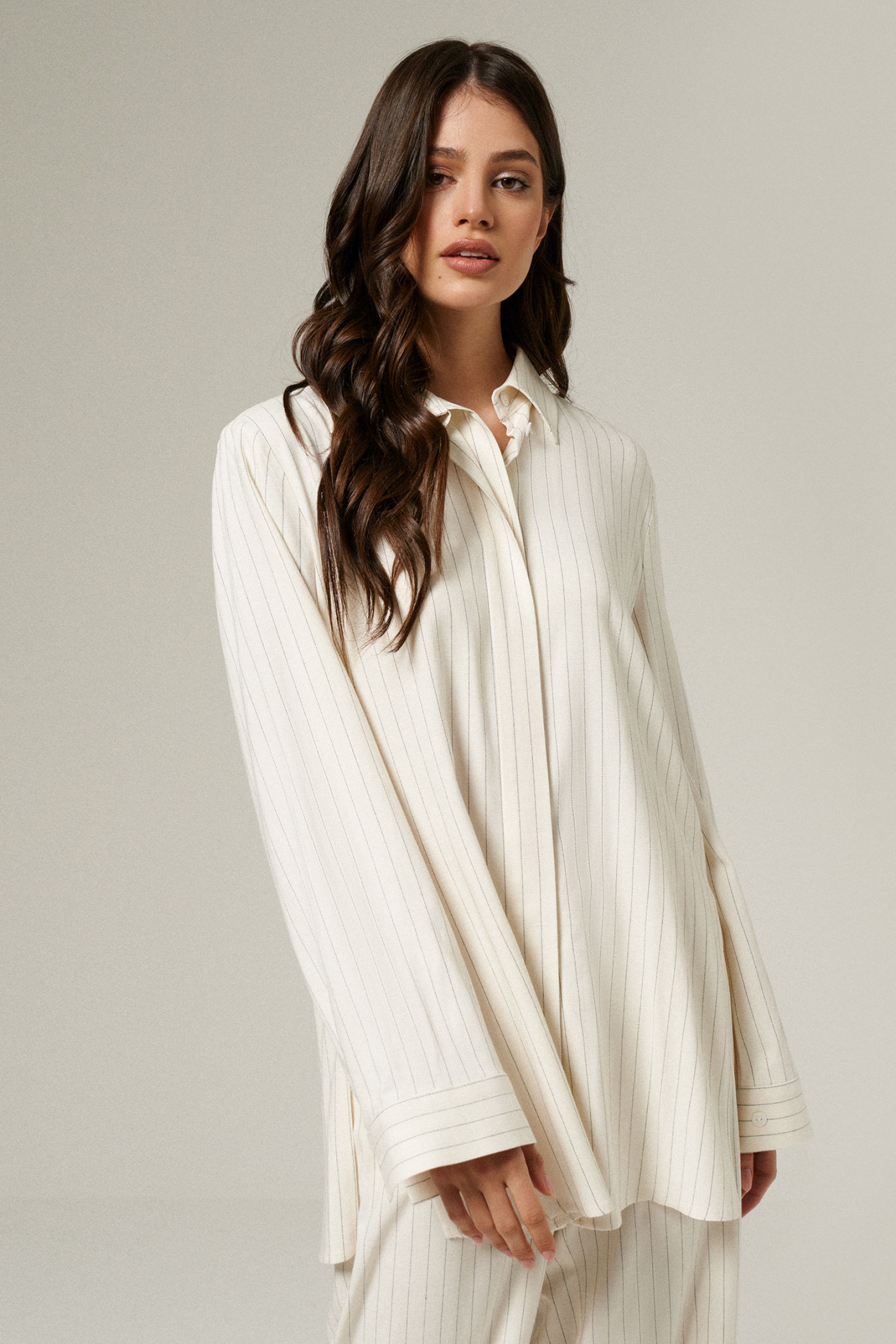 Комплект женский из вискозной ткани для повседневной носки. В комплект входят рубашка и брюки. Рубашка прямого силуэта с фронтальной потайной застежкой на пуговицы, воротником стойкой. В боковых швах разрезы от низа изделия. Длина рубашки классическая. Брюки прямого силуэта на поясе с прорезными карманами в боковых швах. Длина брюк классическая.