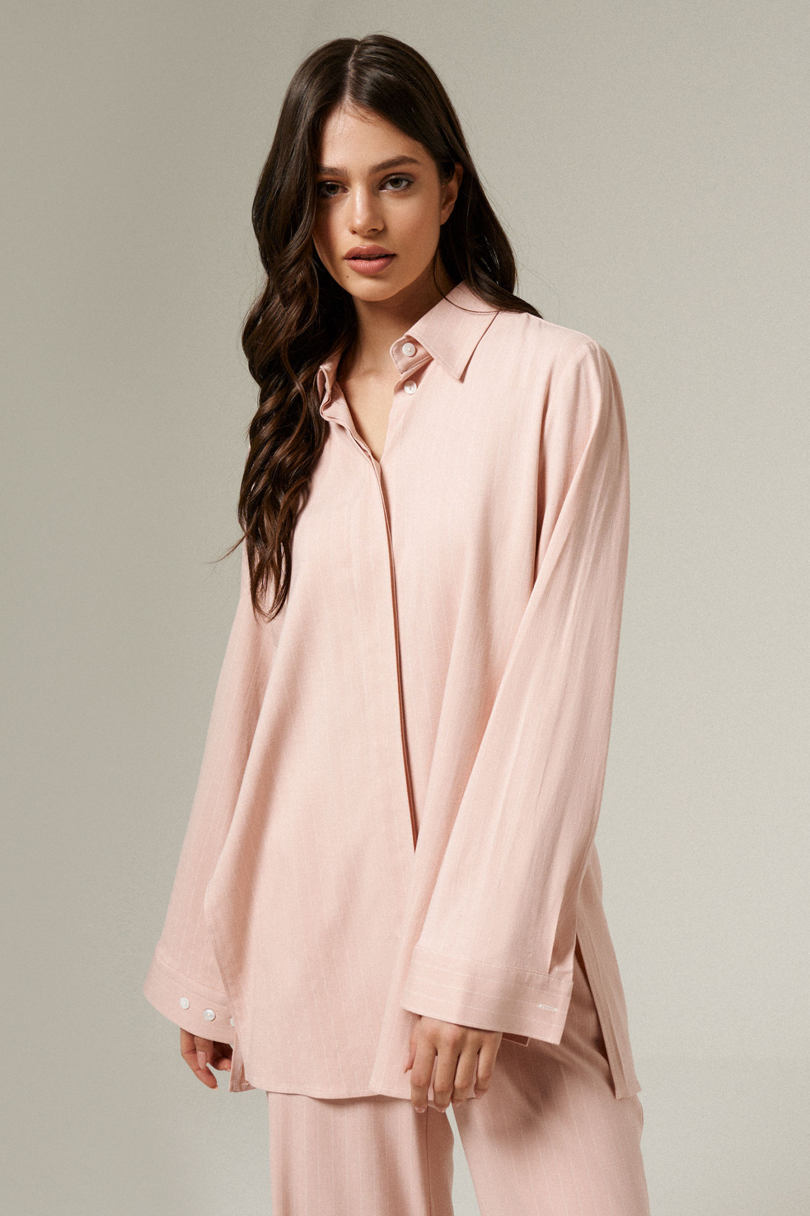 Комплект женский из вискозной ткани для повседневной носки. В комплект входят рубашка и брюки. Рубашка прямого силуэта с фронтальной потайной застежкой на пуговицы, воротником стойкой. В боковых швах разрезы от низа изделия. Длина рубашки классическая. Брюки прямого силуэта на поясе с прорезными карманами в боковых швах. Длина брюк классическая.