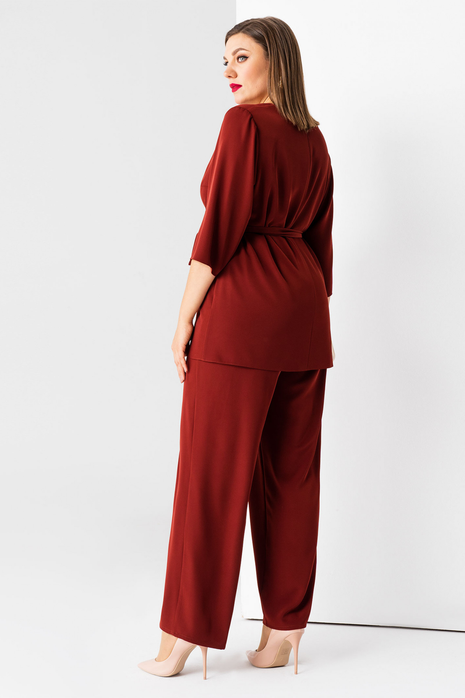 Брючный костюм женский не мнется и хорошо держит форму. Женский брючный костюм большого размера состоит из блузы, брюк и тонкого пояска. Блуза прямого кроя с V-образным вырезом и коротким рукавом делает костюм женский удобным в носке. Тонкий пояс подчеркивает линию талии.