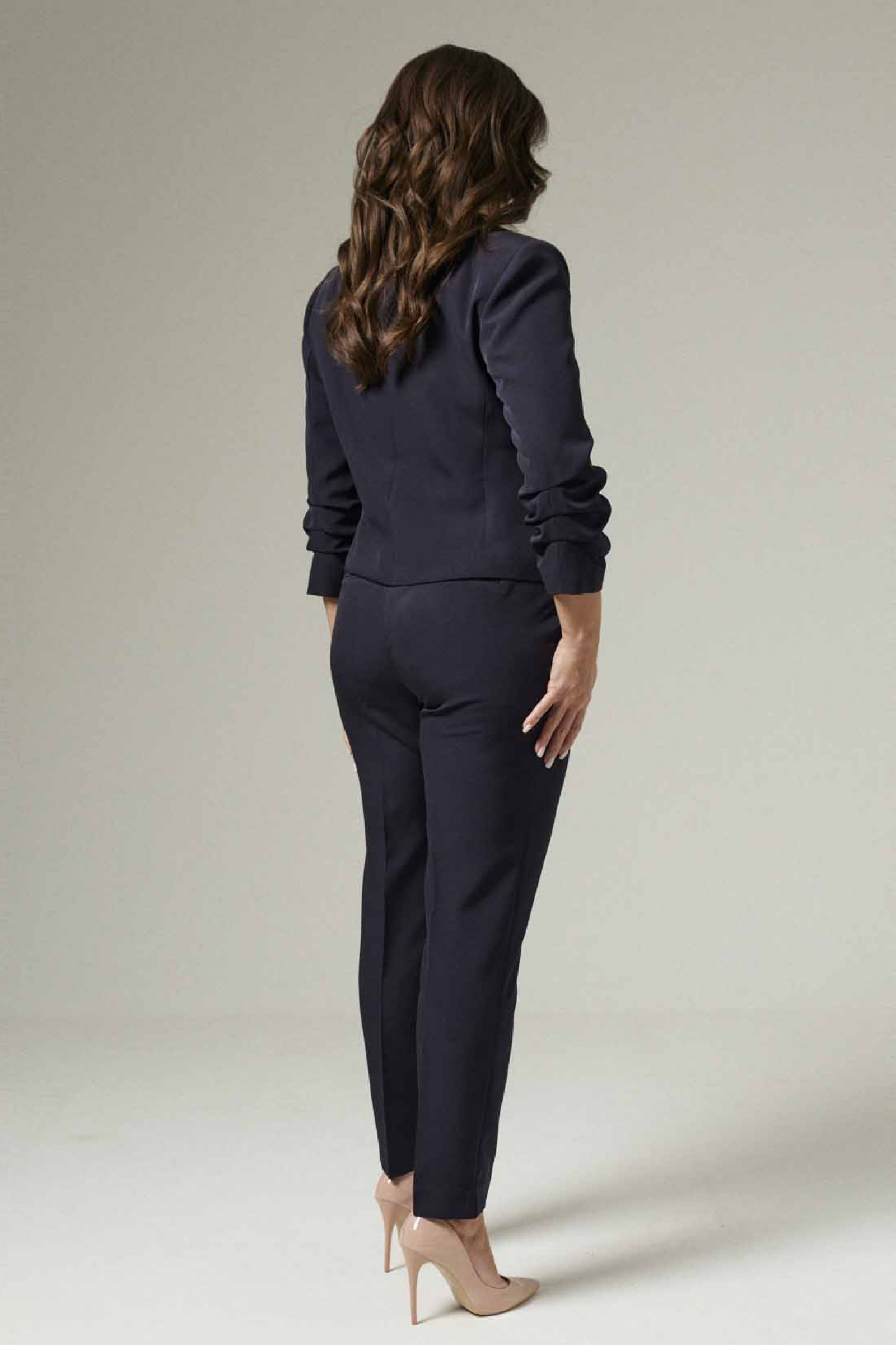 Классический женский костюм с лаконичным дизайном можно сочетать с блузками и рубашками. Укороченный однобортный пиджак без воротника дополнен присборенными рукавами3/4 и прорезными карманами в рамке на полочках. Пиджак приталенного силуэта образует V-образный вырез, когда застегнут на одну пуговицу. Прямые брюки с идеально отутюженными стрелками украшают наклонные карманы и широкий пояс.