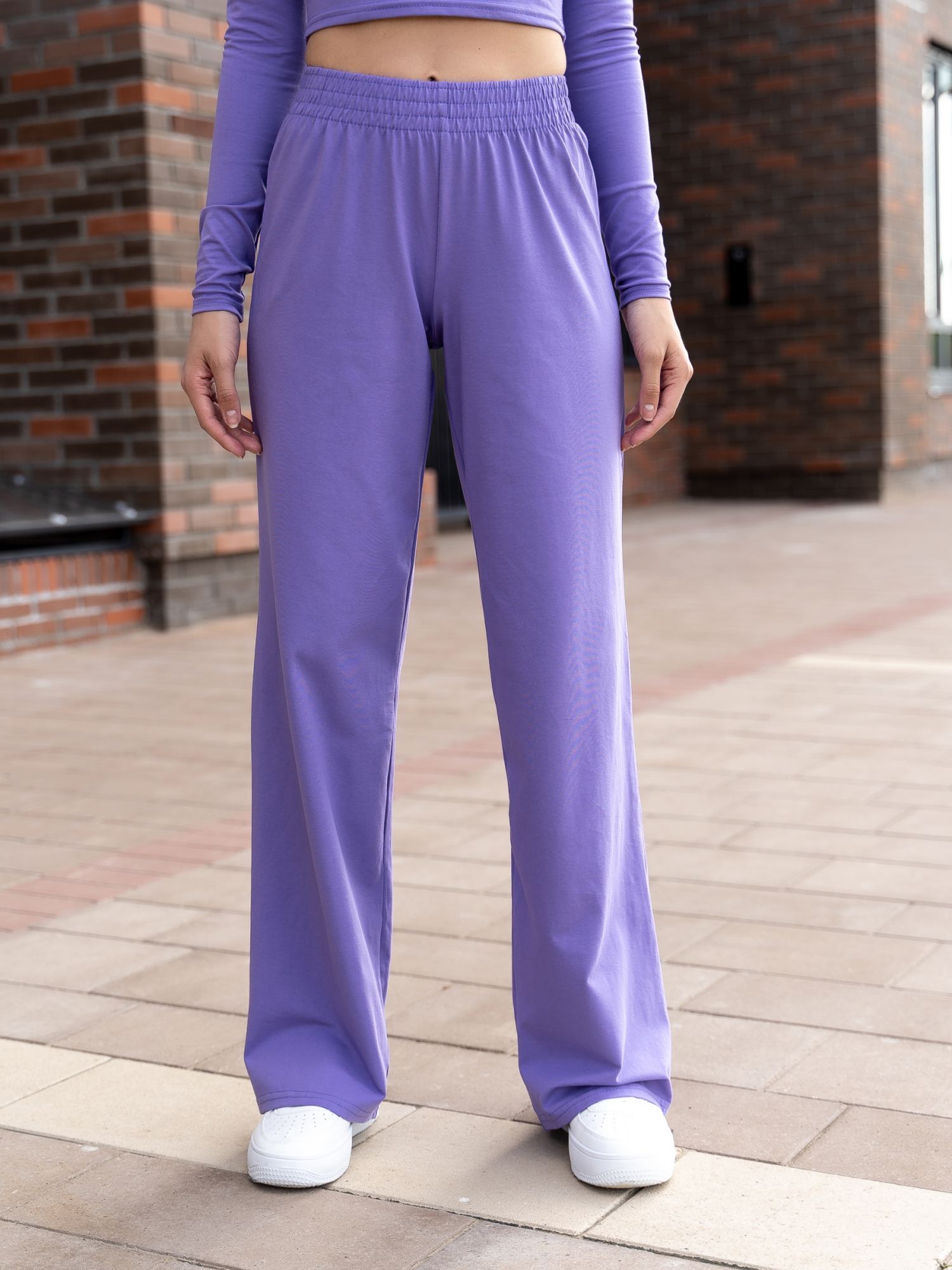 Свободные брюки прямого силуэта из кулирки сиреневого цвета с широким цельнокроенным поясом на резинке. Изделие выполнено из трикотажа премиального качества - ПЕНЬЕ, с содержанием хлопка более 95%