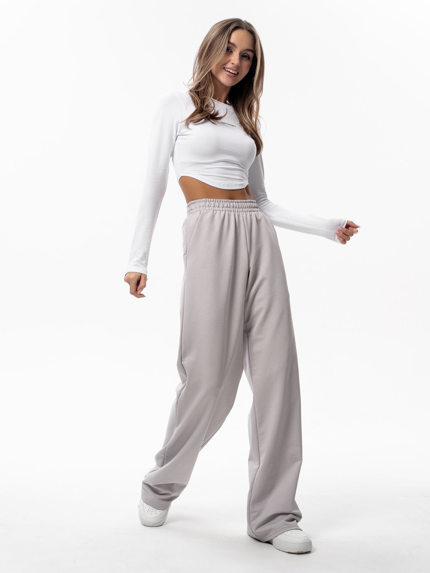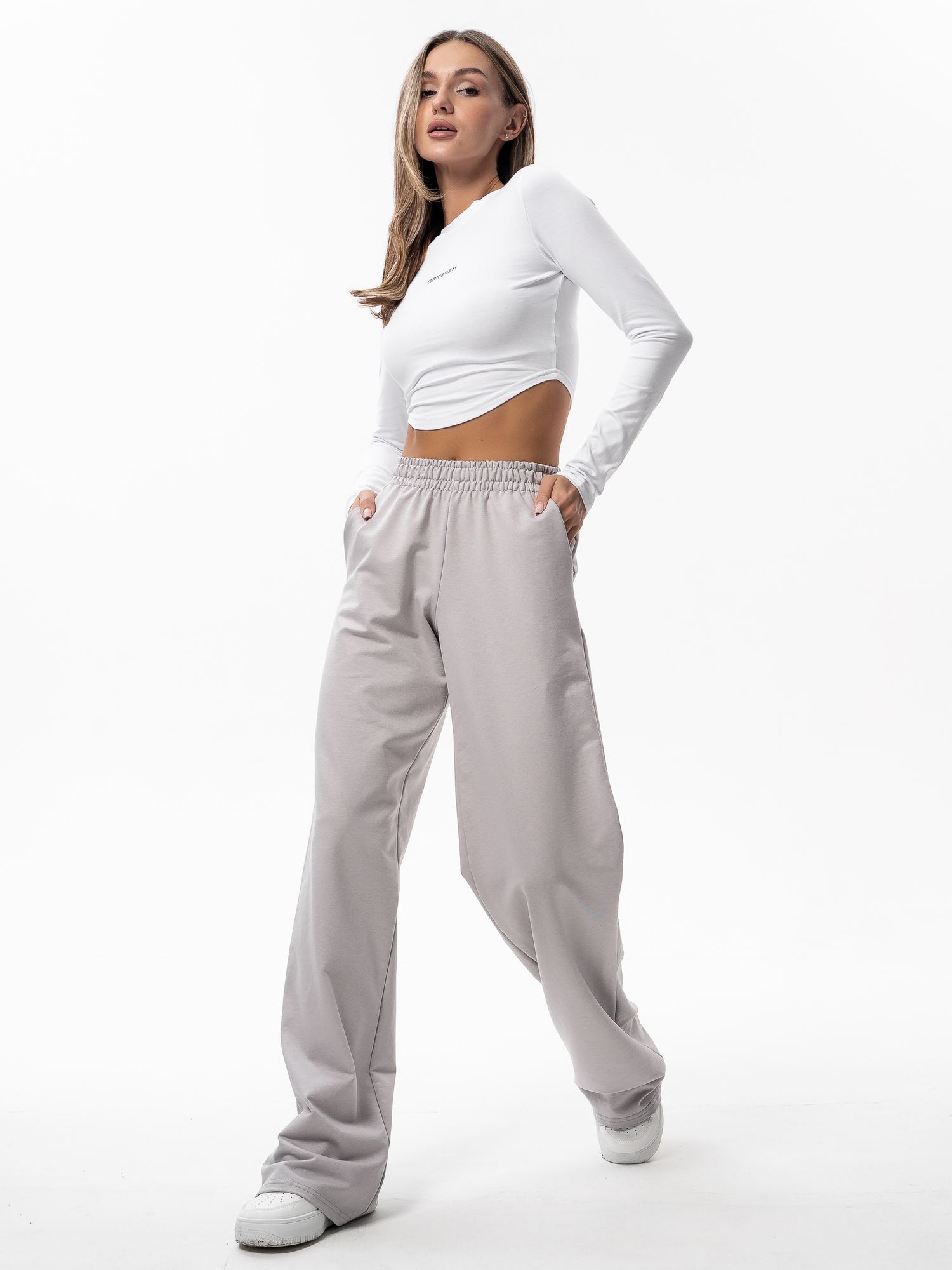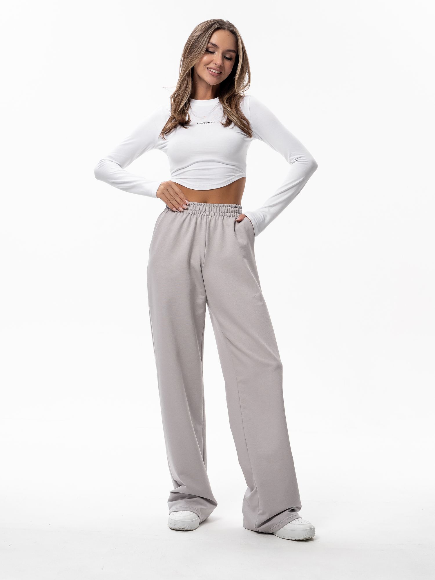 Женские широкие брюки-палаццо из футера серого цвета , с боковыми карманами. Завышенная линия талии, высокий пояс на эластичной резинке. Изделие выполнено из трикотажа премиального качества - ПЕНЬЕ, с содержанием хлопка более 92%