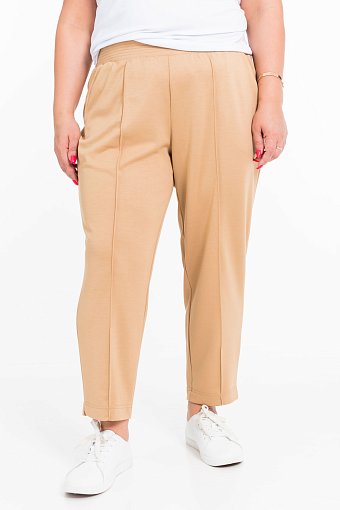Женские брюки из интерлочного полотна выполнены в лаконичном и универсальном стиле. Модель со стрелками подчёркивает аккуратный силуэт и придаёт образу элегантность. Брюки свободного покроя, комфортные в носке, к низу слегка заужены, что делает их современными и практичными. Подходят как для повседневных образов, так и для более деловых комплектов.