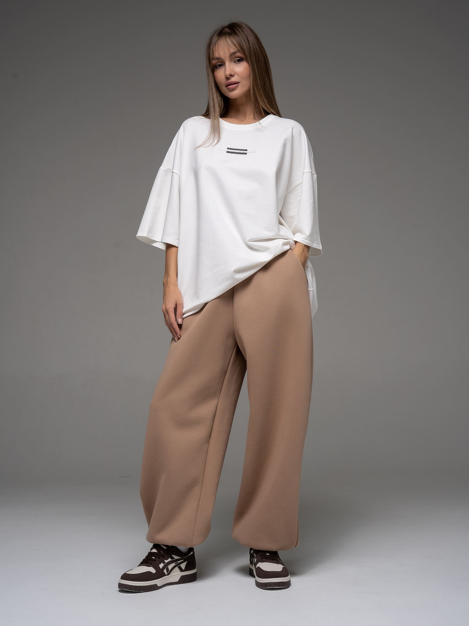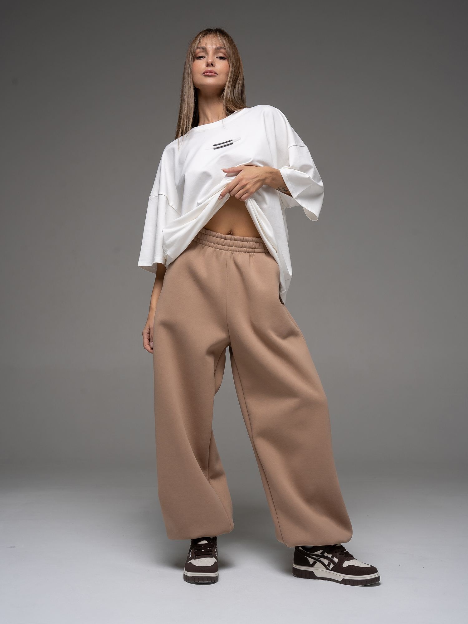 Женские брюки из футера с начесом бежевого цвета свободного силуэта с широким цельнокроенным поясом и боковыми карманами. По низу брюк - резинка. Изделие выполнено из трикотажа премиального качества - ПЕНЬЕ, с содержанием хлопка более 80%