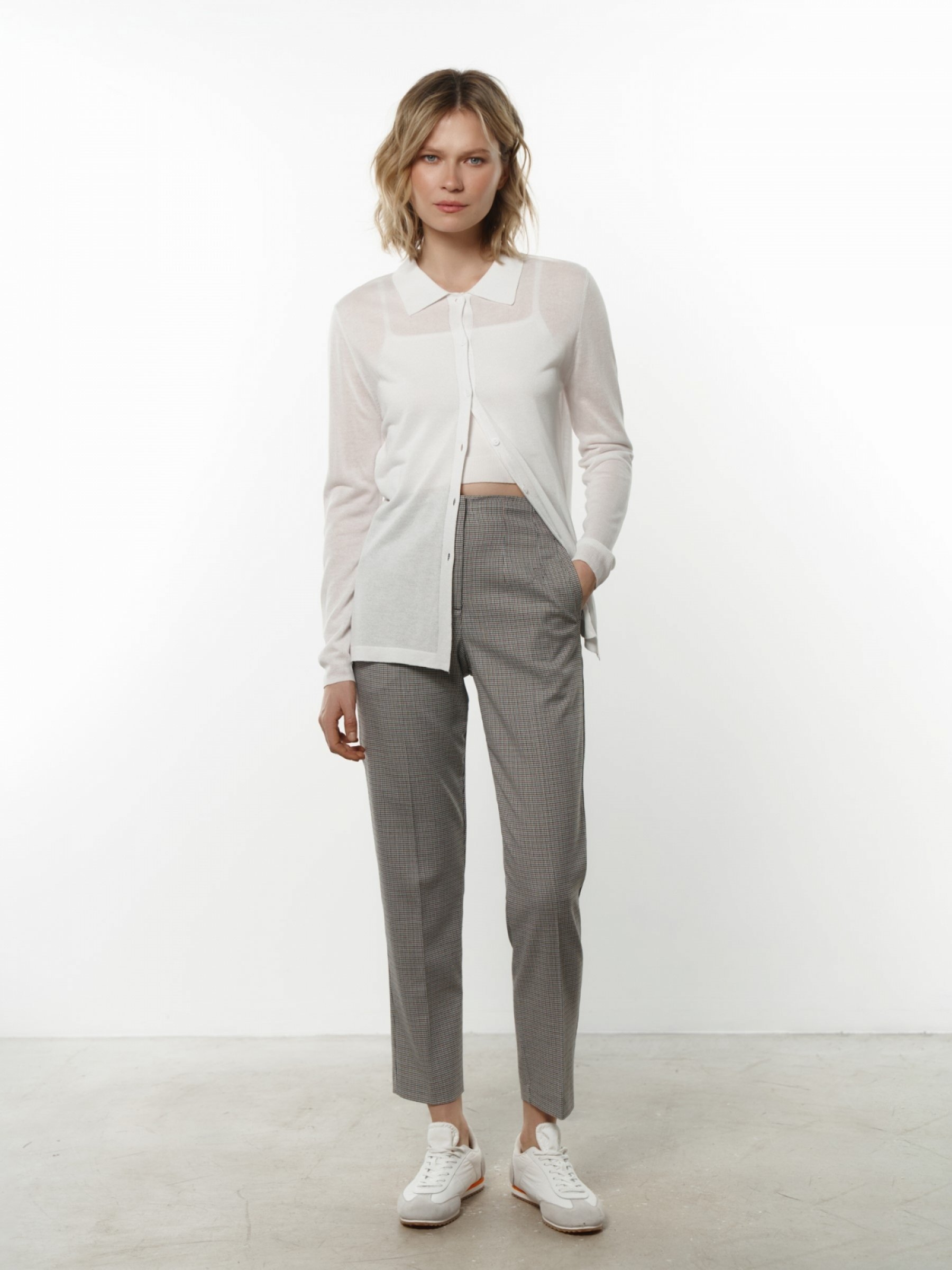 Зауженные к низу брюки с высокой посадкой – элегантные и универсальные. Актуальный принт в мелкую коричнево-синюю клетку делает изделие модным и акцентным. Благодаря неполной длине брюки красиво приоткрывают щиколотки. Модель дополнена стрелками. Резинка в задней части спинки обеспечивает оптимальную посадку. Брюки фиксируются потайной застежкой – нейлоновой молнией, прозрачной пуговицей и металлическим крючком. Модель изготовлена из смесовой износоустойчивой ткани, приятной телу. Два варианта расцветки: коричневый и зеленый. 65% полиэстер, 32% вискоза, 3% спандекс