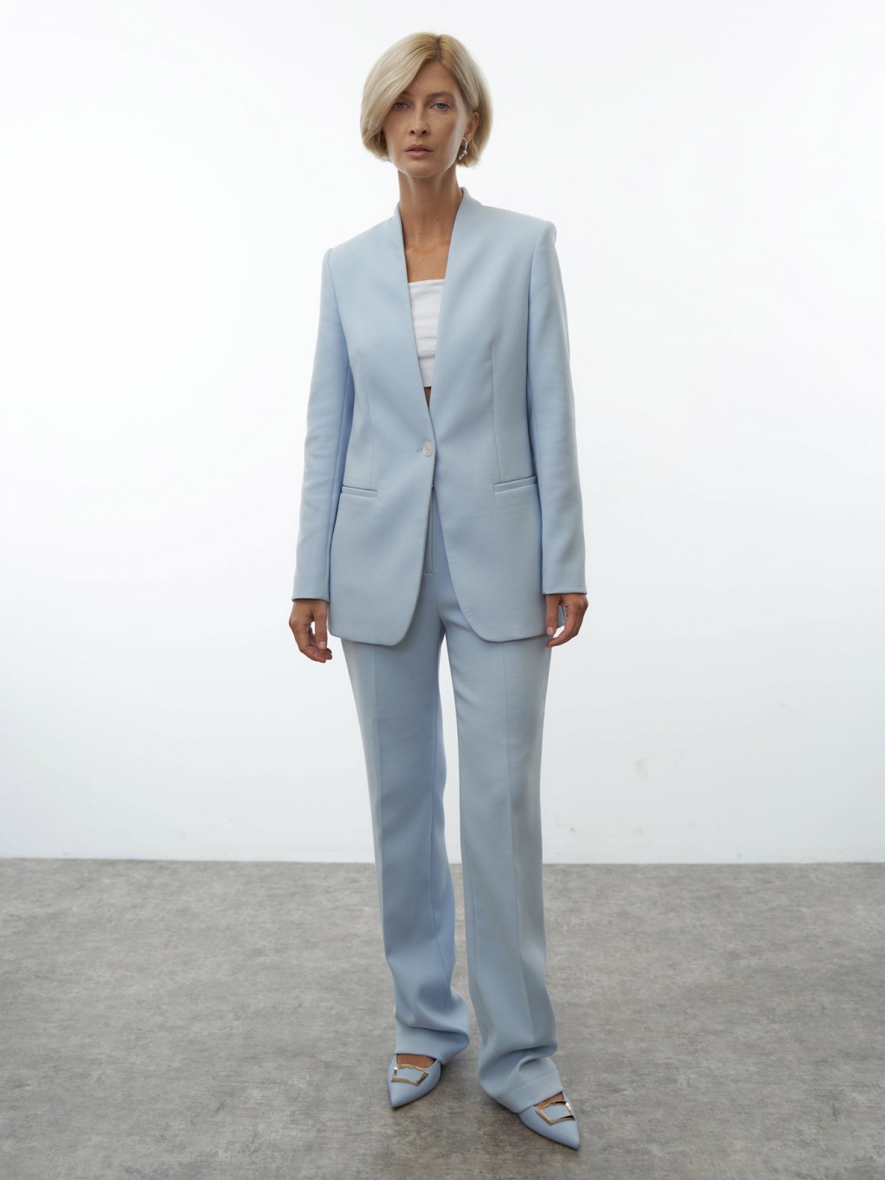Прямые классические брюки полной длины со стрелками – незаменимая вещь женского гардероба. Рекомендуем носить в паре с жакетом (с воротником-стойкой) из весенне-летней коллекции CONSO. Благодаря высокой посадке брюки зрительно вытягивают силуэт и подчеркивают стройность ног. Выполнены из мягкой и при этом плотной смесовой ткани, отлично сохраняющей форму. Дополнены тканевым отрезным поясом, удобными боковыми карманами и шлевками под ремень. Застегиваются на металлический крючок и нейлоновую молнию. Два универсальных цвета: голубой, бежевый. 63% полиэстер, 32% вискоза, 5% эластан