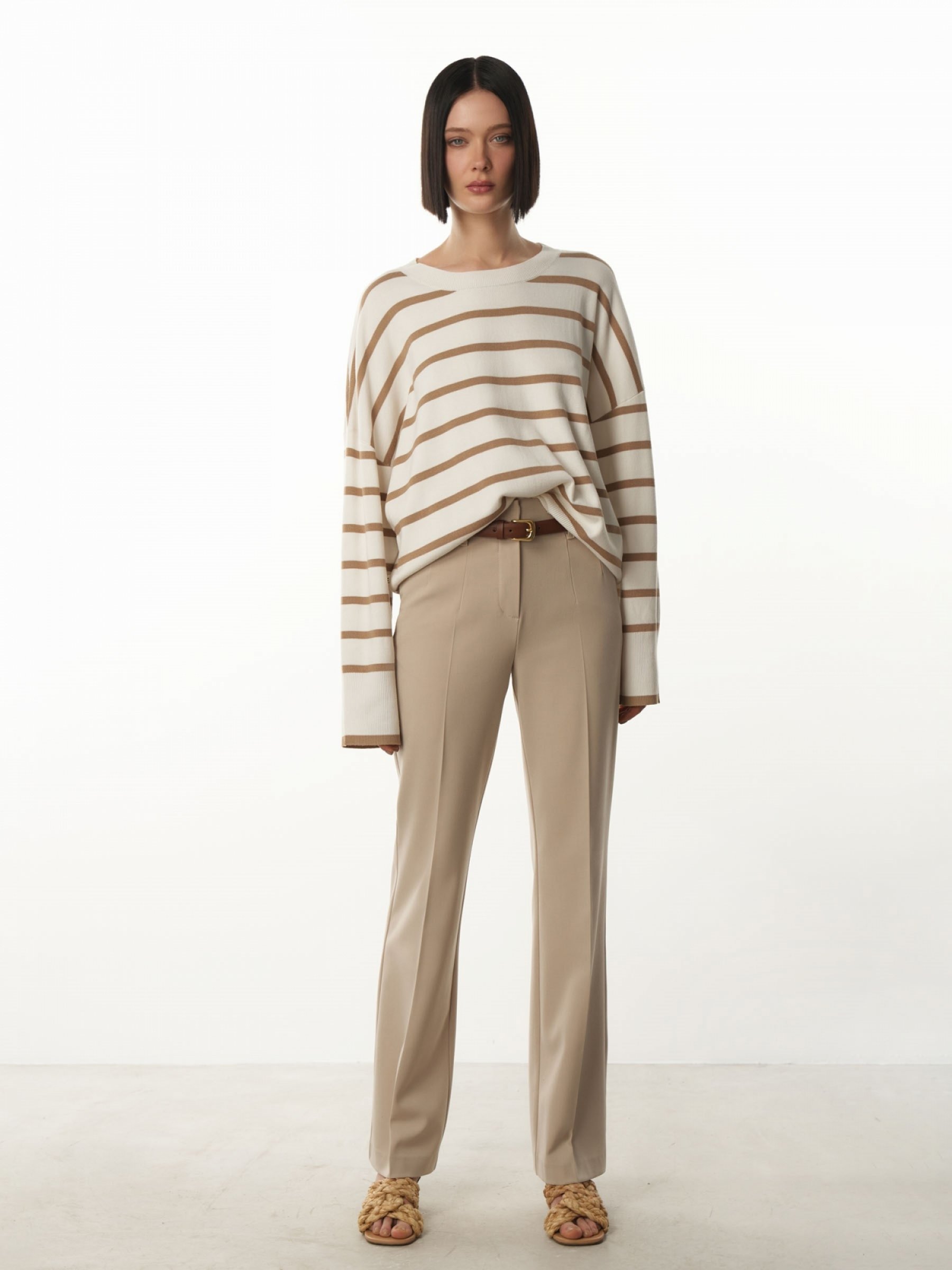 Расклешенные брюки c высокой посадкой со стрелками – лаконичные и стильные. За счет высокой талии и стрелок подчеркивают фигуру и визуально удлиняют силуэт. Данная модель с отрезным поясом, застегивается на потайную молнию, пуговицу и застежку-крючк. Дополнена шлевками под ремень и удобными боковыми карманами. Брюки изготовлены из прочной износоустойчивой смесовой ткани, приятной к телу. Три универсальных цвета под любой образ и настроение: бежевый, коричневый, черный. 63% полиэстер 32% район 5% спадекс