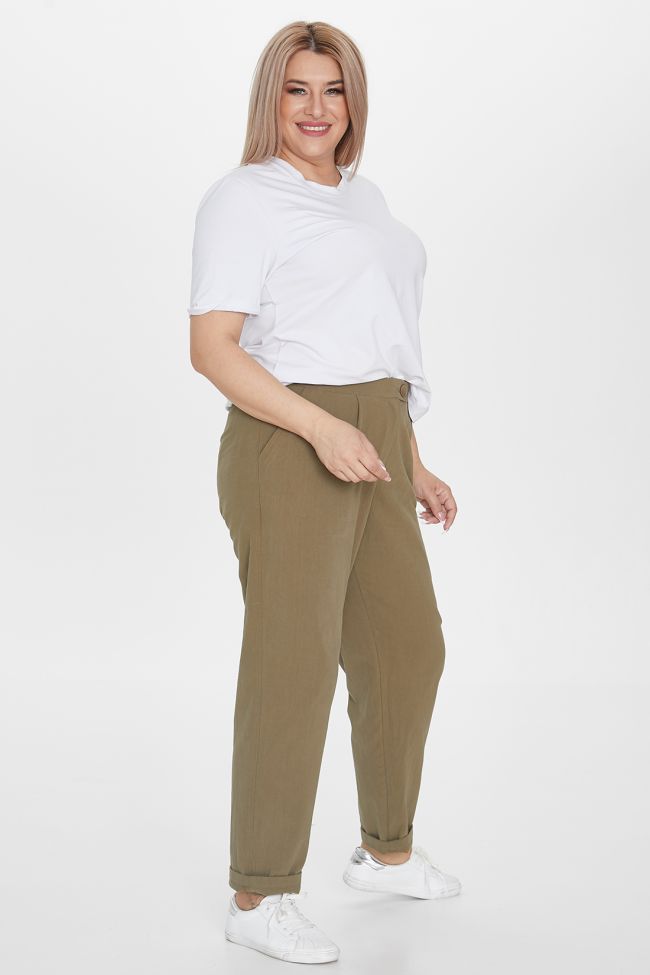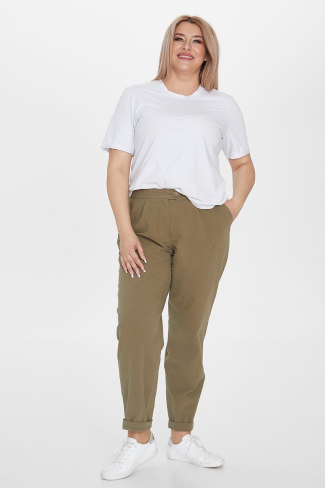 зеленый Эффектные брюки "чинос" свободного силуэта укороченной длины. Выполнены из хлопковой ткани с добавлением эластана. Модель с комфортной высокой посадкой и комбинированным поясом, с застежкой на тесьму-молнию и пуговицу. По переду удобные наклонные карманы с листочкой. Модель составит гармоничный комплект с однотонными и принтованными топами и блузами. Отличный вариант для стильного повседневного гардероба.