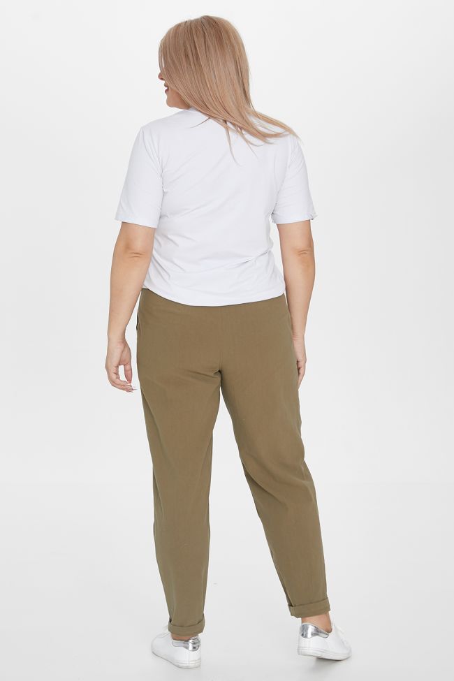 зеленый Эффектные брюки "чинос" свободного силуэта укороченной длины. Выполнены из хлопковой ткани с добавлением эластана. Модель с комфортной высокой посадкой и комбинированным поясом, с застежкой на тесьму-молнию и пуговицу. По переду удобные наклонные карманы с листочкой. Модель составит гармоничный комплект с однотонными и принтованными топами и блузами. Отличный вариант для стильного повседневного гардероба.