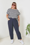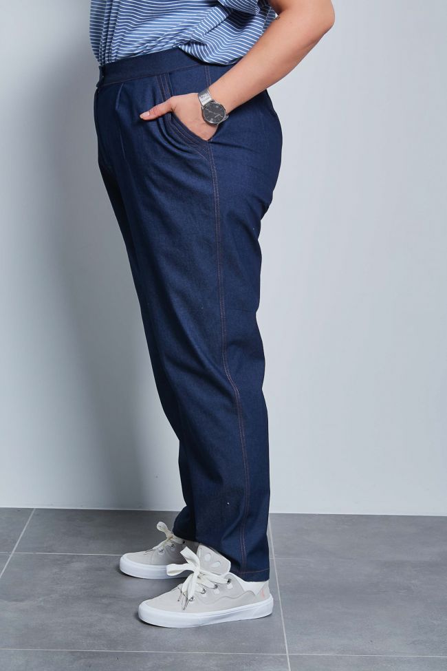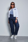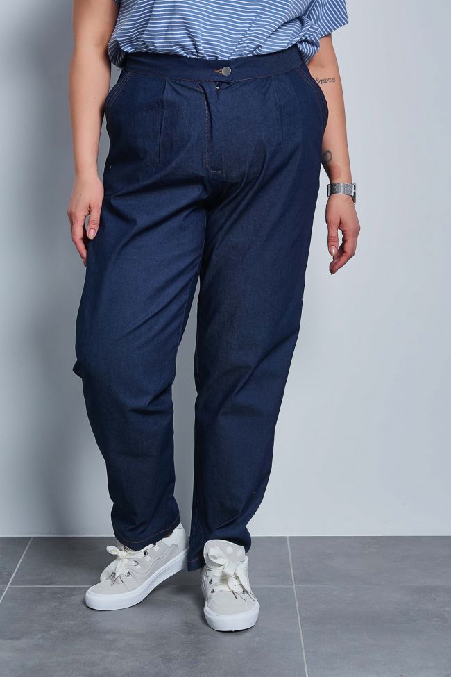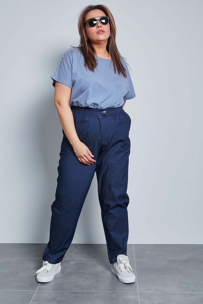 темно-синий Эффектные брюки "чинос", свободного силуэта, с наклонными карманами по бокам и складками по талии. Выполнены из джинсовой ткани. Модель с комфортной высокой посадкой и комбинированным поясом,  застежка - гульфик на молнию и пуговицу. Модель составит гармоничный комплект с однотонными и принтованными топами и блузами. Отличный вариант для стильного повседневного гардероба. Как и любые, джинсы перед первой ноской рекомендуем постирать.