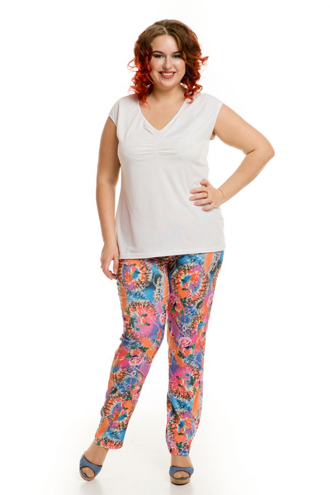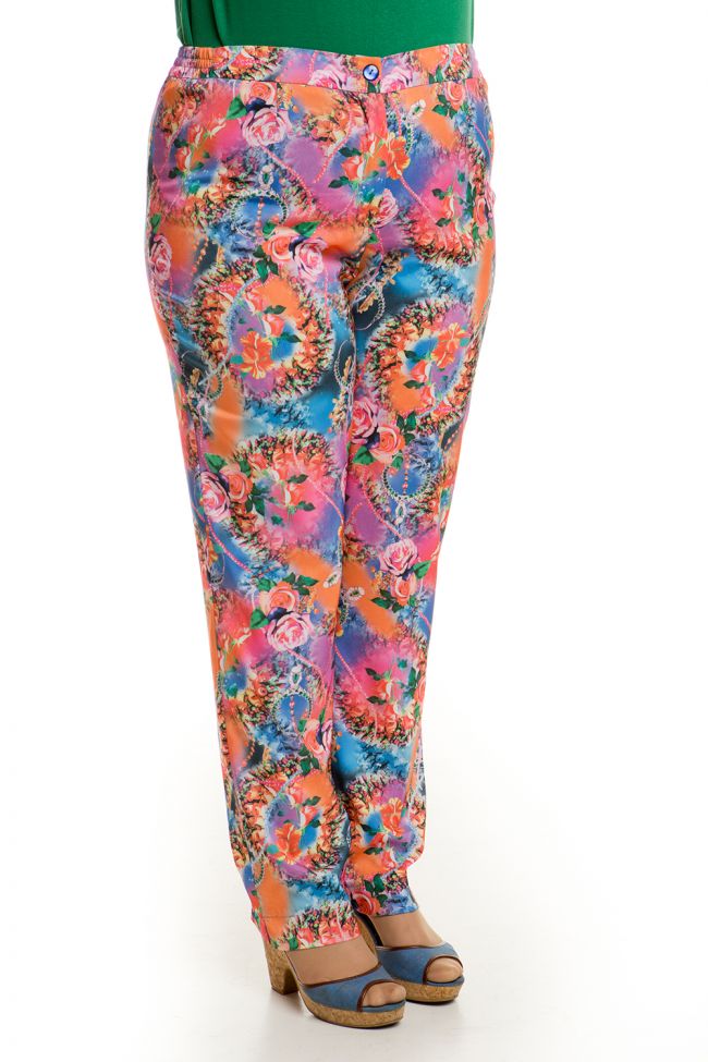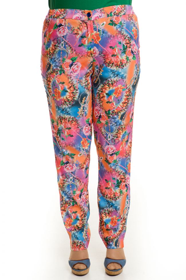цветной принт Комфортные брюки полуприлегающего силуэта из костюмной ткани с принтом. Модель с комфортной средней посадкой на талии. Верх с эластичным поясом, дополненным резинкой по бокам. Центр переда с застежкой на петли и пуговицы. Зауженный низ с аккуратными разрезами в боковых швах. Брюки подчеркнут Ваше безупречное чувство стиля. Замечательный выбор на каждый день.