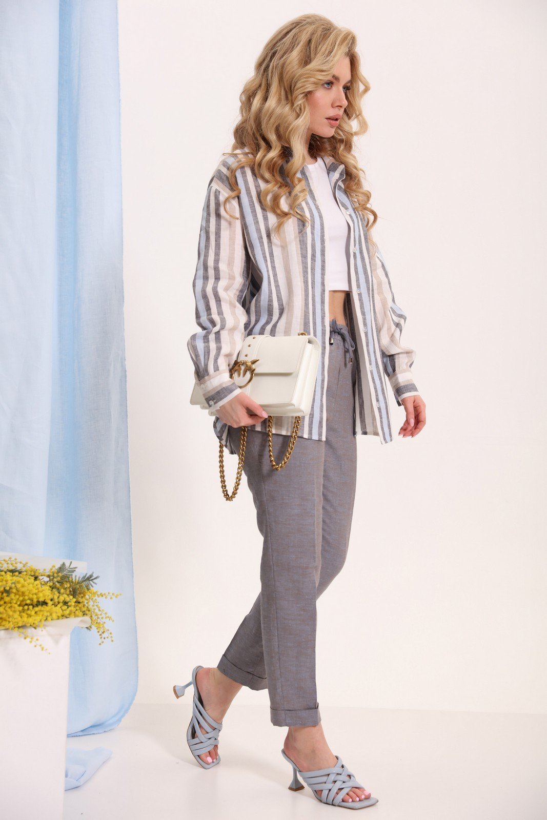 Удобные повседневные брюки из лёгкой натуральной ткани. Брюки свободного прилегания по бедрам и зауженные к низу. Пояс на эластичной тесьме с кулисой и втянутым шнурком. Вход в карман фигурный, наклонный к боковому шву.