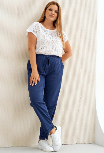 Брюки в стиле карго, выполнены из эко кожи. Брюки прилегающие в области бедер и свободные в колене и по низу. По передним половинкам обработаны накладные карманы и застежка на молнию в среднем шве. По задним половинкам обработаны талиевые вытачки. Брюки на притачном поясе с эластичной тесьмой и застежкой на петли и пуговицы спереди по центру. По поясу брюк обработаны шлевки для ремня. По низу брюк настрочена шлевка, через которую продет хлястик с застежкой на полукольца.