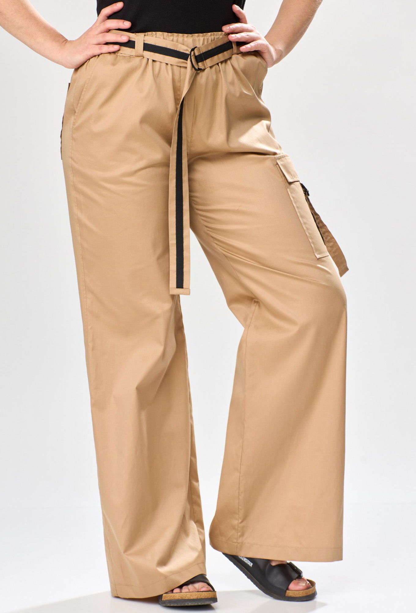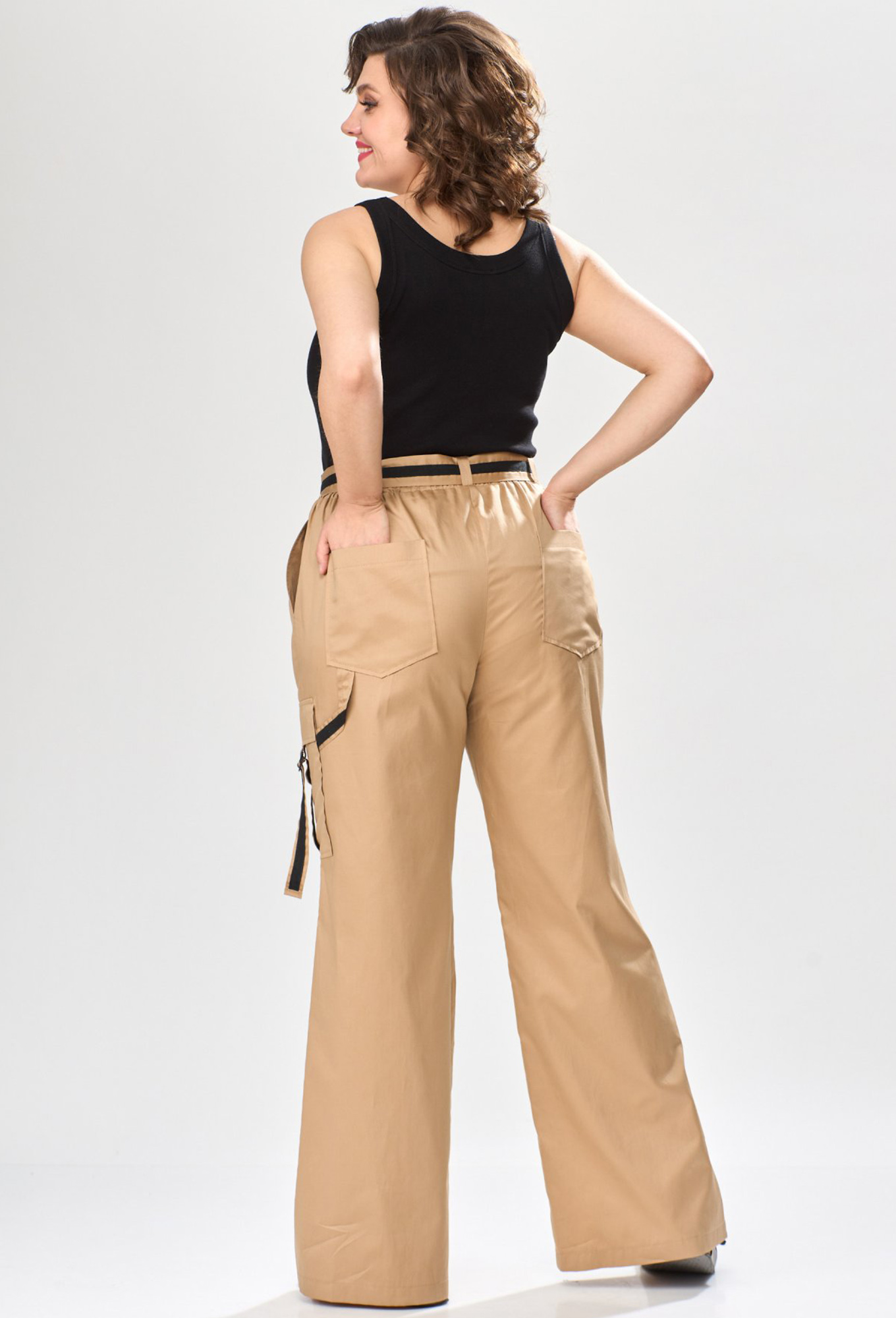 Брюки в стиле “карго” выполнены из однотонной ткани. По передним половинкам выполнены наклонные карманы. По левой передней половинке выполнен накладной карман с клапаном и хлястиком с декоративной тесьмой и застежкой на полукольца. По задним половинкам выполнены накладные карманы. Брюки на притачном поясе с эластичной тесьмой и настроченными шлевками, через которые продет пояс-ремень с застежкой на полукольца.