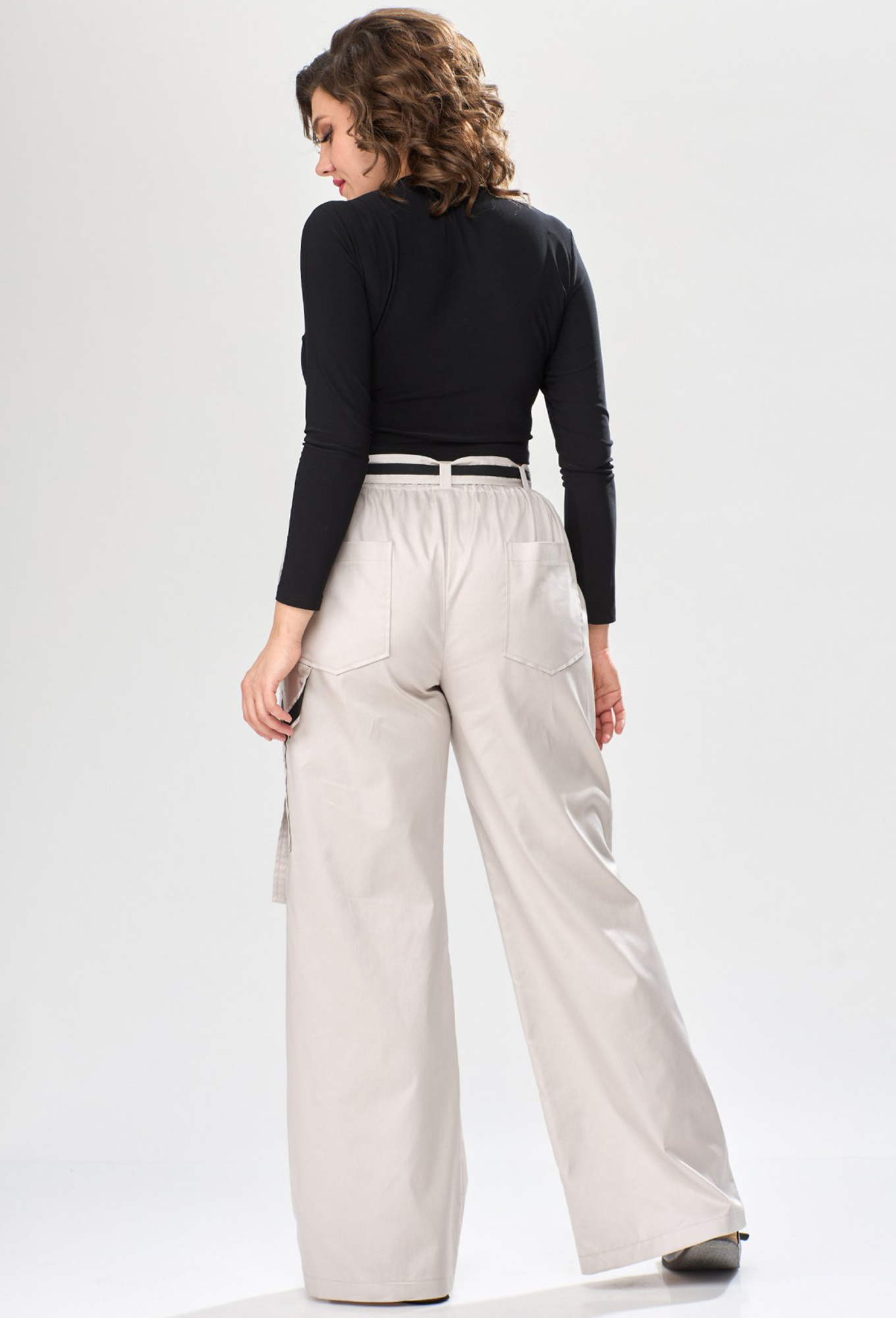 Брюки в стиле “карго” выполнены из однотонной ткани. По передним половинкам выполнены наклонные карманы. По левой передней половинке выполнен накладной карман с клапаном и хлястиком с декоративной тесьмой и застежкой на полукольца. По задним половинкам выполнены накладные карманы. Брюки на притачном поясе с эластичной тесьмой и настроченными шлевками, через которые продет пояс-ремень с застежкой на полукольца.