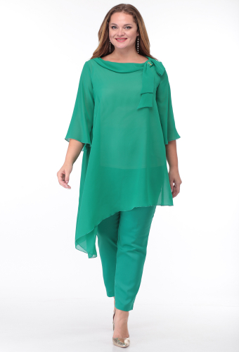 Брюки со стрелками. В области бедер брюки прилегающие, свободные в колене и зауженные книзу. По передним половинкам обработаны карманы и в среднем шве застёжка на молнию. По задним половинкам талиевые вытачки. Брюки на притачном поясе с эластичной тесьмой и застёжкой на петлю и пуговицу.