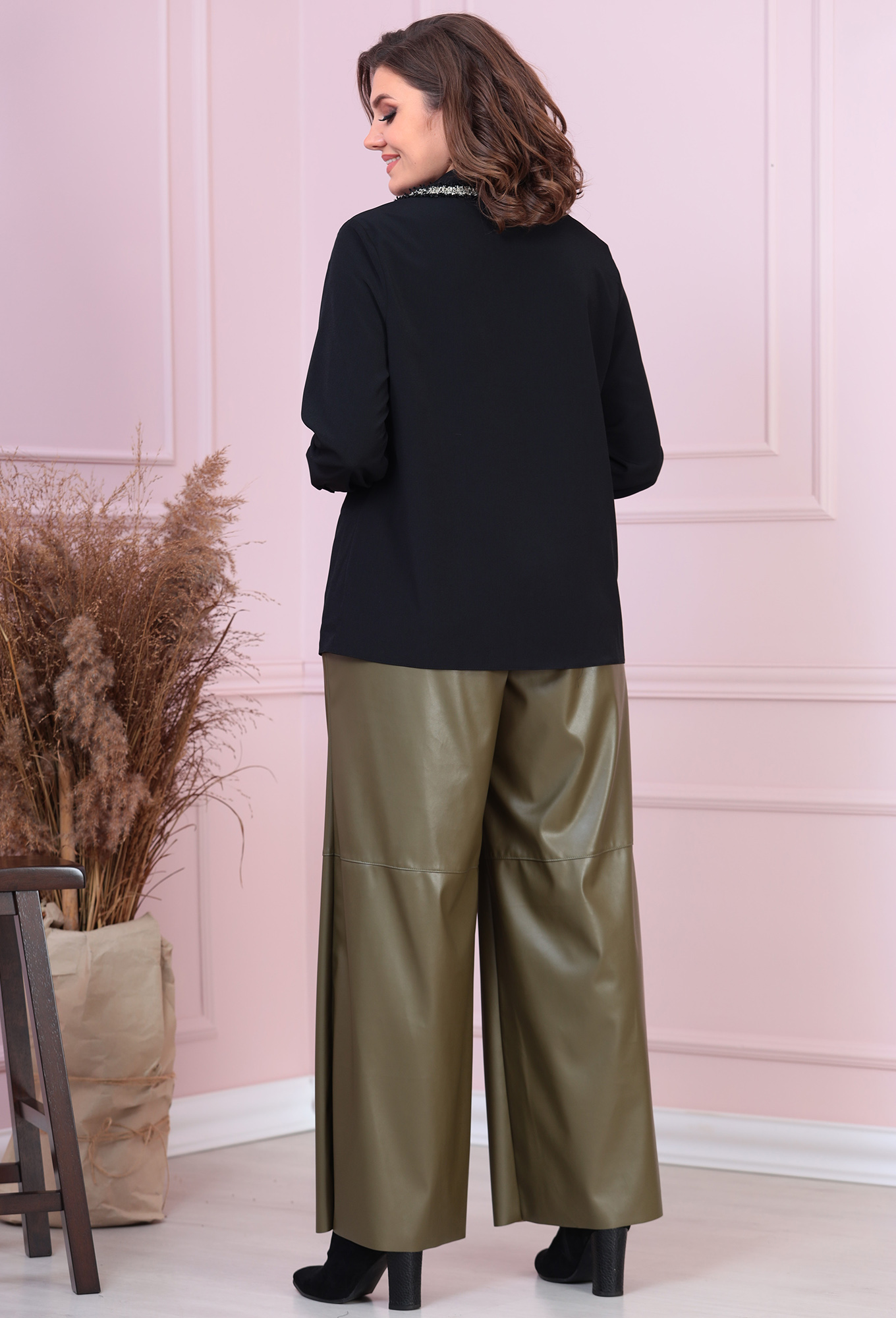 Брюки выполнены из кожи. Брюки с завышенной талией, прямые, широкие. По передним половинкам в области талии выполнены складки, карманы и по среднему шву застежка на молнию. По центру передней половинки по линии талии выполнен декоративный элемент в виде пояса с карабином. Задняя часть брюк по талии на резинке.