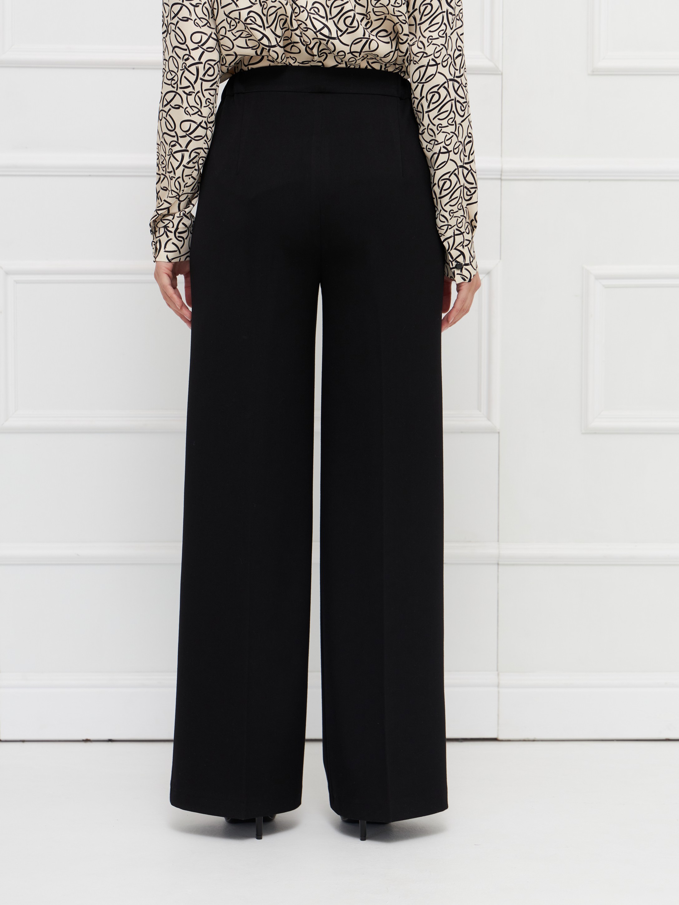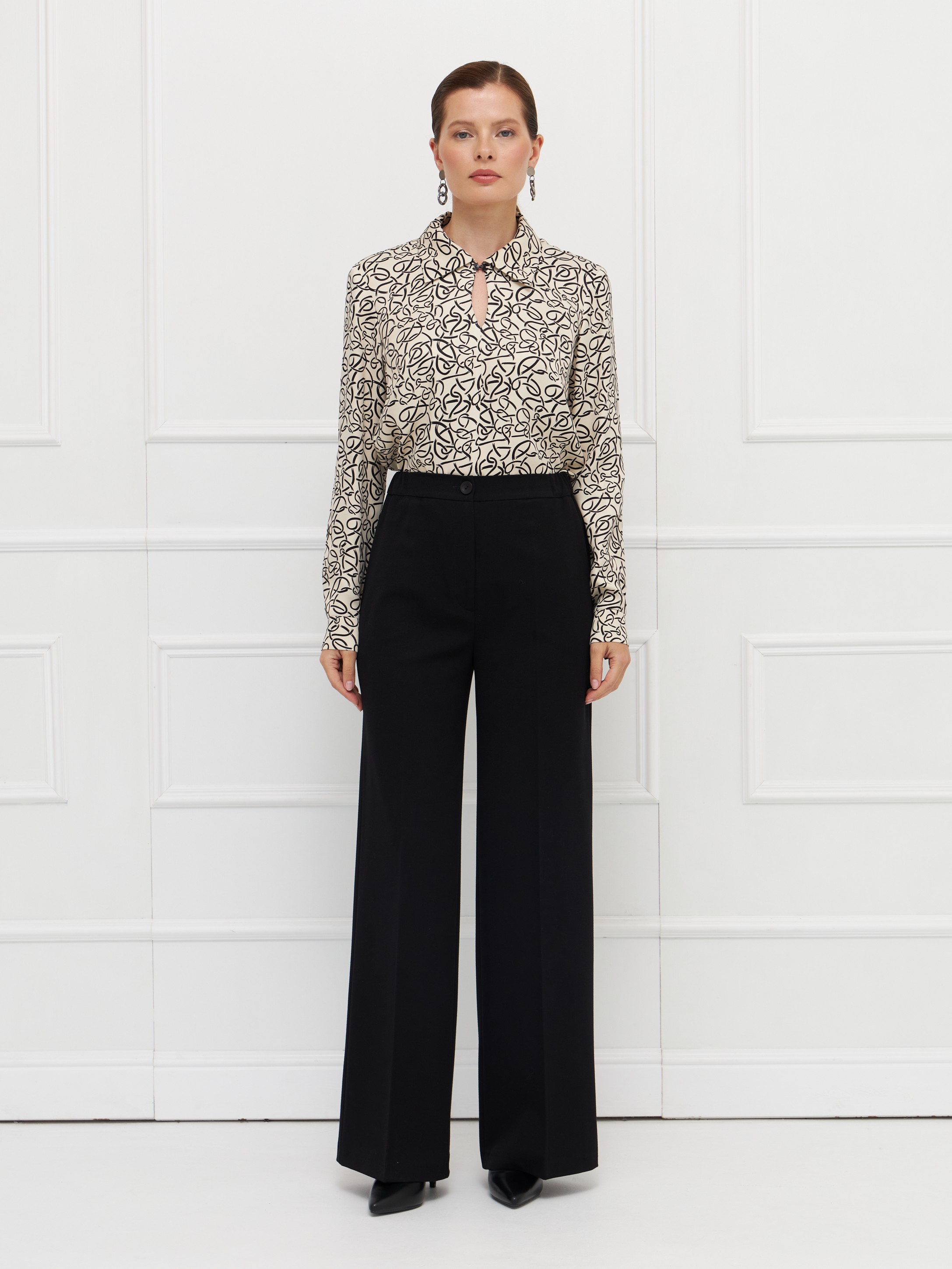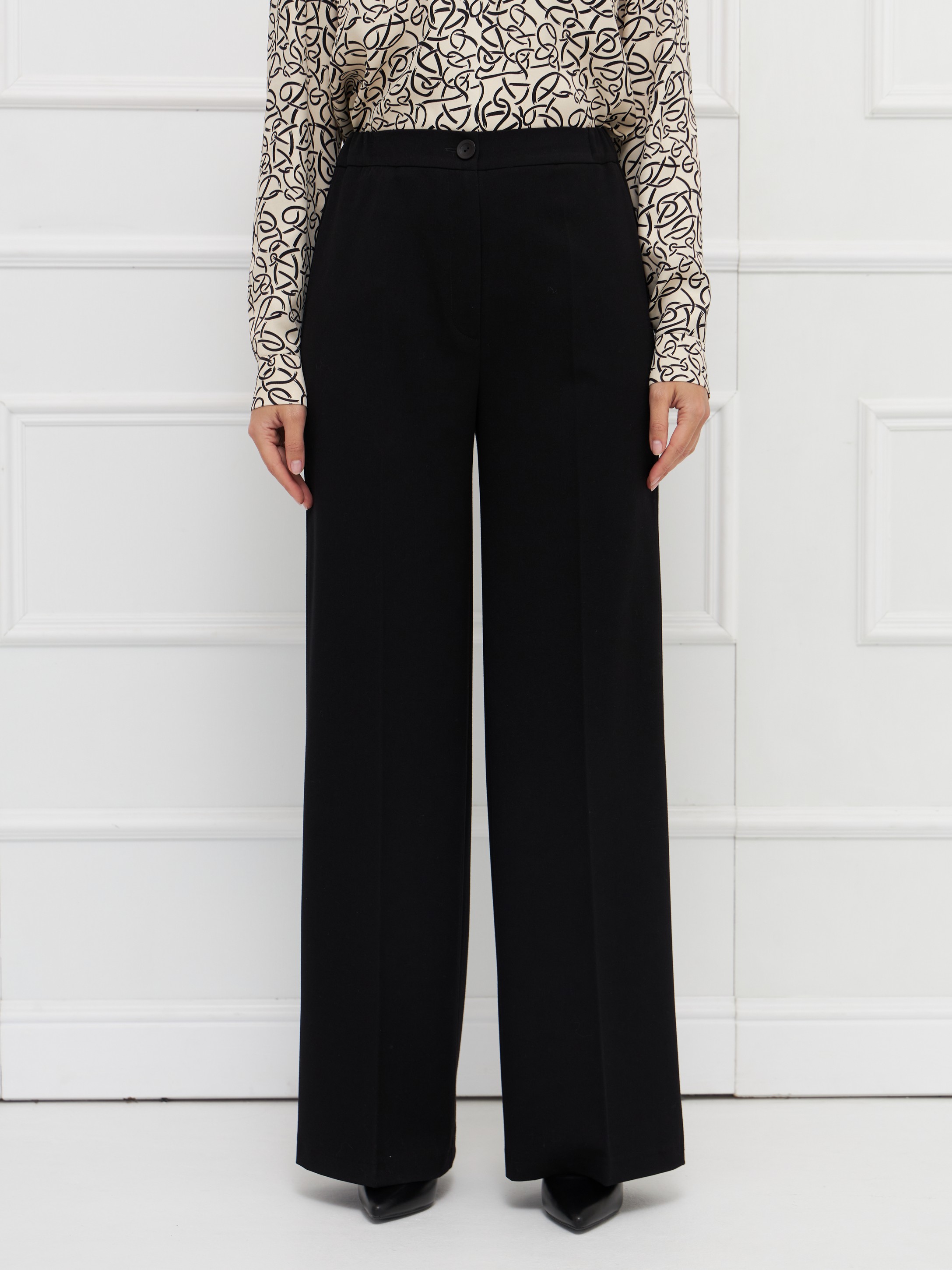 Черный брюки с высокой посадкой выполнены из мягкого поливискозного костюмного материала, который держит форму и не мнется. Расклешение от бедра формирует вытянутый, сбалансированный силуэт. Вытачки сзади обеспечивают точную посадку по фигуре. Стрелки добавляют строгости и визуально удлиняют ноги. Застежка-гульфик и боковые карманы подчеркивают функциональность. В поясе по бокам вставлены резинки для удобства и комфорта в течение дня. Универсальная модель для делового гардероба, сочетающая структуру и свободу движения. На фото в паре Блузка Д-254 МРЛ(О5).