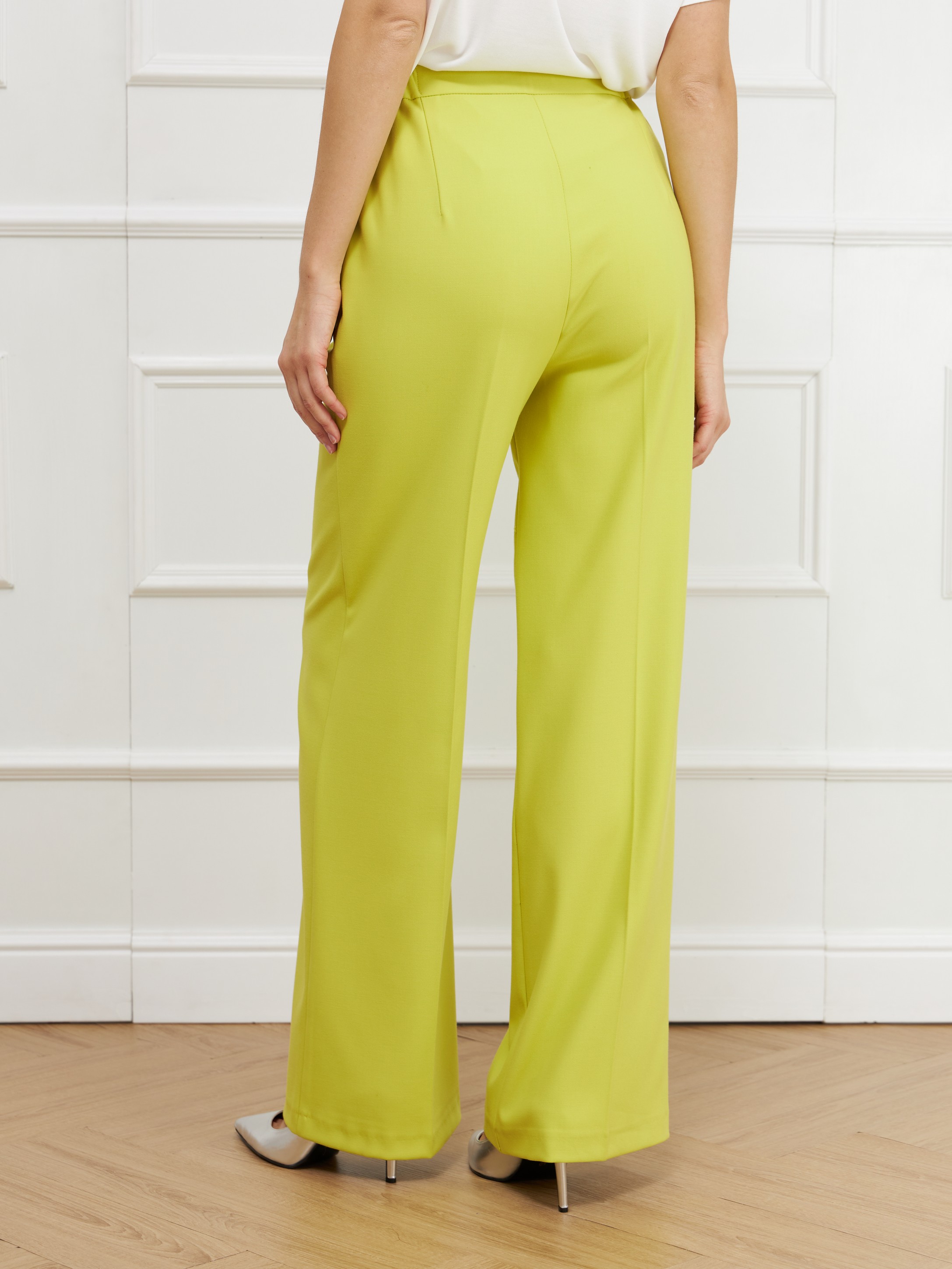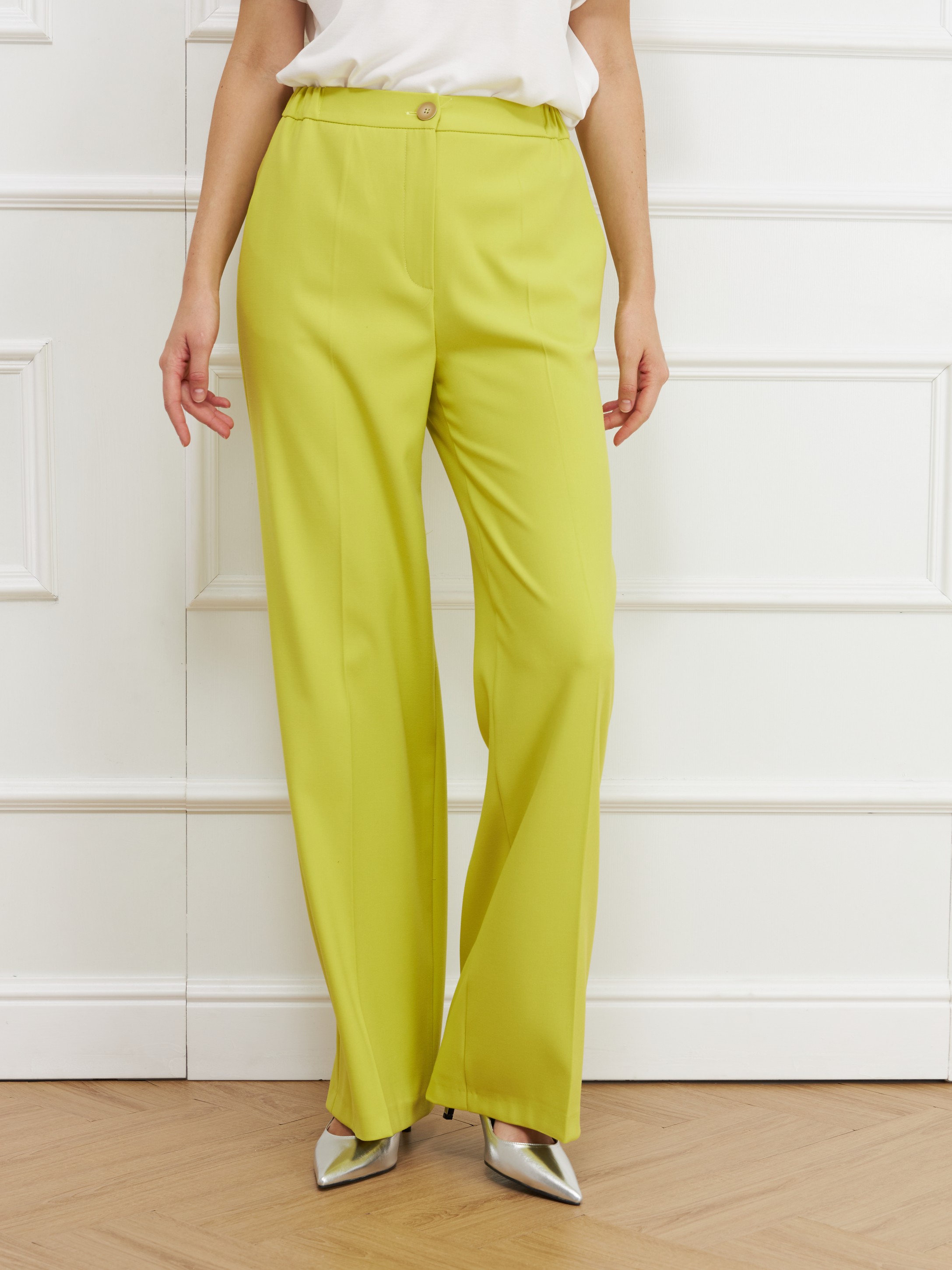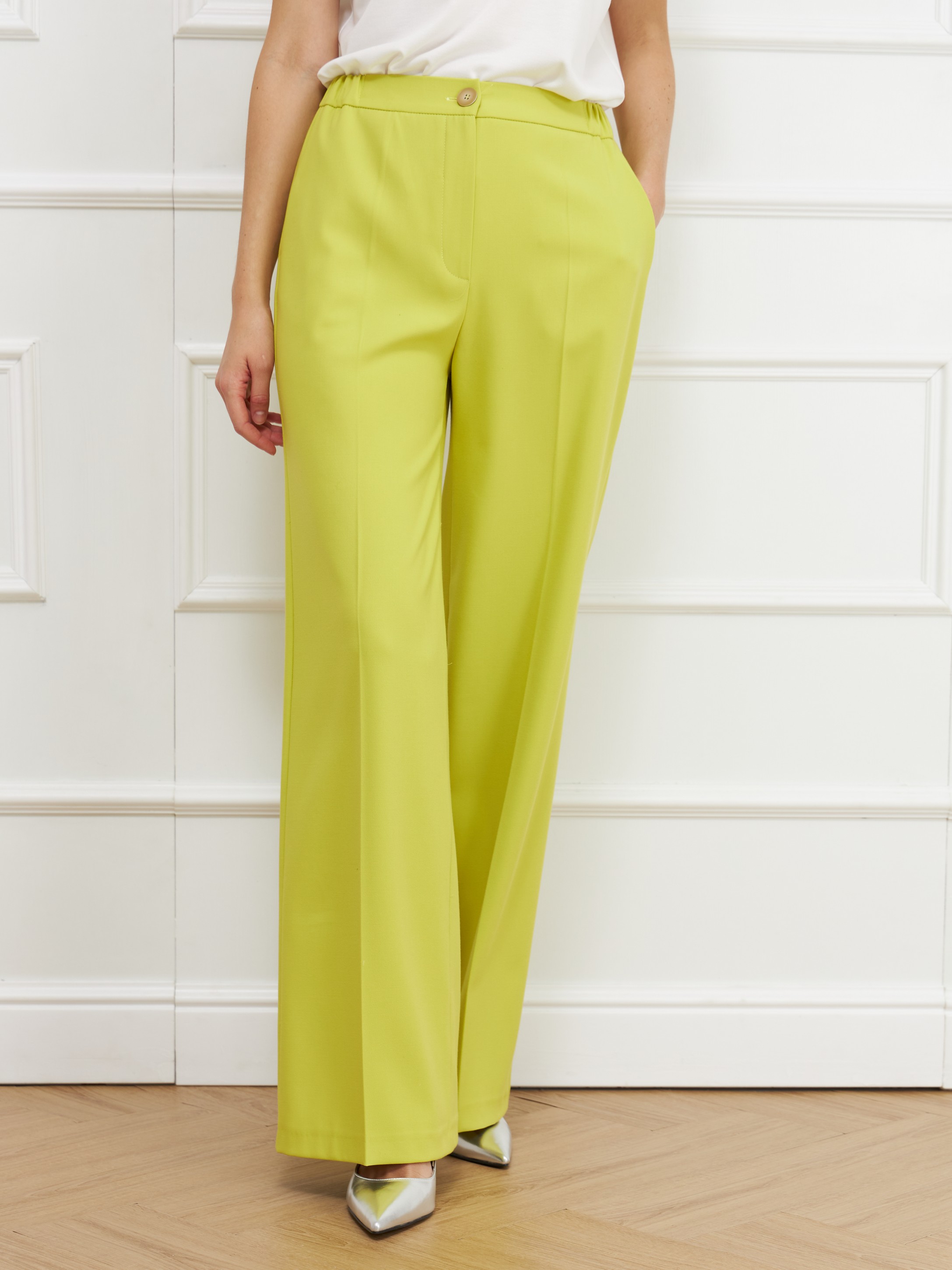 Брюки с завышенной посадкой и заутюженными стрелками имеют широкий крой с деликатным расширением от линии бедра. Модель с боковыми карманами, застежкой гульфик и резинкой по бокам, сшили из тонкой костюмной ткани с эластаном. На фото с брюками Жакет В-808 ЛЮТ(В5) и Джемпер С-43 СОГ(В5).