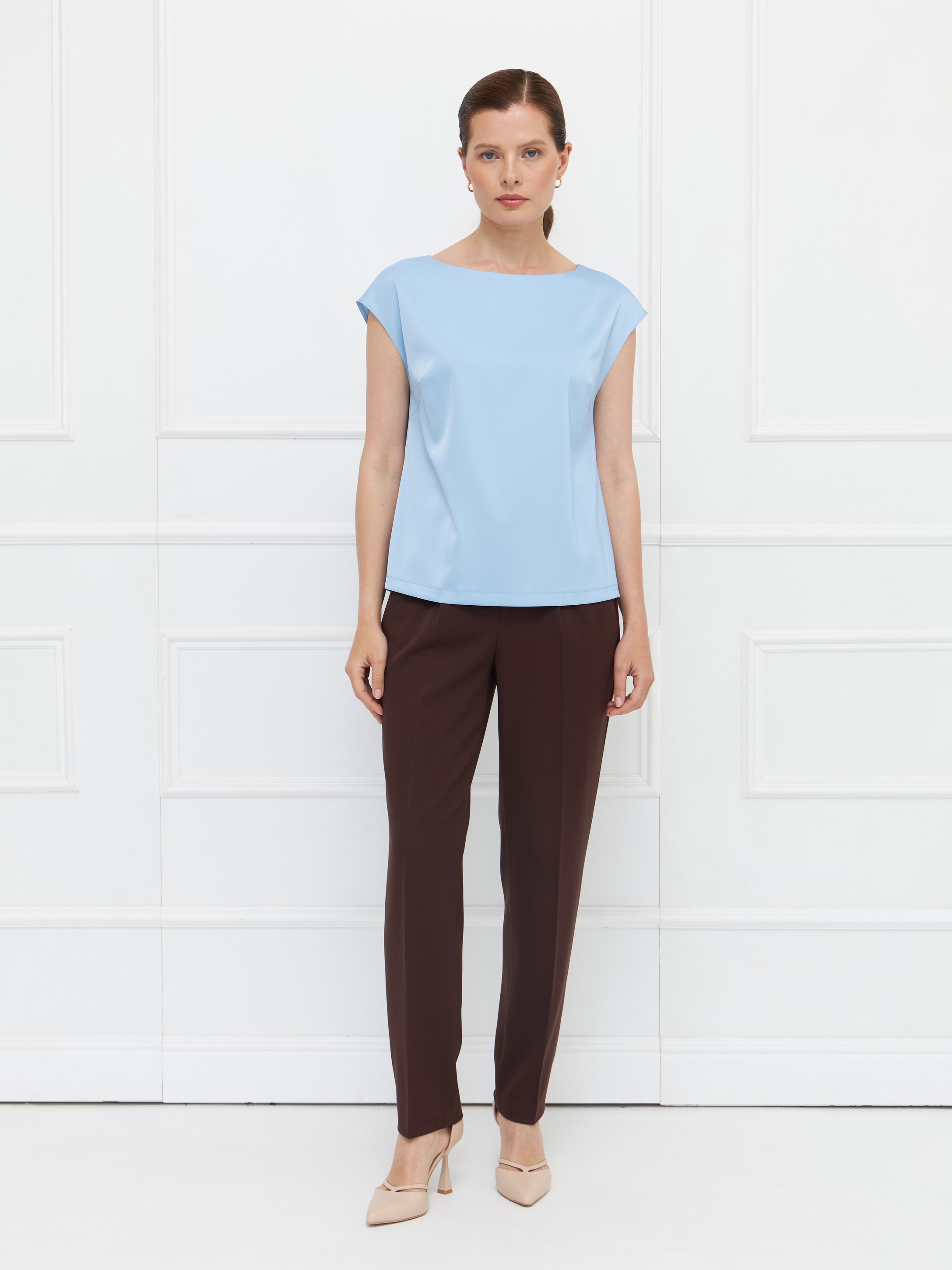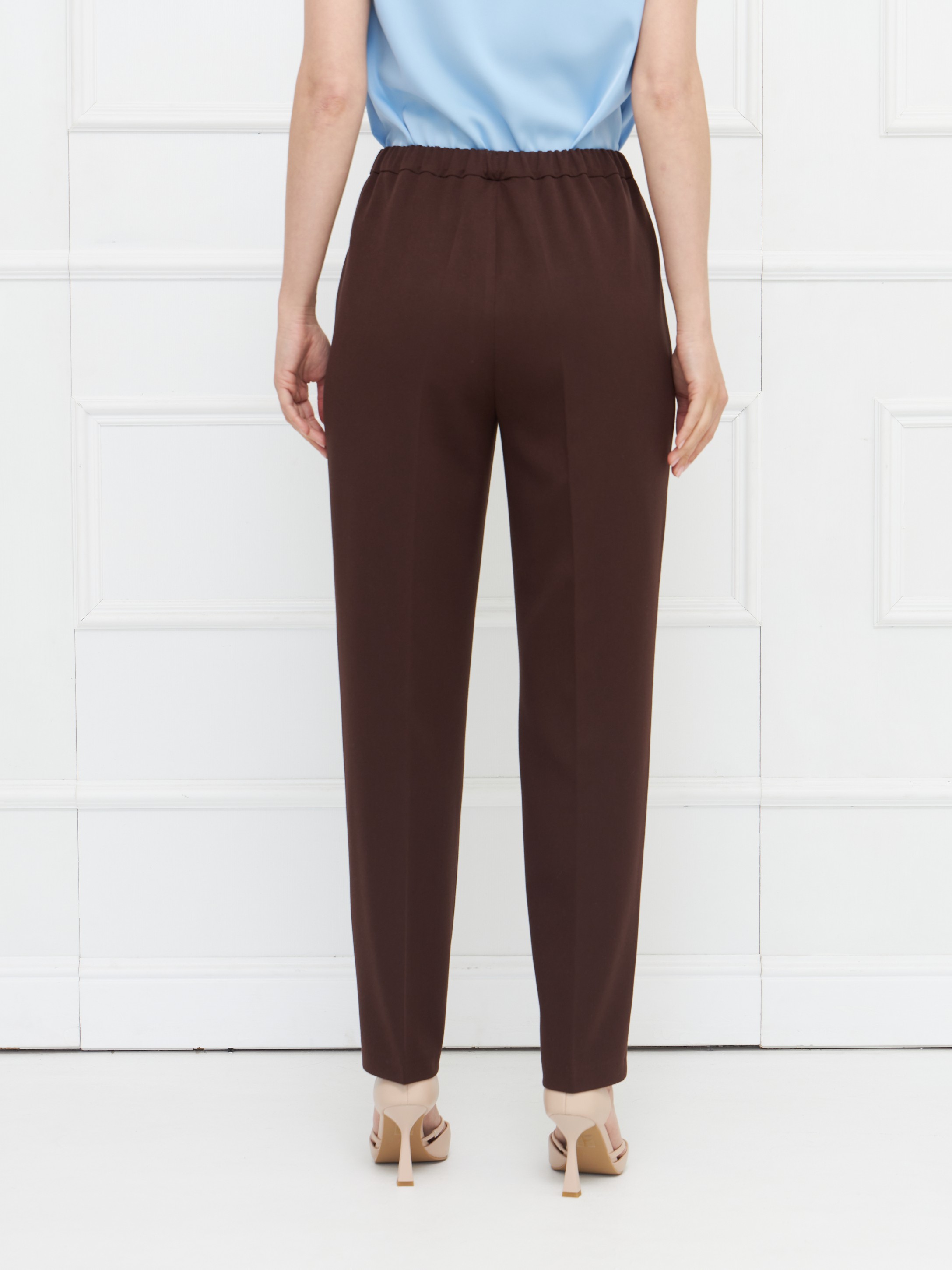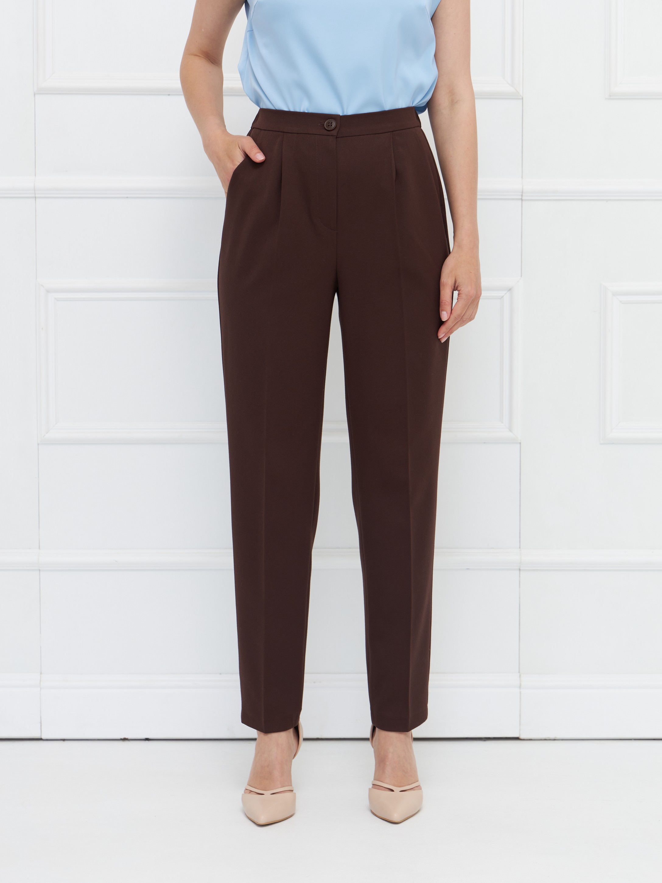 Брюки из мягкой поливискозной ткани в коричневом оттенке отличаются комфортной посадкой и элегантным видом. Прямой силуэт дополнен мягкими складками спереди и стрелками, визуально вытягивающими линию ног. Боковые карманы добавляют функциональности, застежка - гульфик. В задней части пояса вставлена резинка, обеспечивающая удобную посадку по фигуре. Универсальная модель, сочетающая строгость и мягкость формы. На фото в паре Жакет В-969 ГОШ(О5).