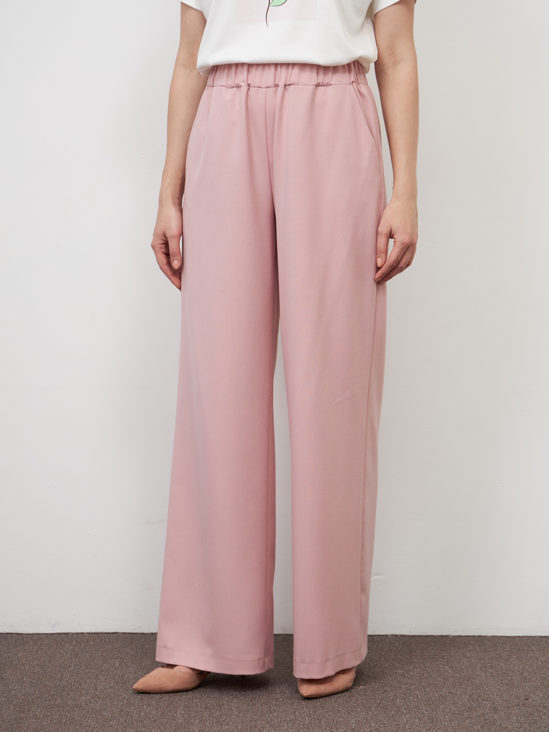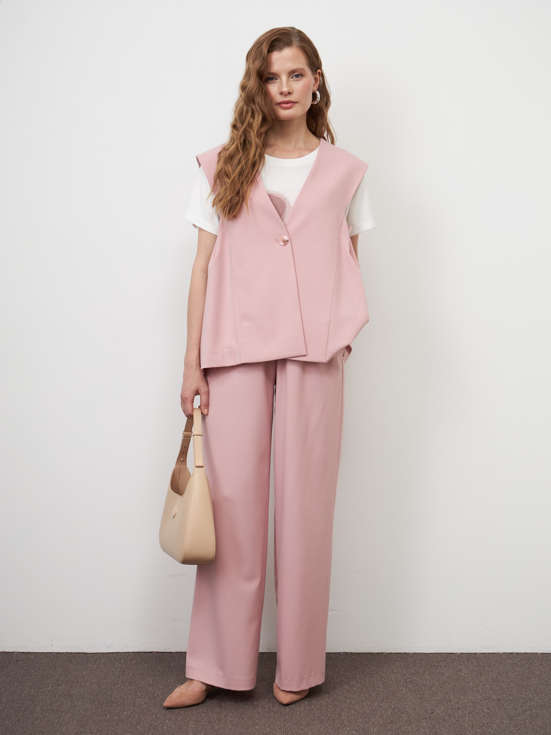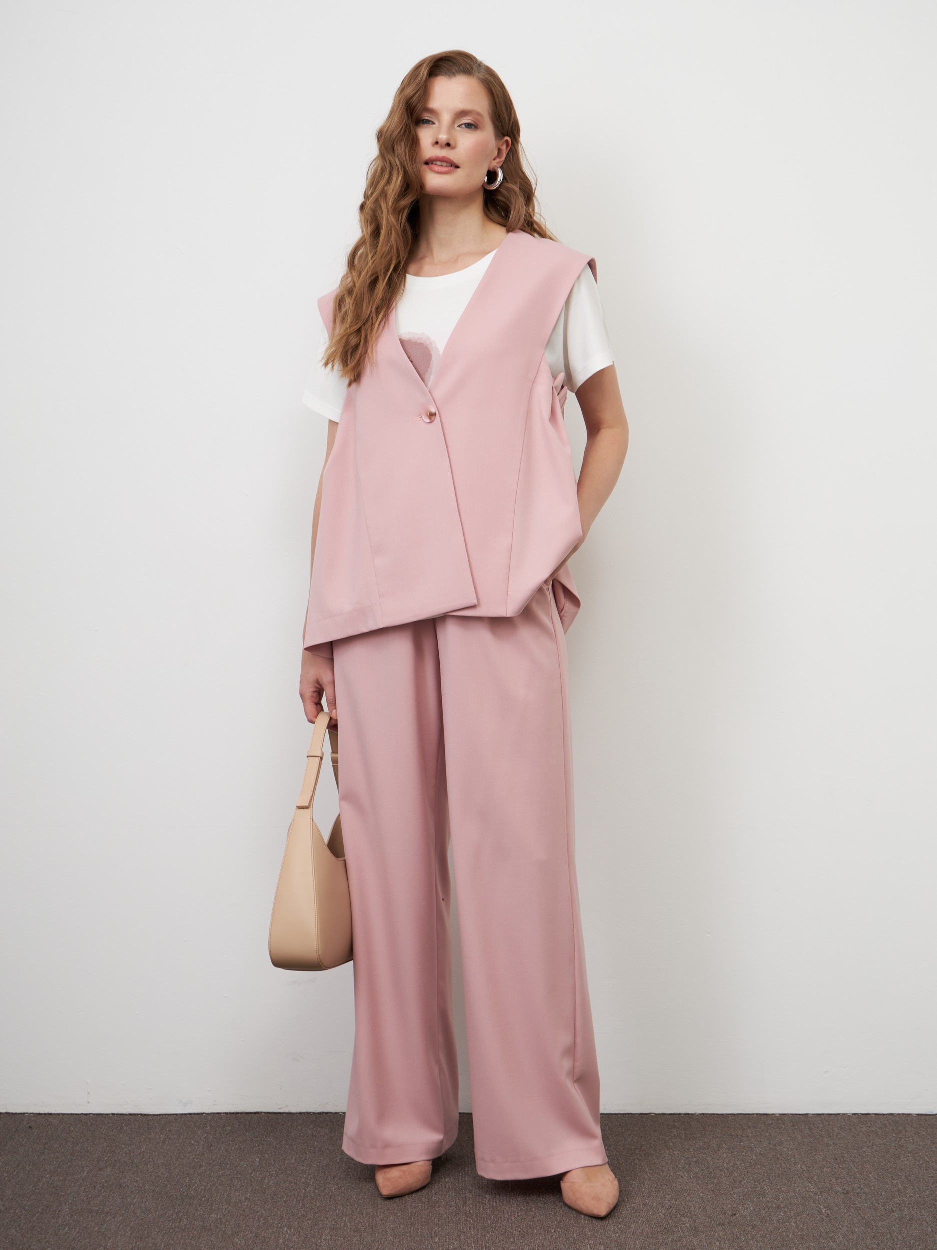 Свободные брюки нежного розового оттенка разнообразят палитру весеннего гардероба. Лаконичная модель без застежки, с боковыми карманами и эластичным поясом, сшили из легкой костюмной ткани, которая не мнется, поддерживает комфортный микроклимат и долго сохраняет безупречный вид. На фото в паре Жилет В-71 РВЕ(В5) и Джемпер С-34 РГР(Л5).