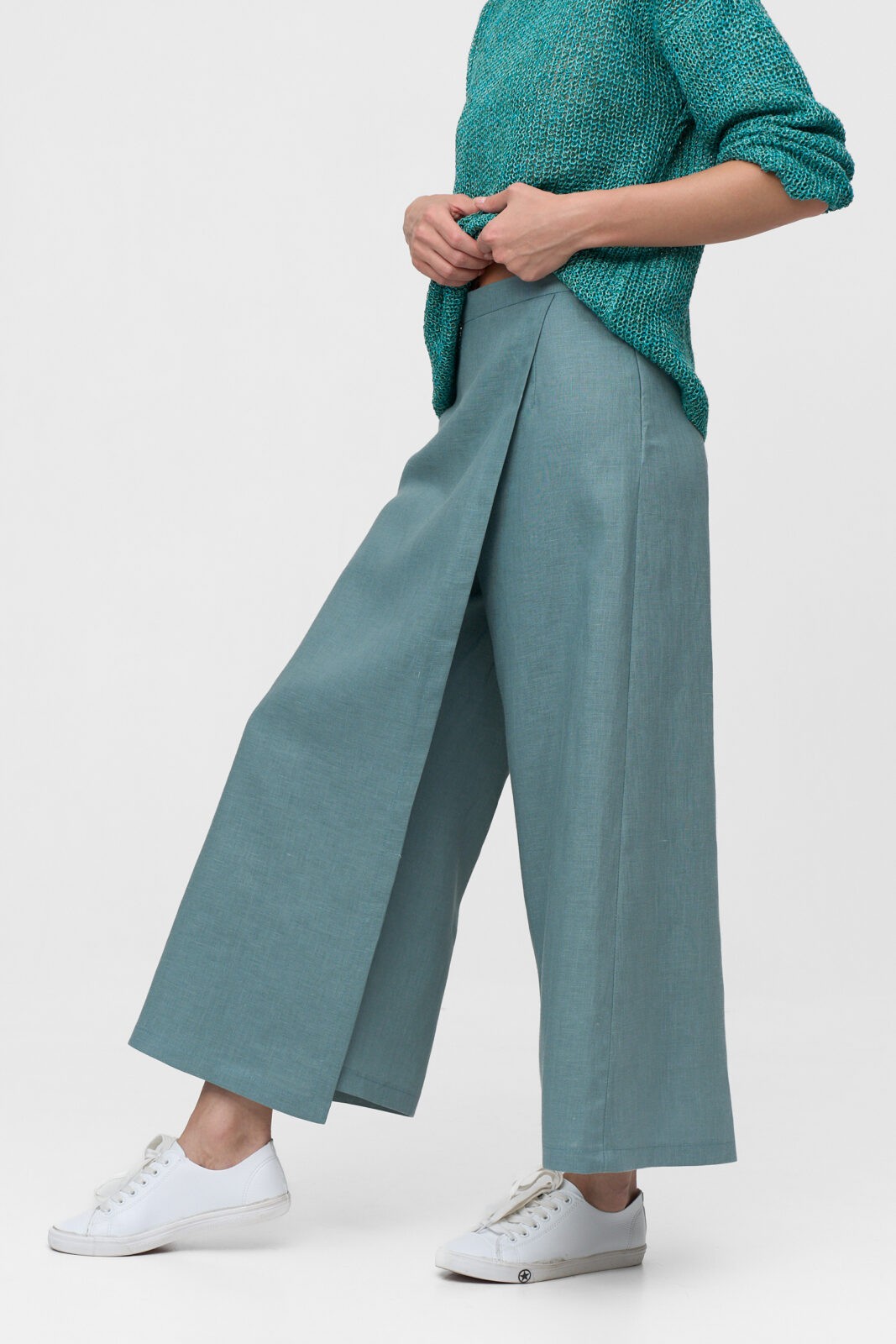 Юбка – брюки с запахом по переду и сзади. А-образного силуэта. Длина брюк 7/8. Застежка на потайную тесьму-молнию в левом боку. Пояс притачной с резинкой  по бокам.