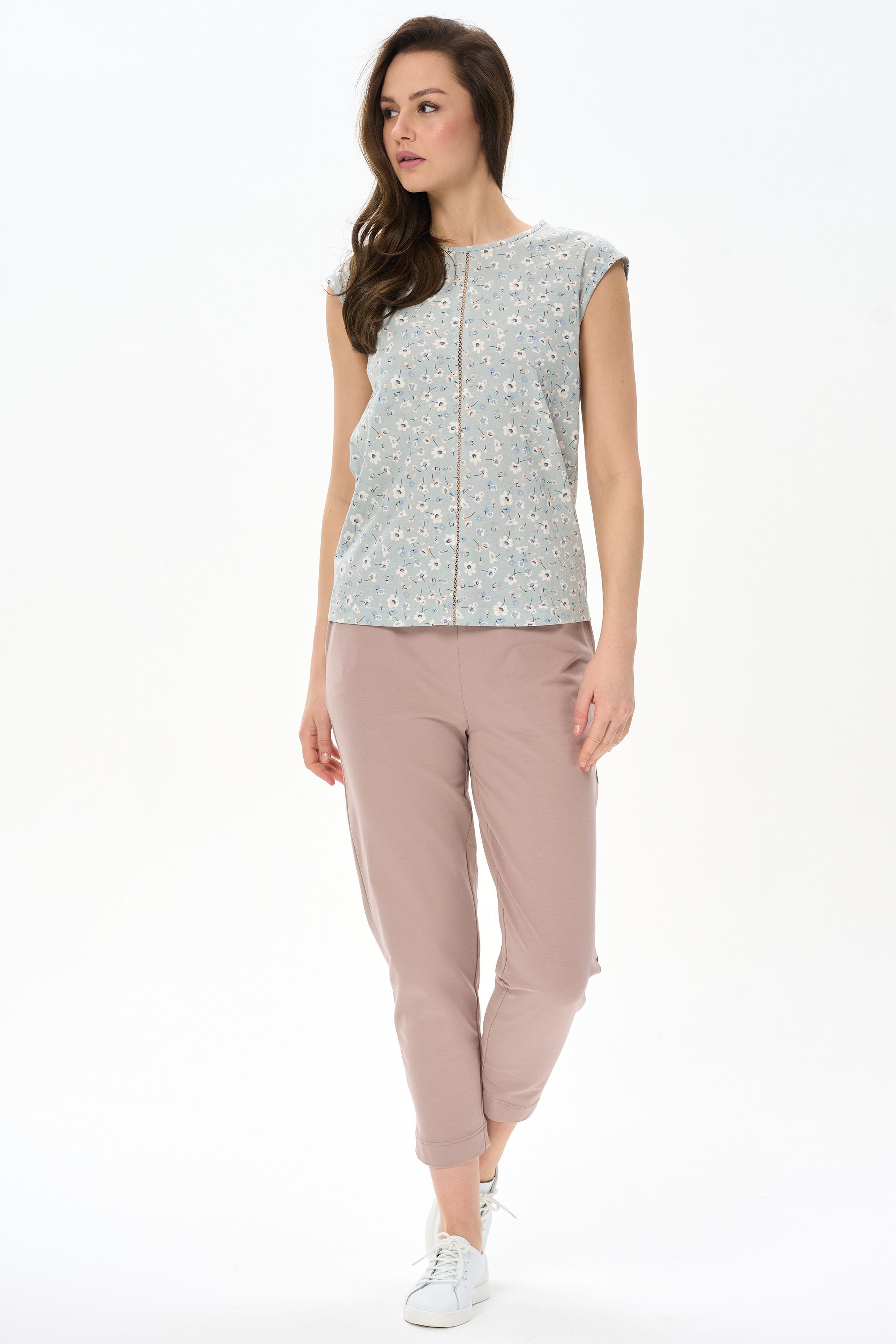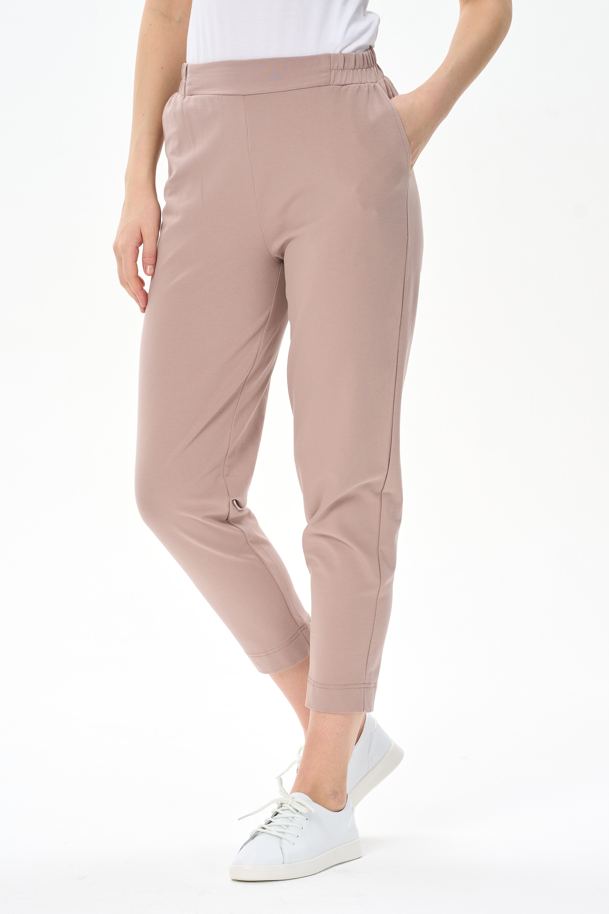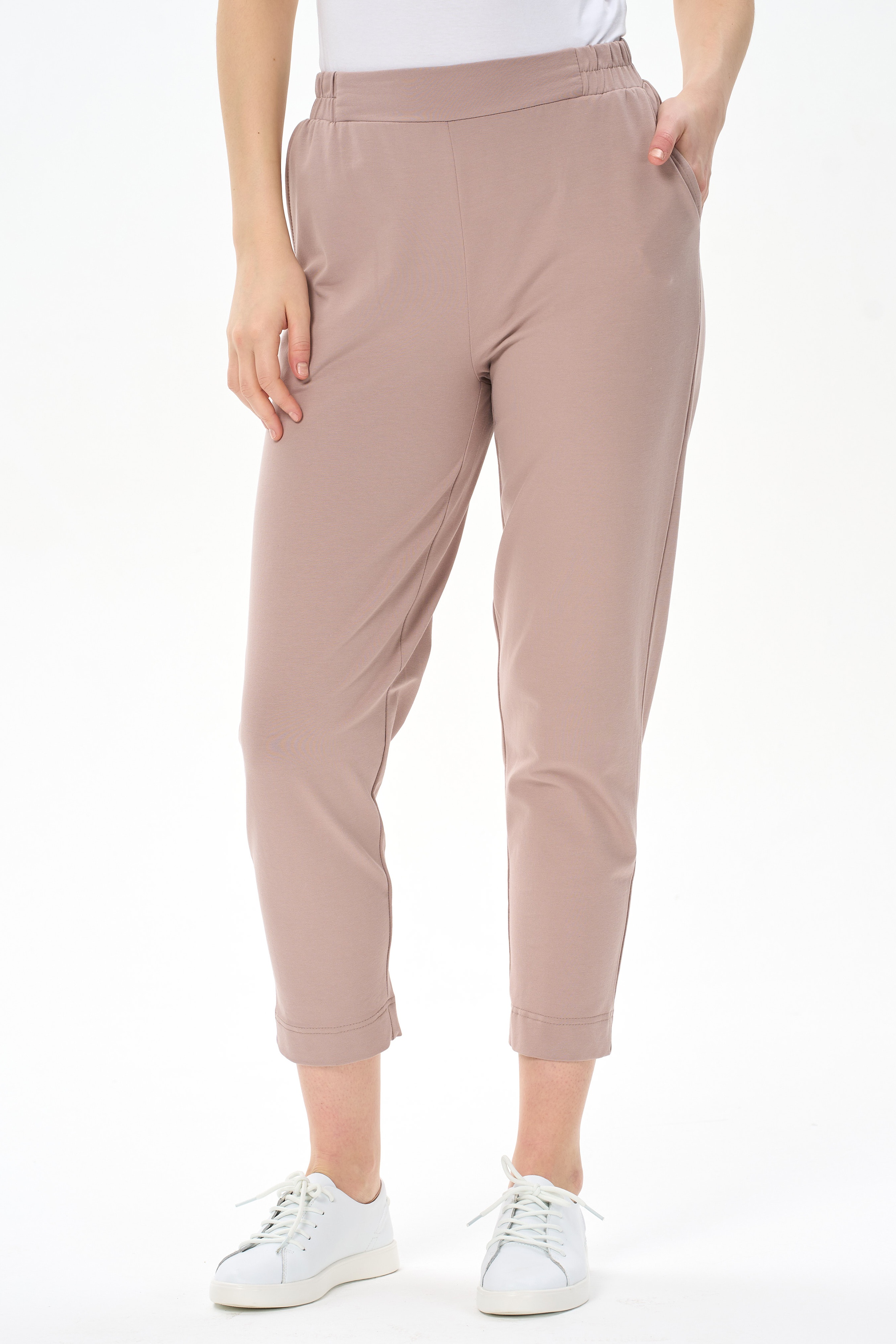 92% хлопок/ 8% эластан Повседневные брюки-бананы из хлопкового футера 2х нитки (без начеса). Модель с карманами. Пояс с планкой и эластичной лентой внутри. Длина брюк регулируется отворотами. Рост модели 177см.
