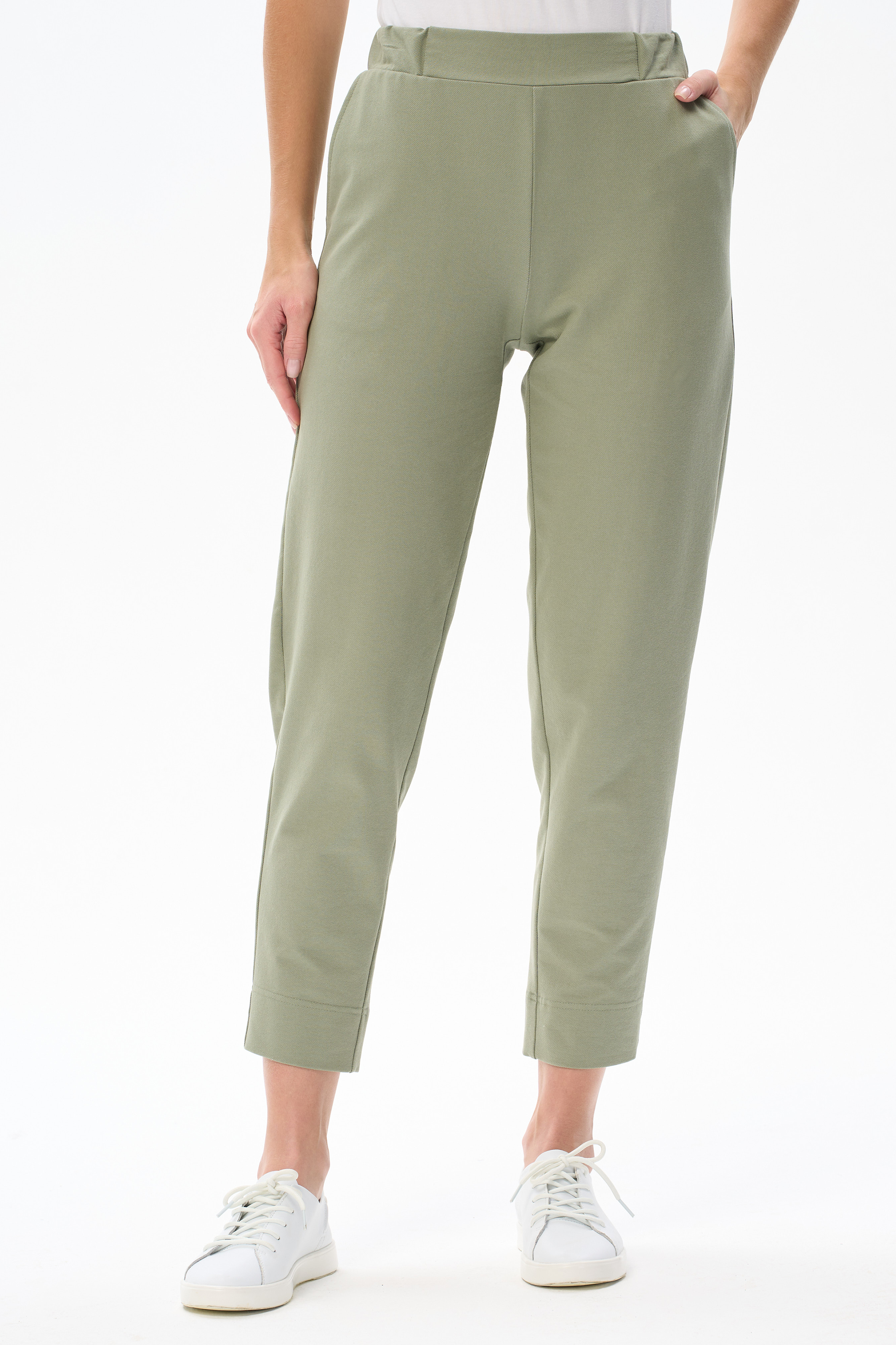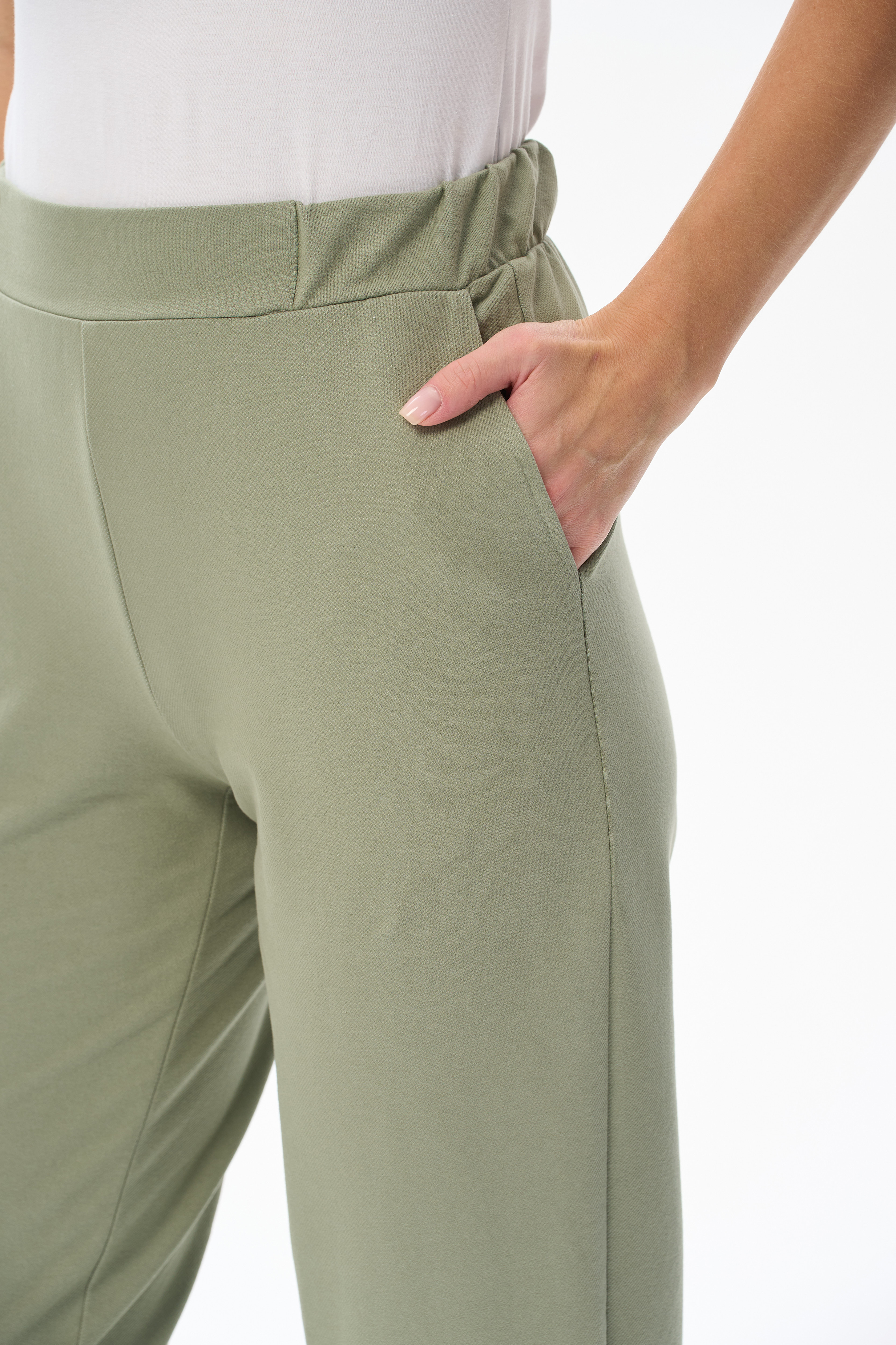 Брюки укороченные свободные из джинскота качества ПЕ 240 гр в приятном серо-зелёном оттенке. Модель с боковыми карманами, пояс с планкой и эластичной лентой внутри, по низу отвороты. Комфортная модель в актуальном силуэте, для отдыха, прогулок и путешествий. Рост модели 175 см.