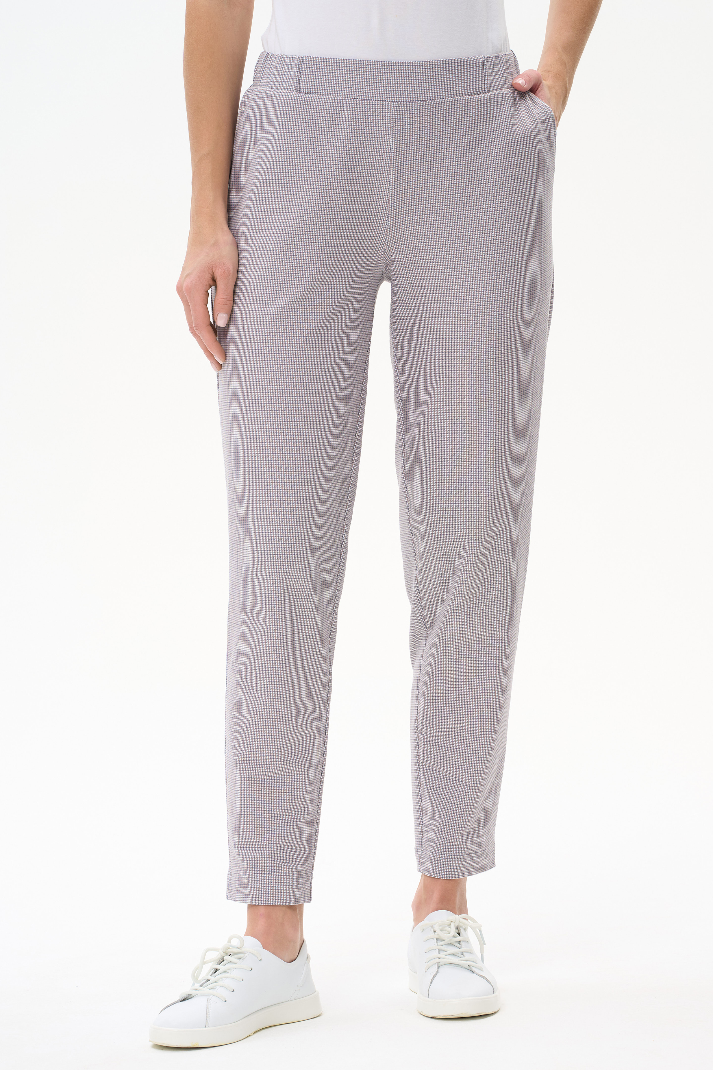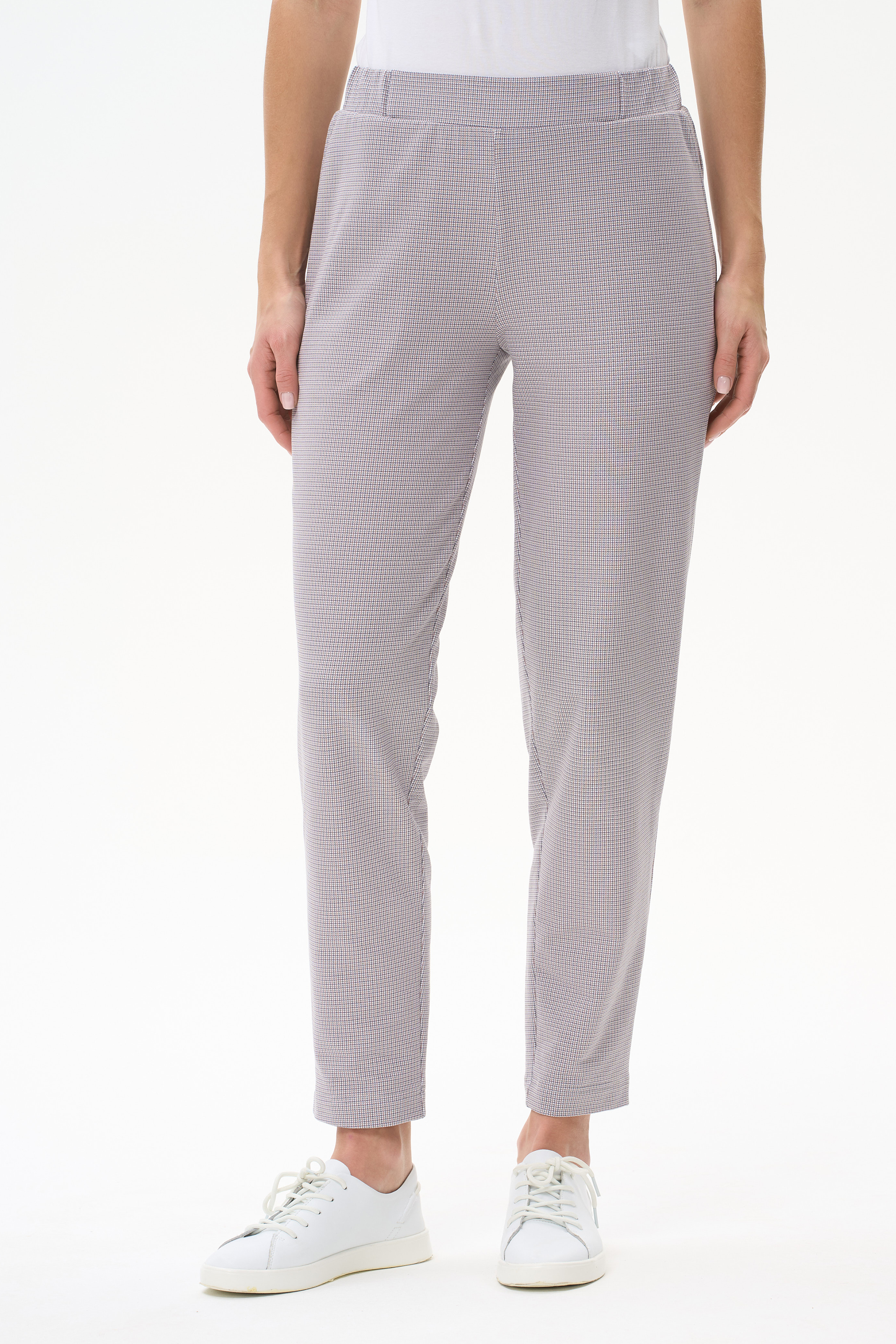 92% хлопок, 8% эластан Комфортные, длинные, чуть зауженные брюки с карманами из хлопкового футера 2х нитки (без начеса). Пояс с планкой и эластичной тесьмой внутри. Длина брюк регулируется отворотами. Принт мелкая клетка "Пепита". Длина по боковому шву в 44 размере - 95см. Рост модели 177