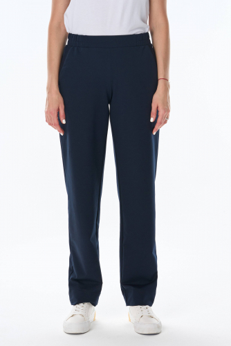80% хлопок/ 14% полиэстер/ 6% эластан Длинные чуть зауженные брюки с карманами из хлопкового полотна джинскотт. Пояс с планкой и эластичной тесьмой внутри. Длина по боковому шву (без учета пояса) 95см. Рост модели на фото 177.