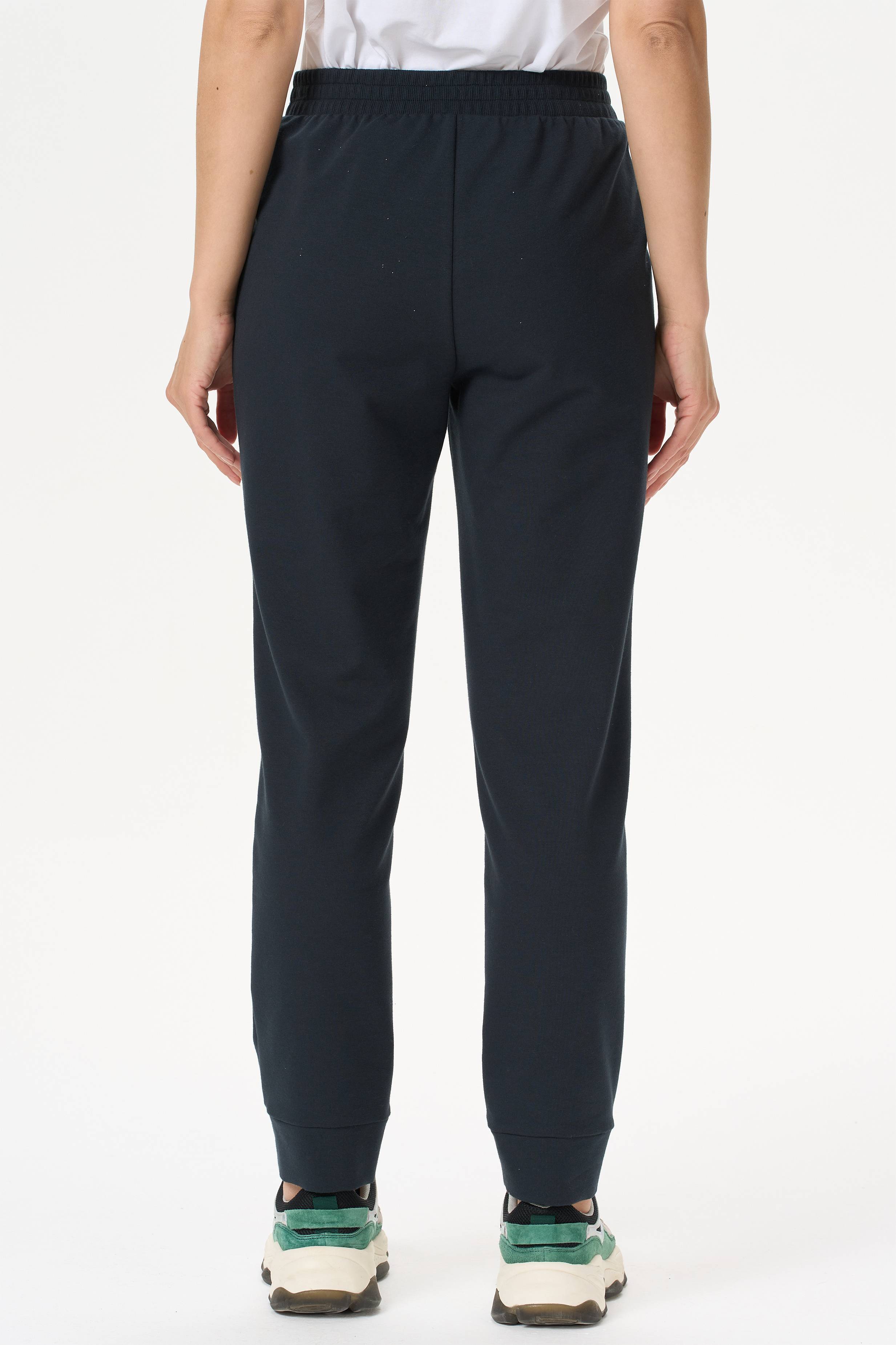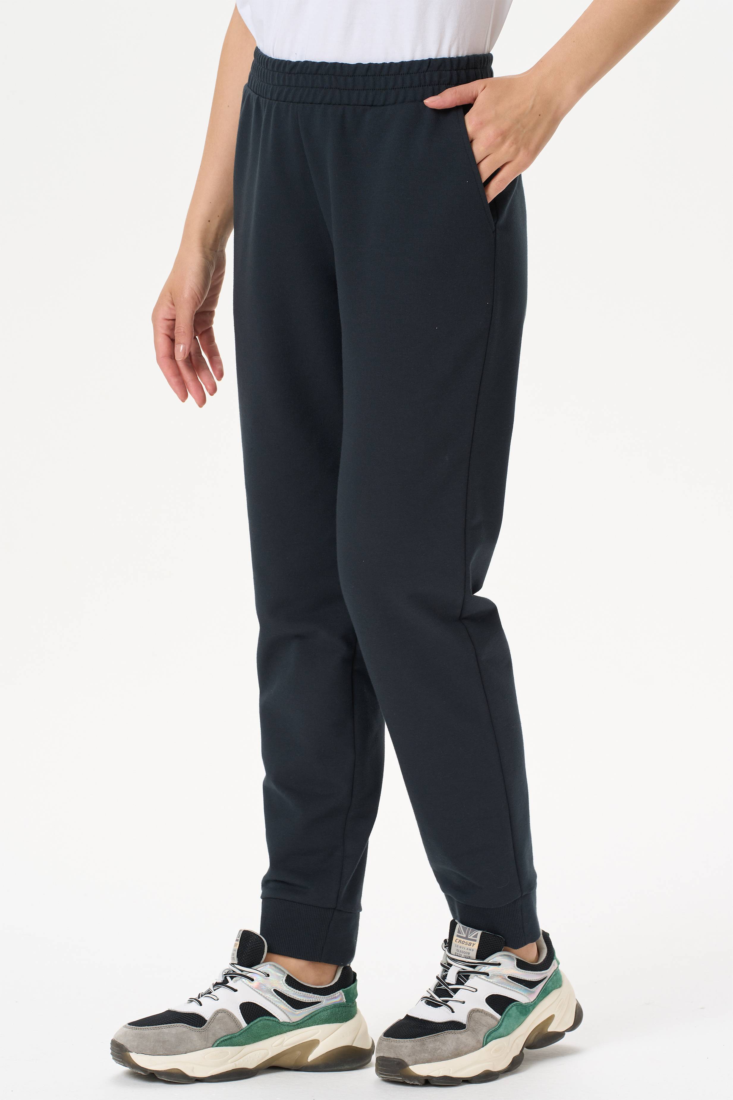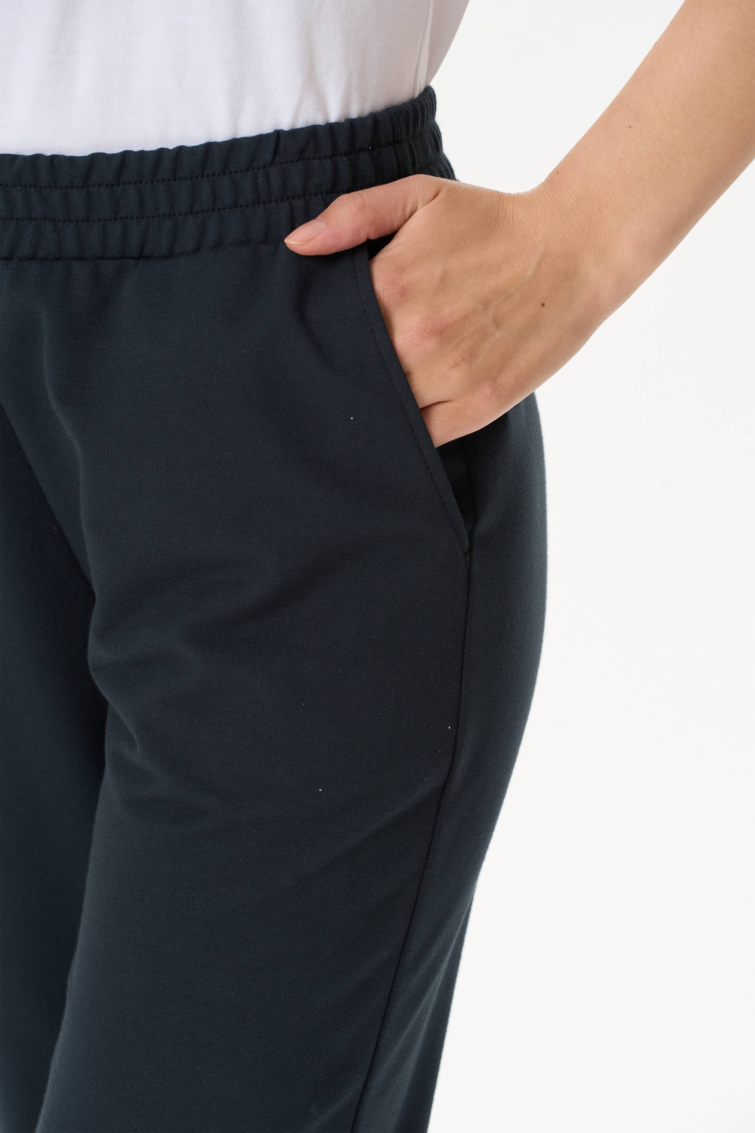 80% хлопок/ 14% полиэстер/ 6% эластан Модные брюки классической формы с прорезными карманами из хлопкового футера 2х нитки с эластаном (без начеса). Отделка из кашкорсе в тон полотна расположена по передней части манжета и задней части пояса на брюках. Длина по боковому шву 94см в 44 размере. Рост модели на фото 170.