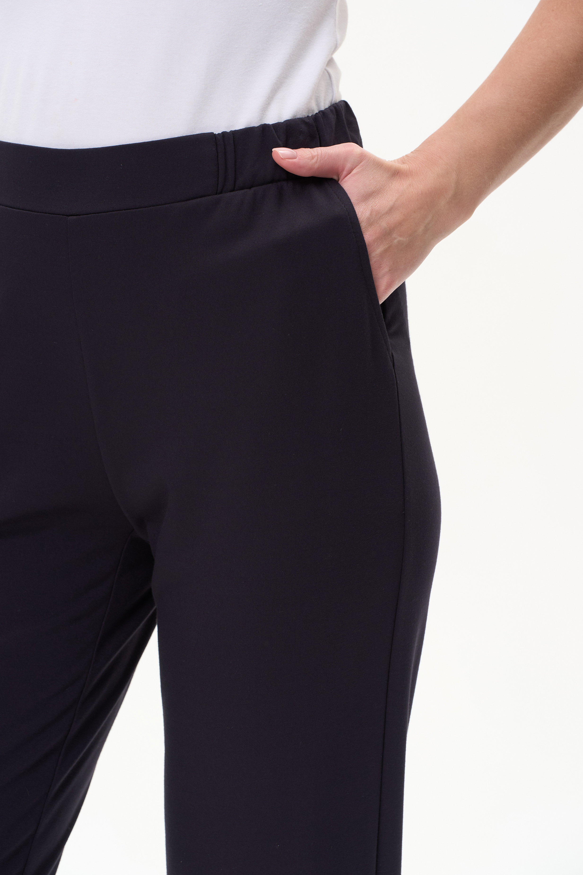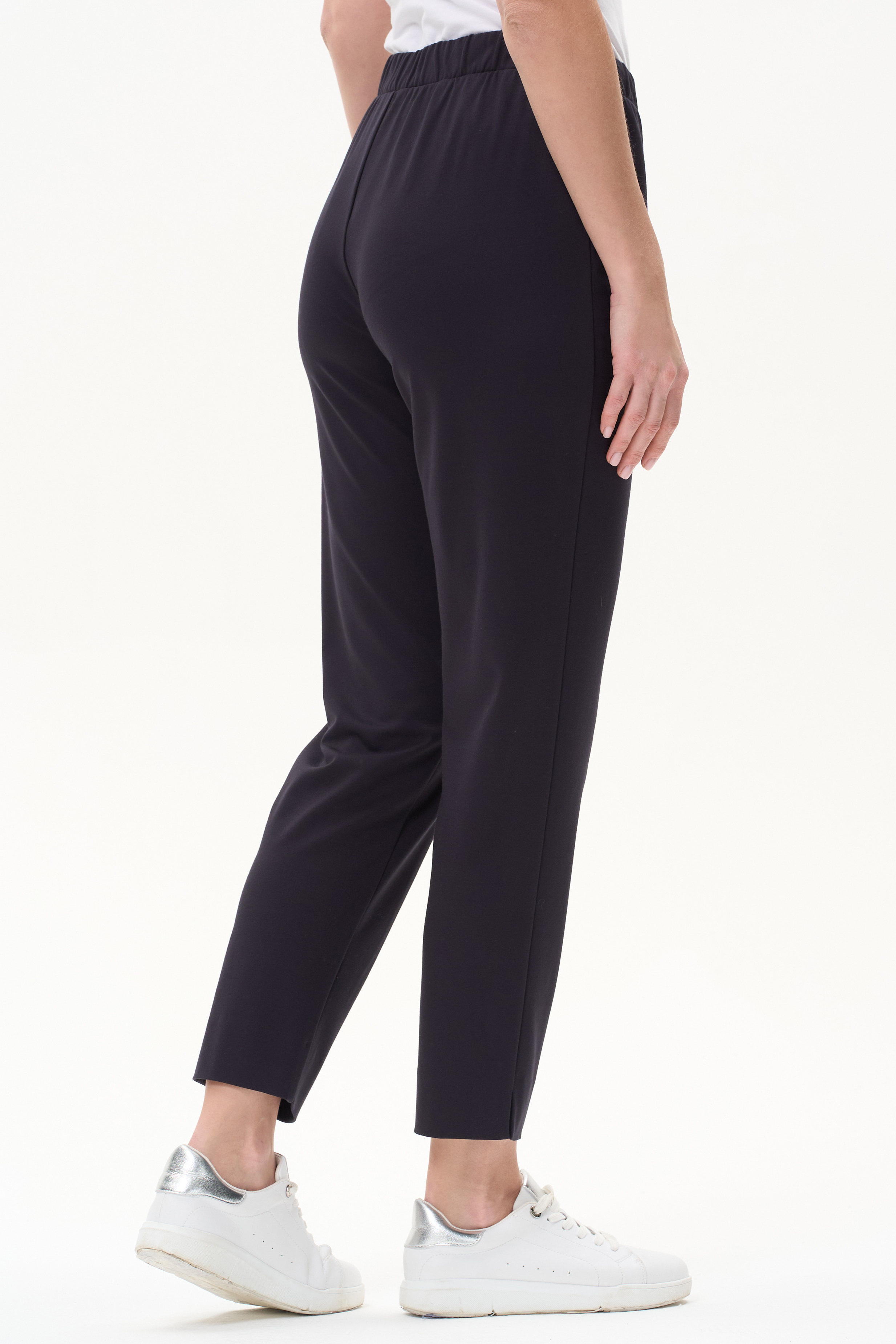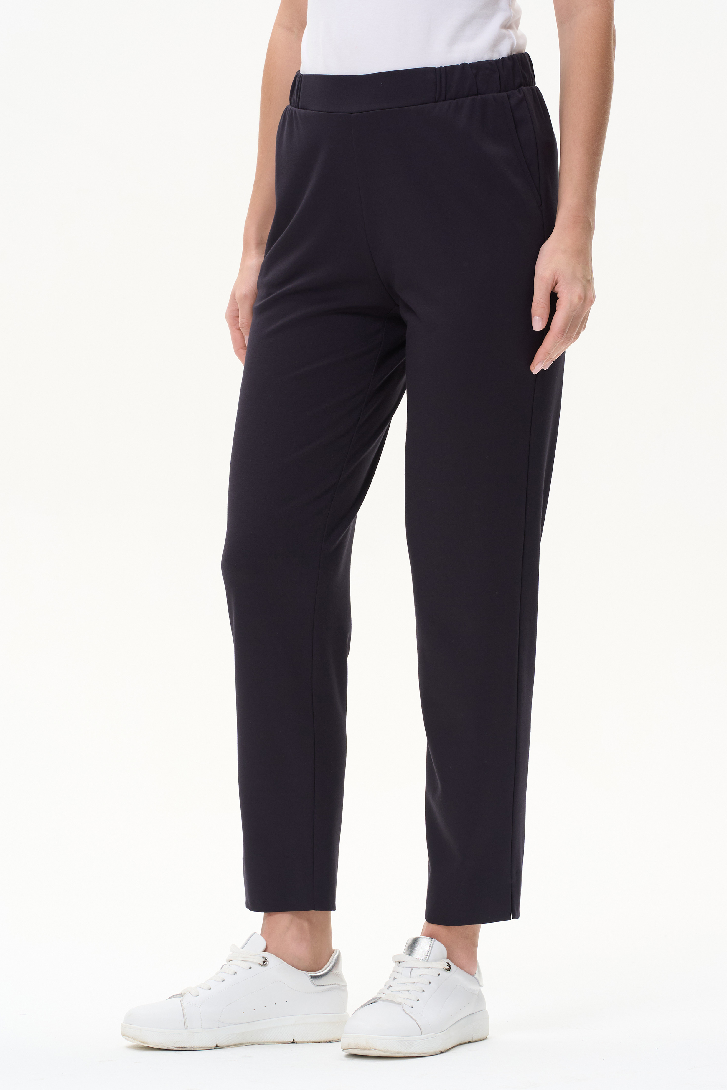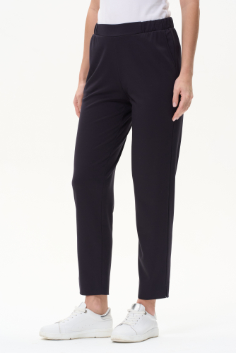 65% вискоза/ 30% полиэстер/ 5% эластан Брюки полной длины чуть зауженные к низу, с небольшими разрезами по низу, из мягкого пластичного полотна 260 гр в глубоком синем оттенке. Спереди небольшие складки и карманы, пояс с эластичной лентой внутри. Комфортная, универсальная модель для офиса и особых случаев. Рост модели 175 см