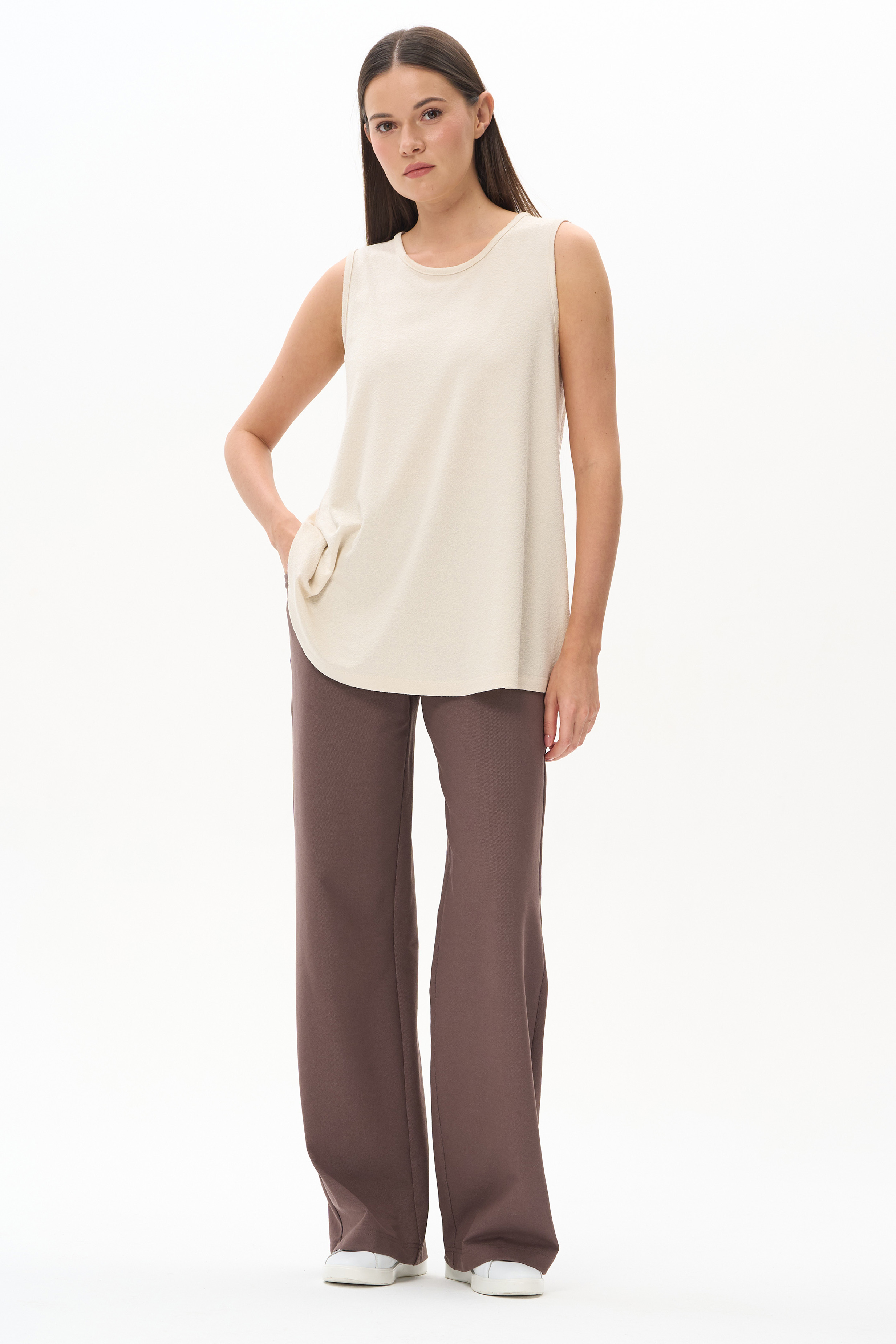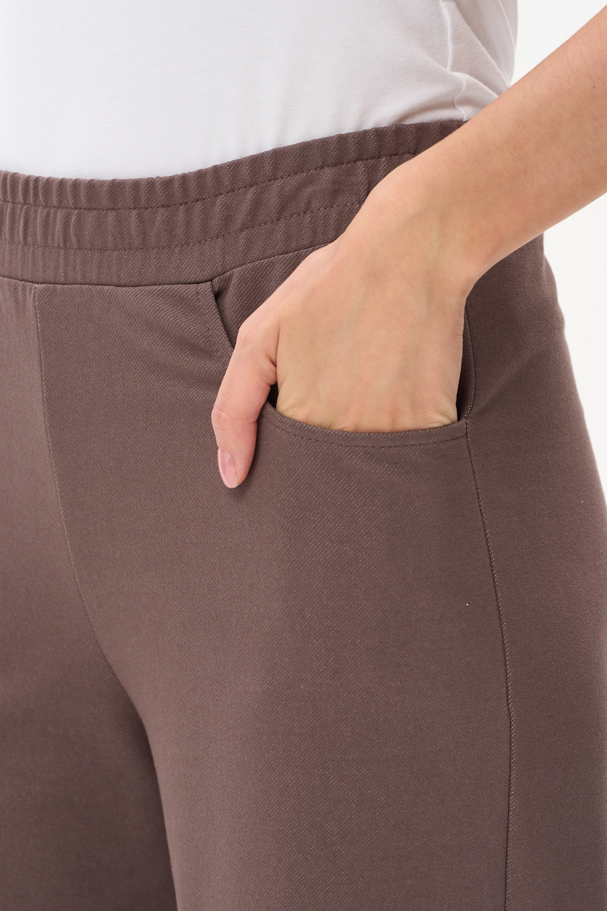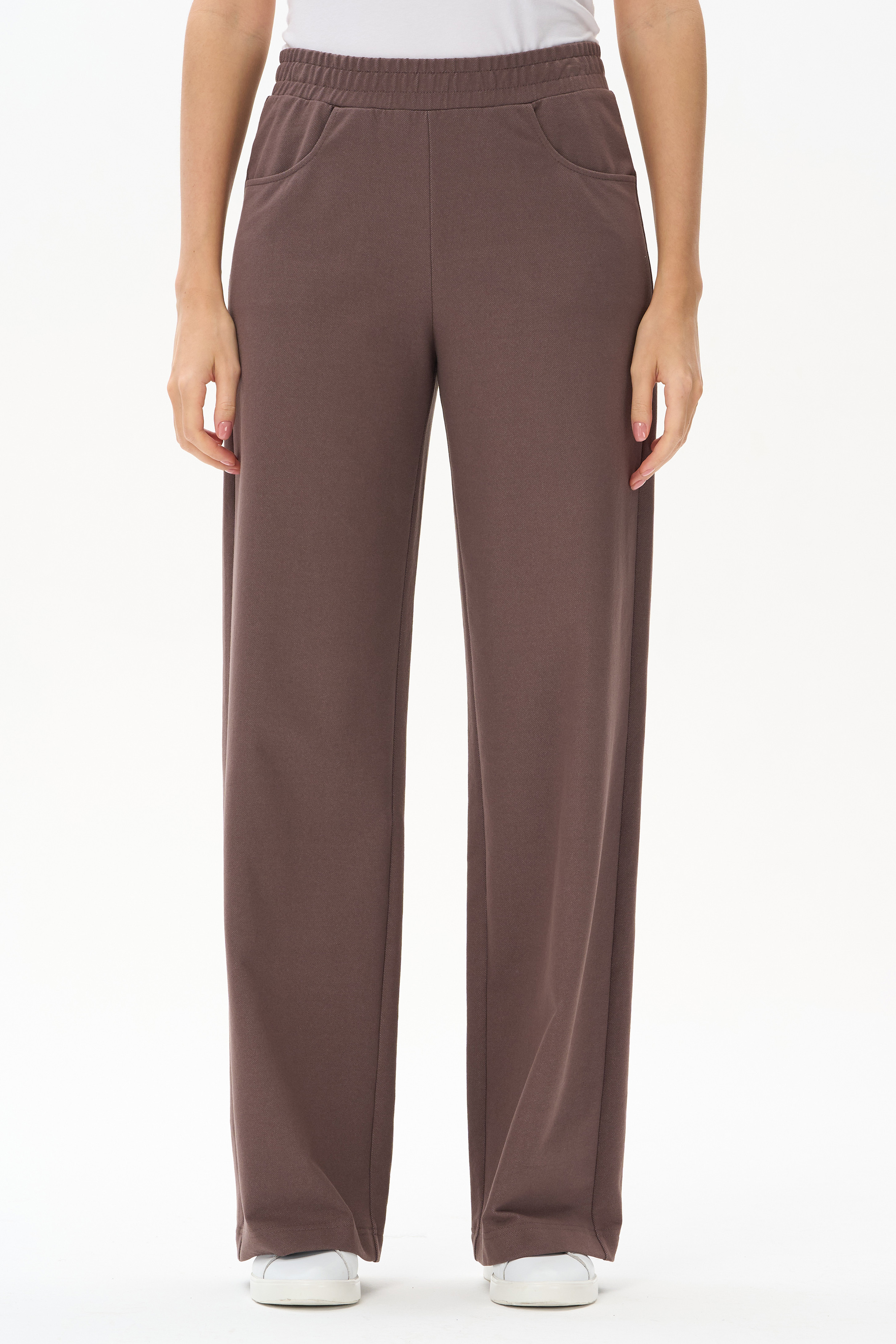 80% хлопок, 14% полиэстер, 6% эластан Прямые брюки полной длины из джинскота 240 гр в трендовом оттенке Шоколад. Модель с высокой посадкой, спереди фигурные карманы, пояс с эластичной лентой внутри, отстрочки в тон полотна. Благодаря конструкции брюк модель идеально сидит на фигуре и зрительно "вытягивает" ноги. Рост модели 175.