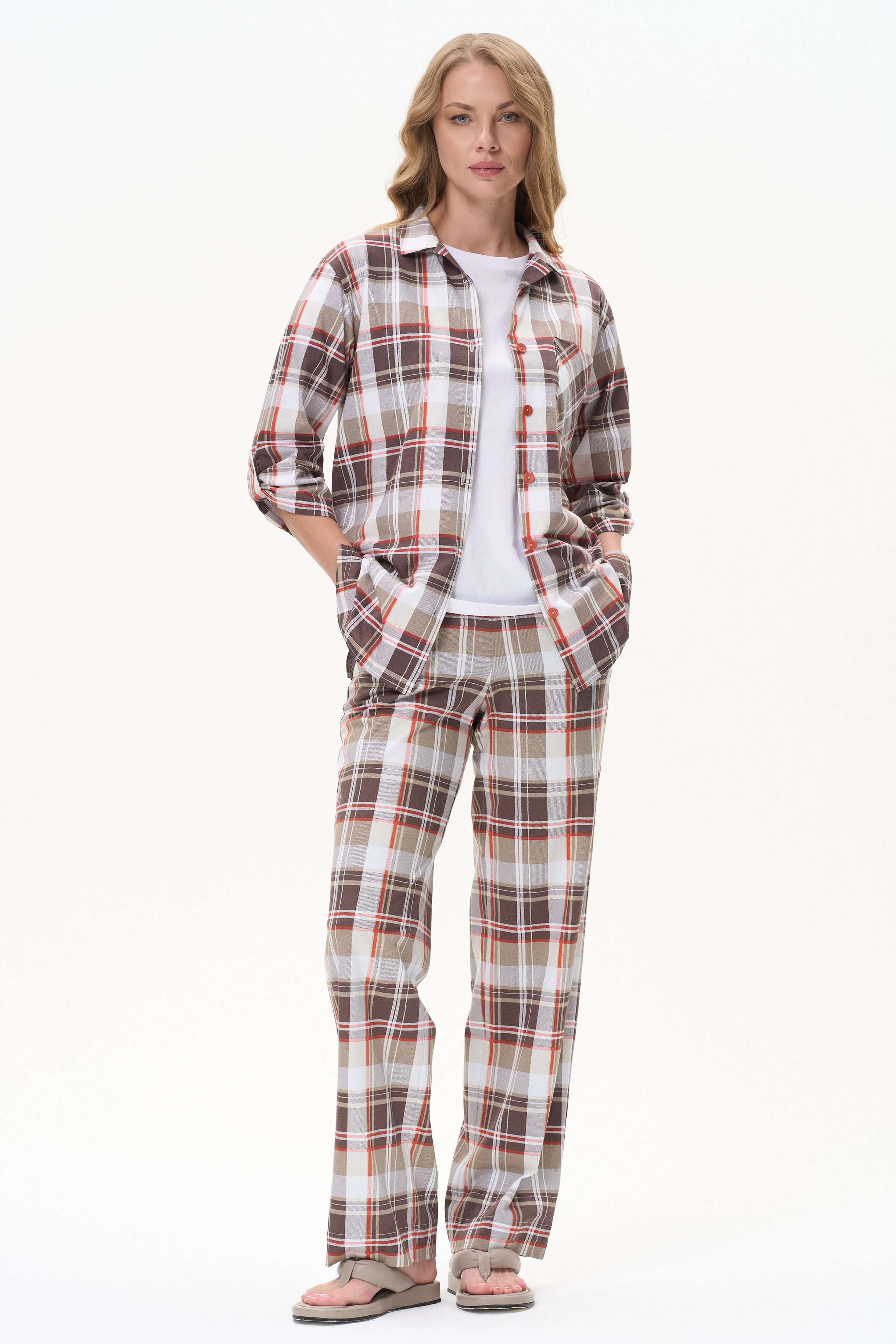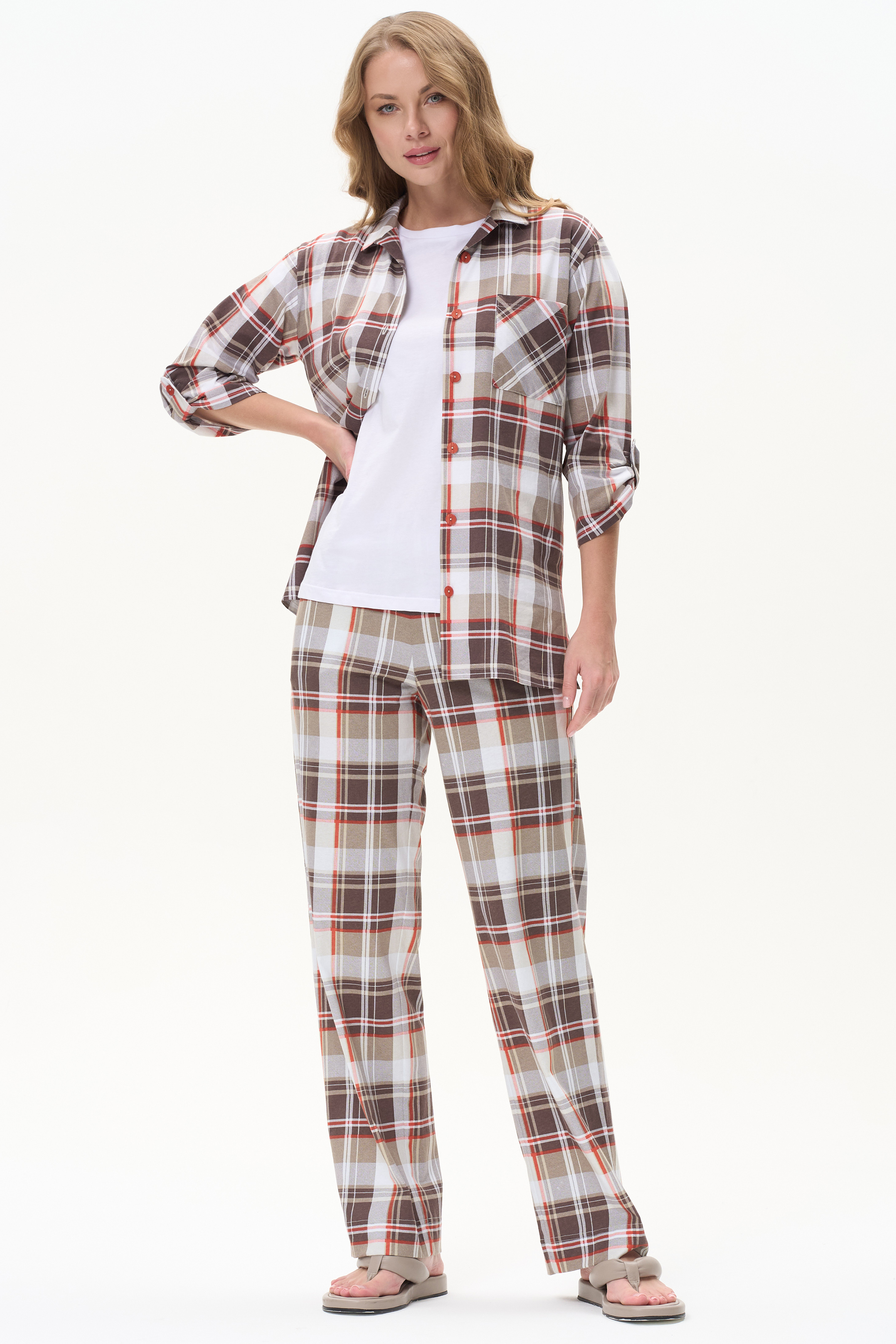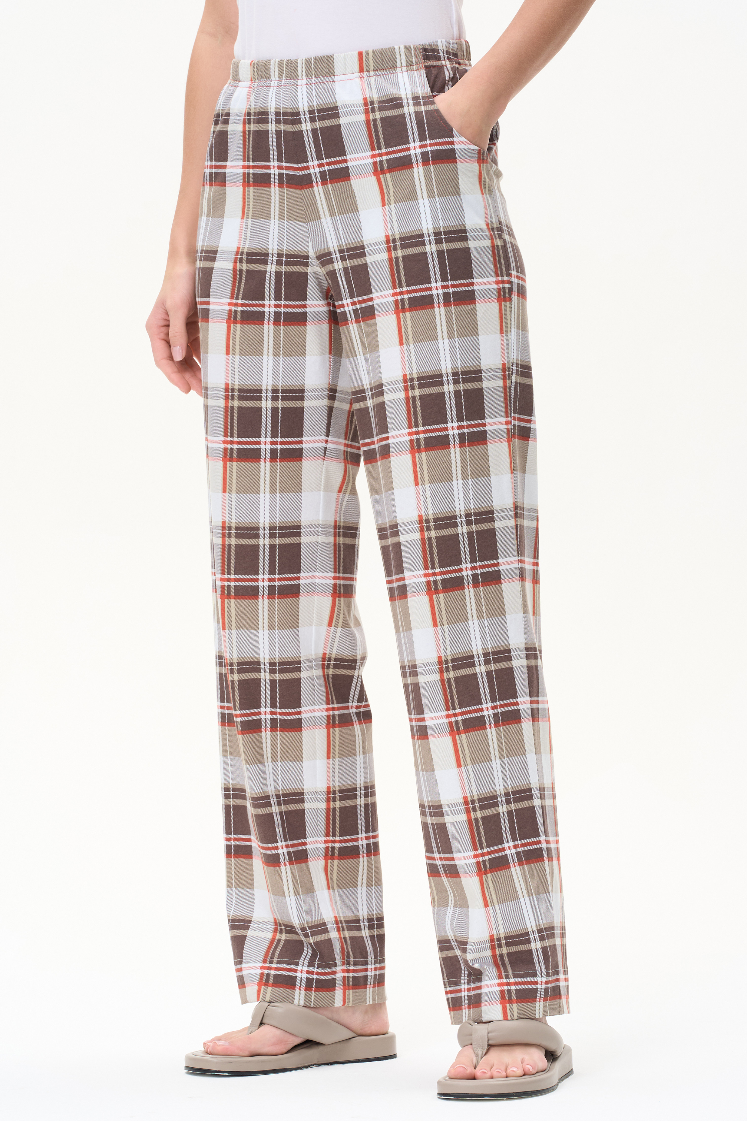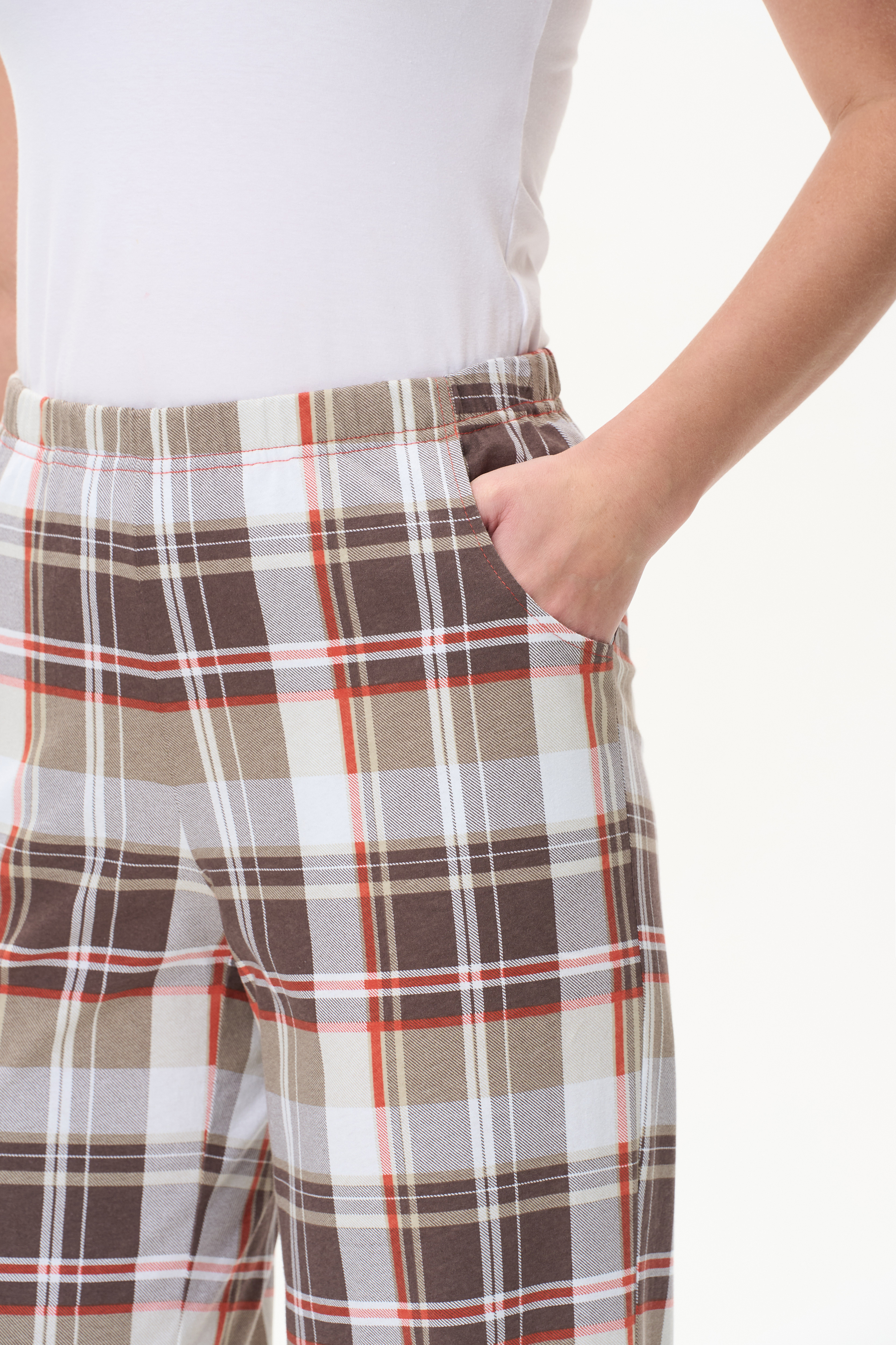 Прямые брюки с карманами, пояс с эластичной лентой внутри. Рост модели 175 см.