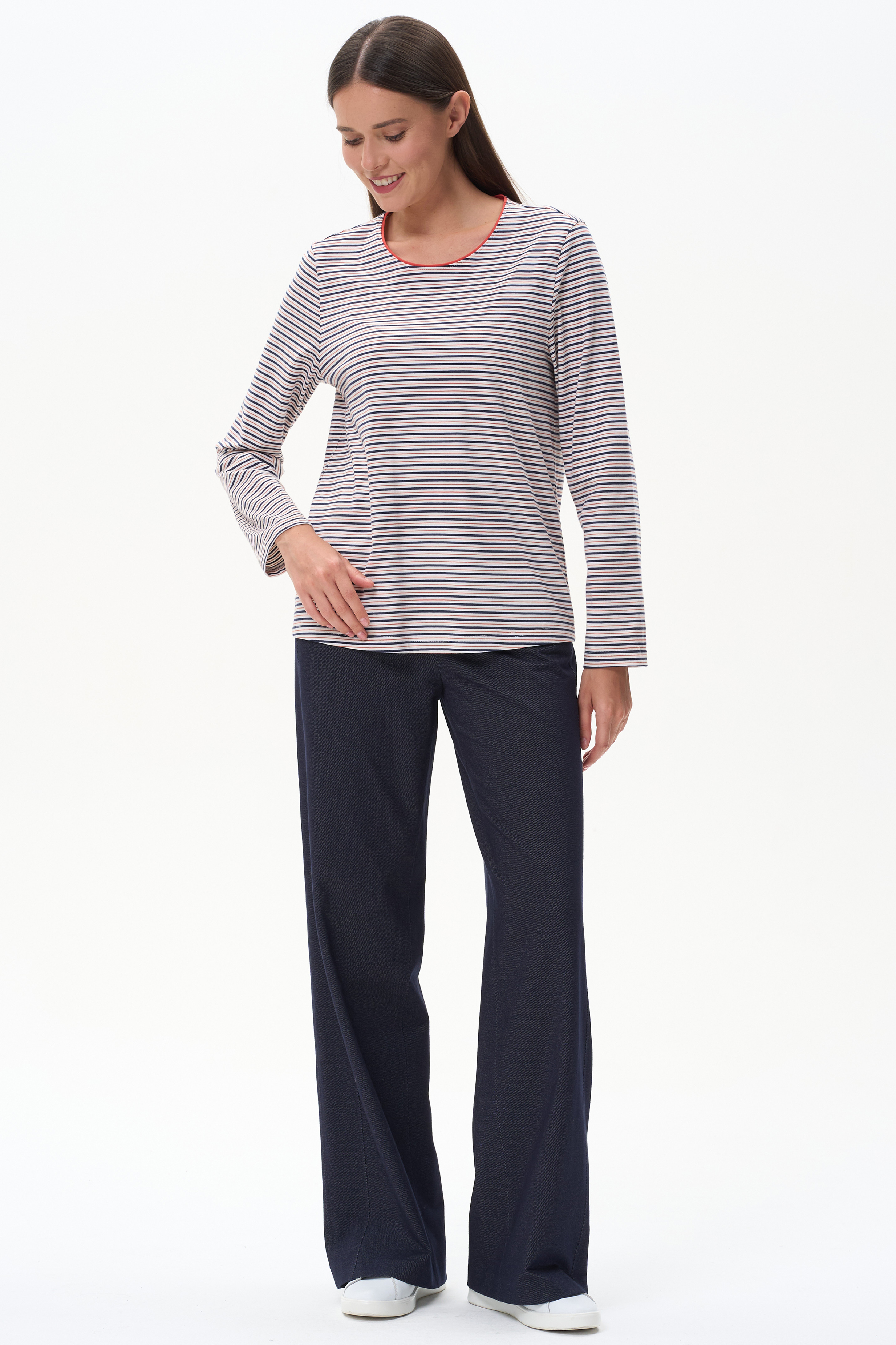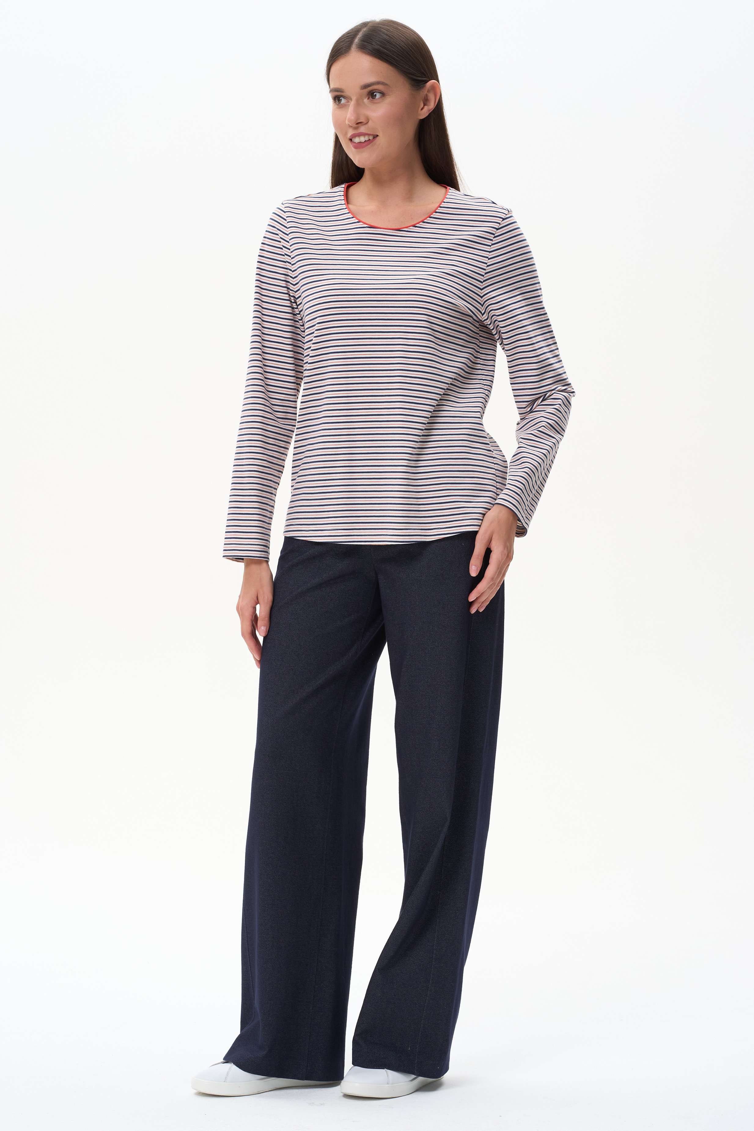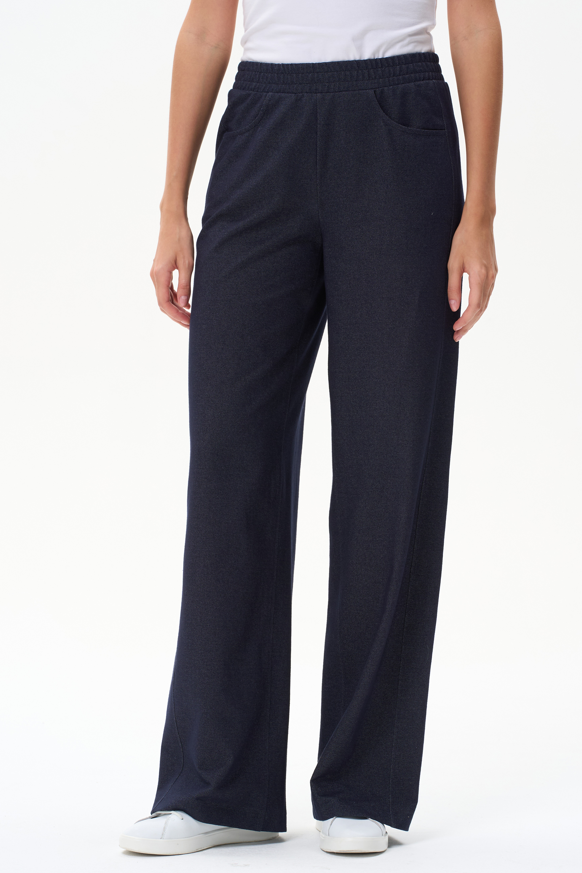 Прямые брюки полной длины с высокой посадкой. Вставки в боковых швах, спереди фигурные карманы, пояс с эластичной лентой внутри, отстрочки в тон полотна. Благодаря конструкции брюк модель идеально сидит на фигуре и зрительно "вятягивает" ноги. Рост модели 175 см