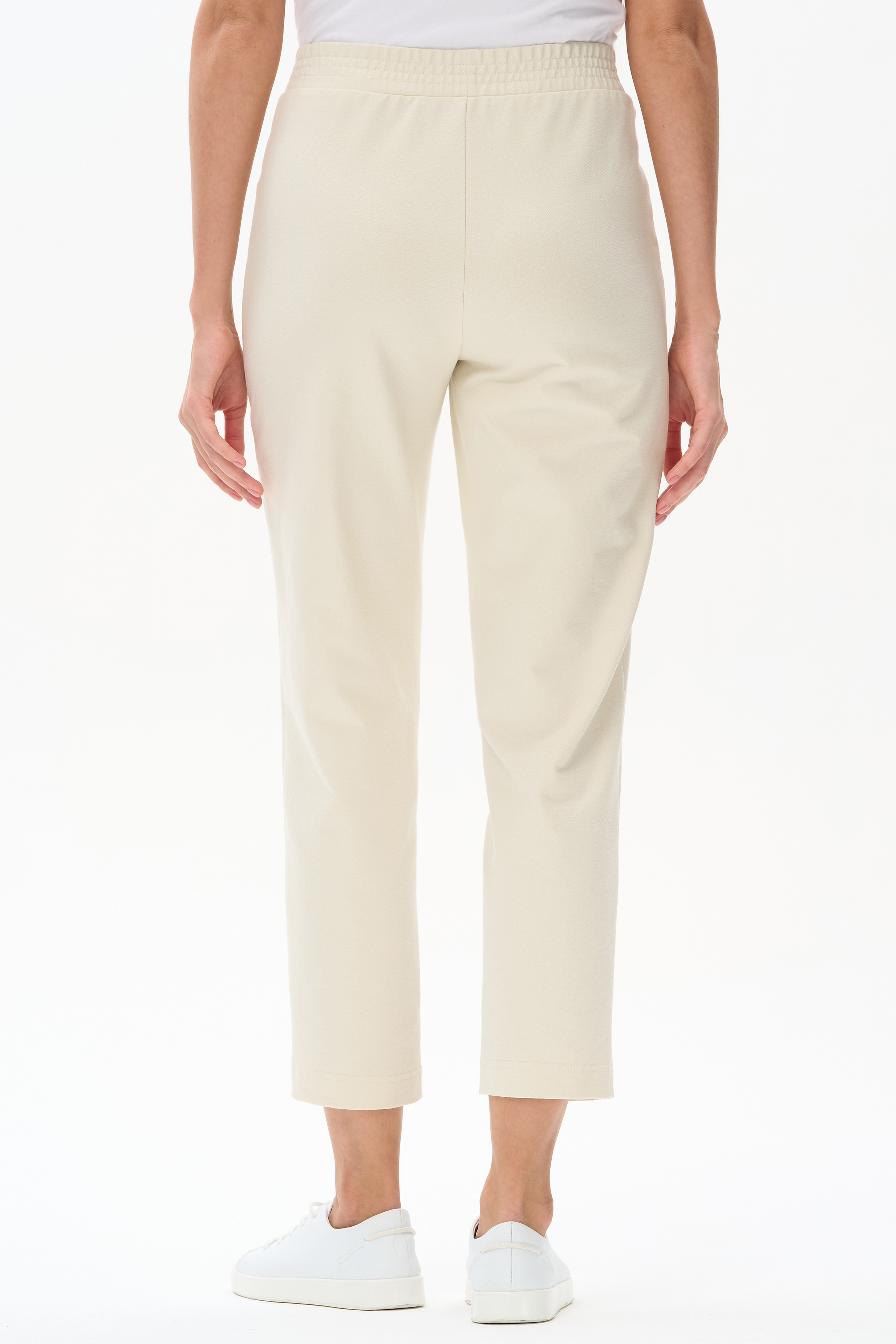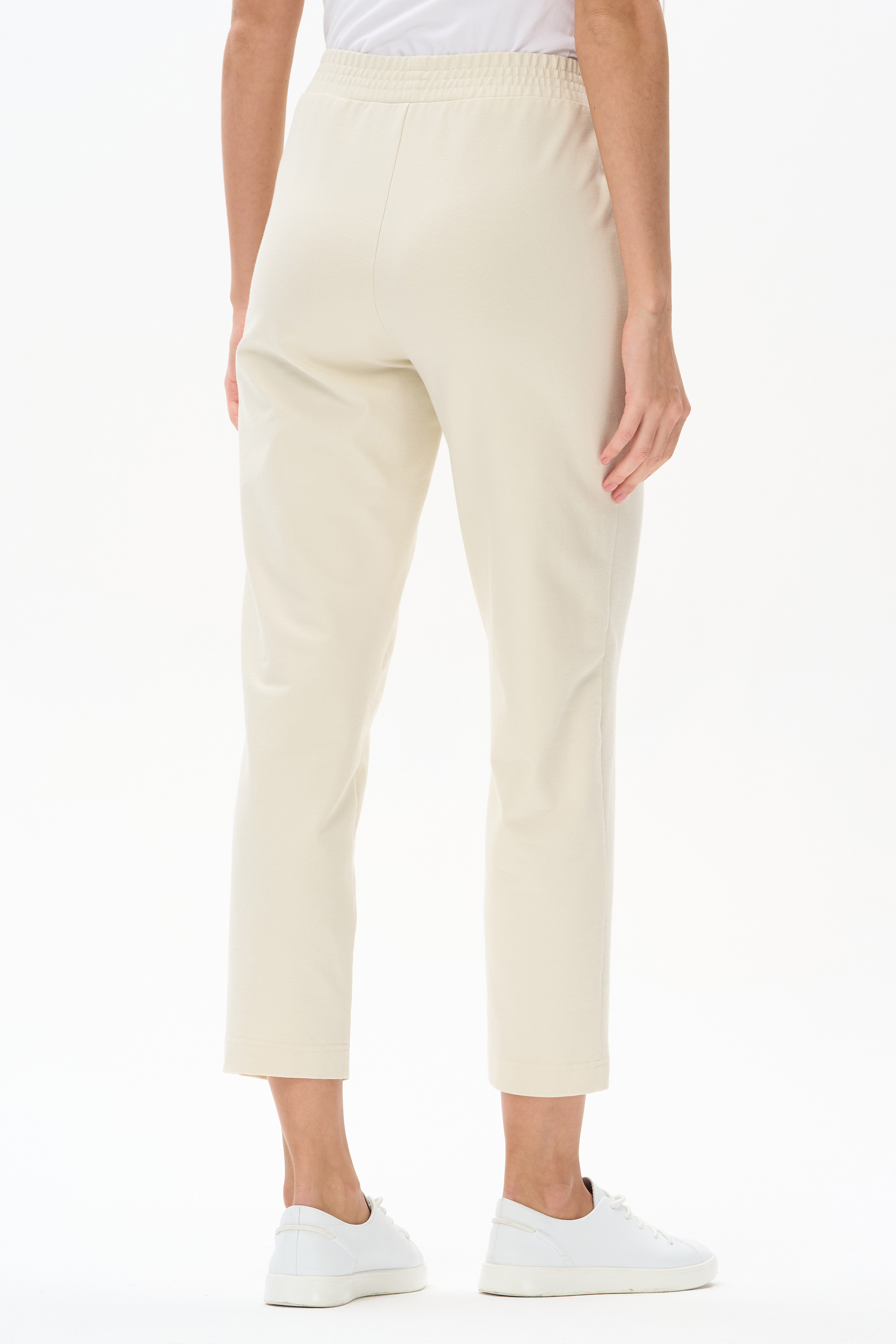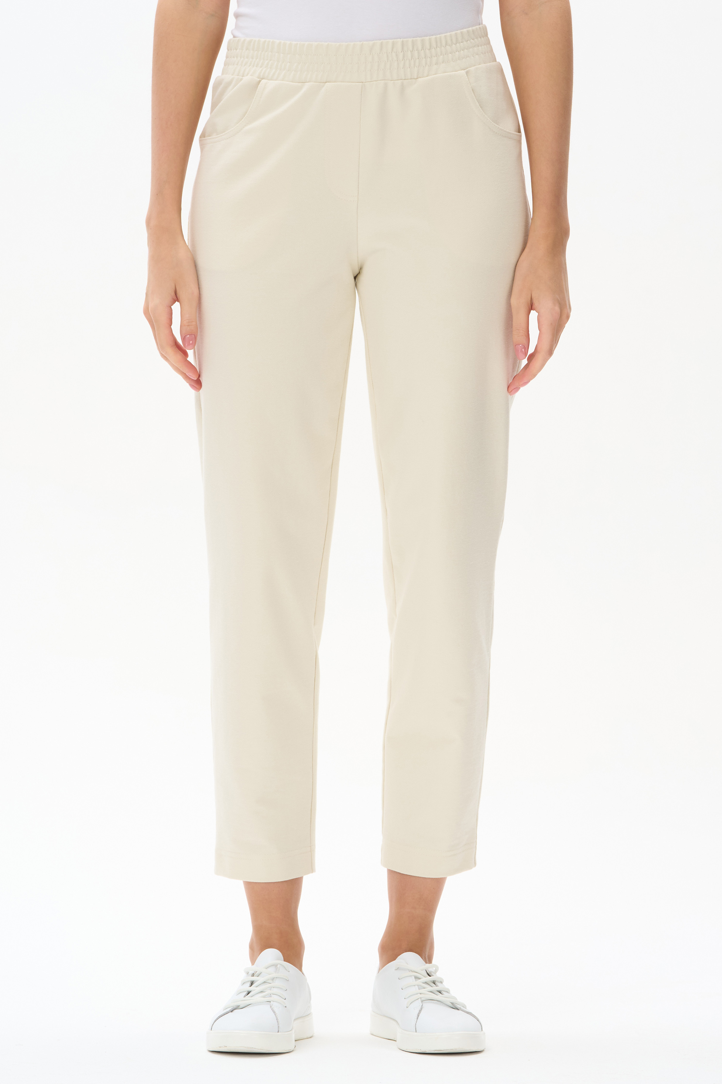 80% хлопок, 14% полиэстер, 6% эластан Укороченные, зауженные брюки с фигурными карманами из джинскота 240 гр в трендовом оттенке Сливочный. Пояс с эластичной лентой внутри. Комфортная, универсальная модель для ярких образов. Рост модели 175 см