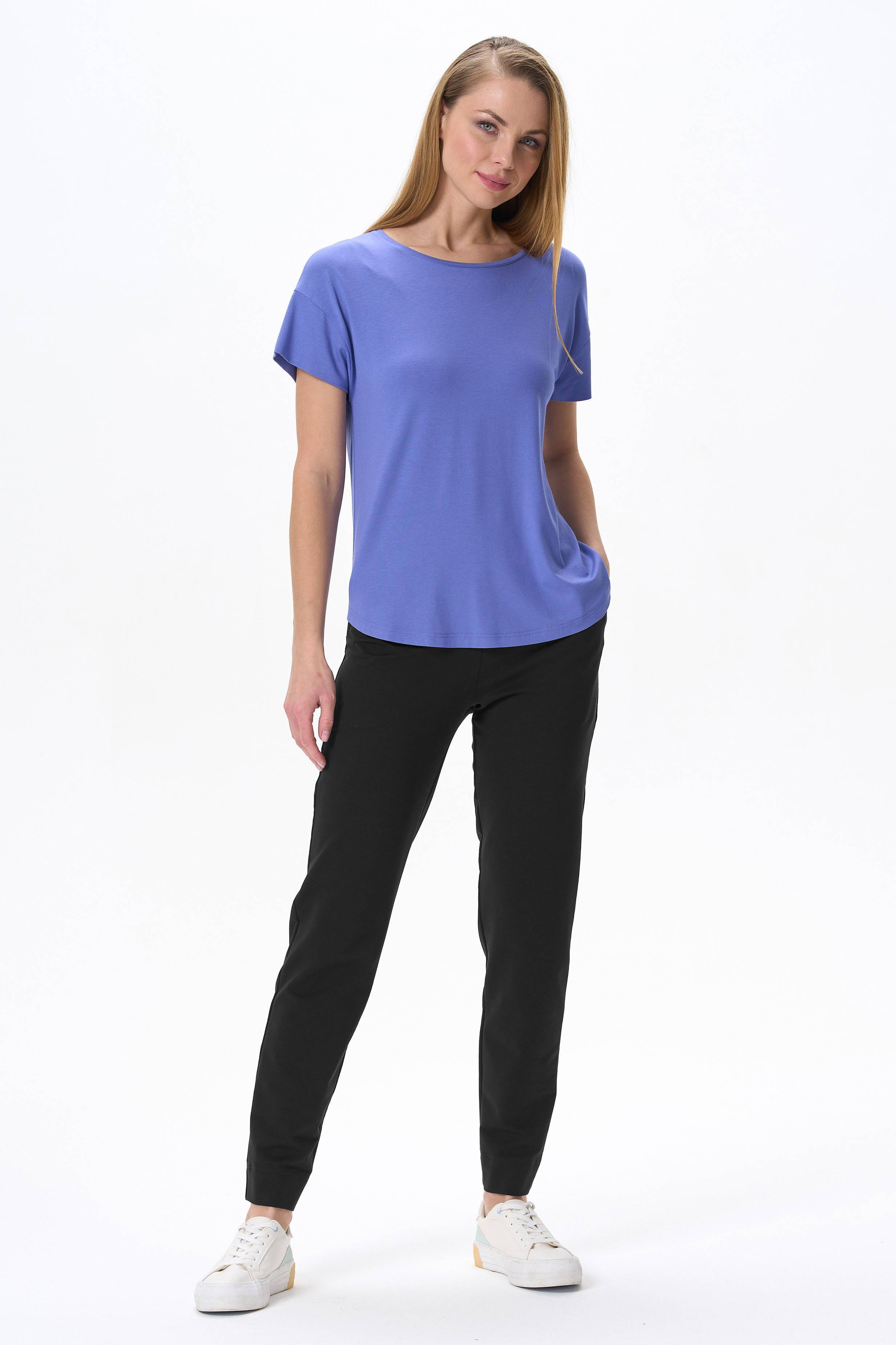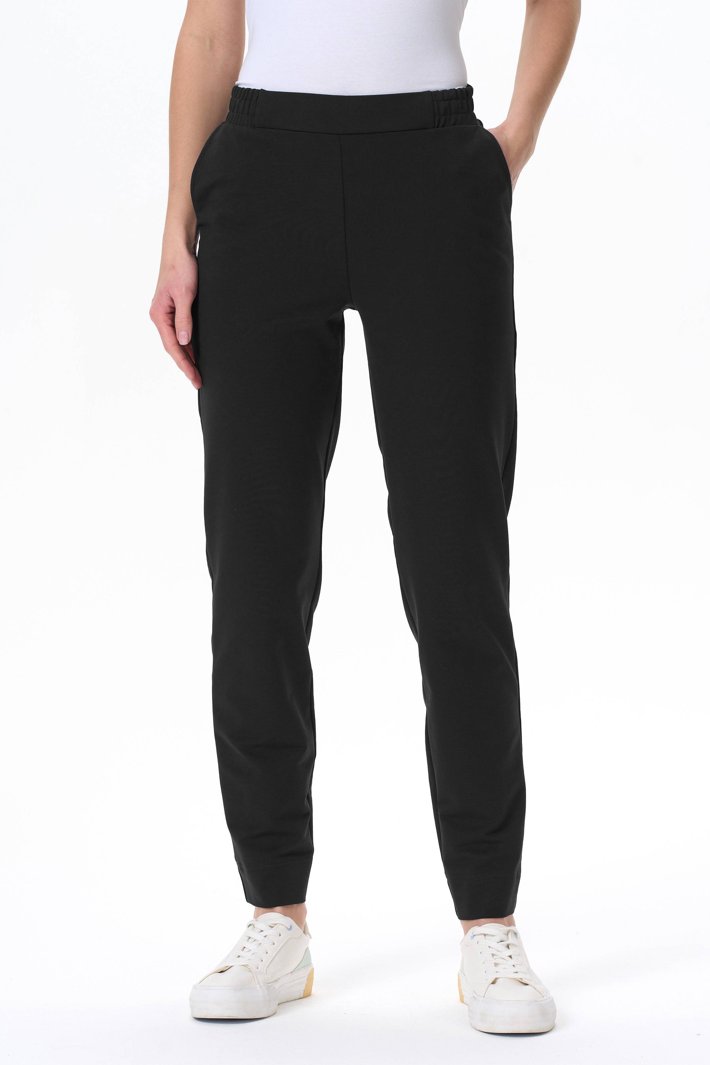 80% хлопок/ 14% полиэстер/ 6% эластан Зауженные брюки с карманами, из хлопкового полотна футер (без начеса). Пояс с планкой и эластичной лентой внутри. Длина брюк регулируется подворотом. Длина по боковому шву (без учета пояса) в 44 размере 98см. Рост модели 177.
