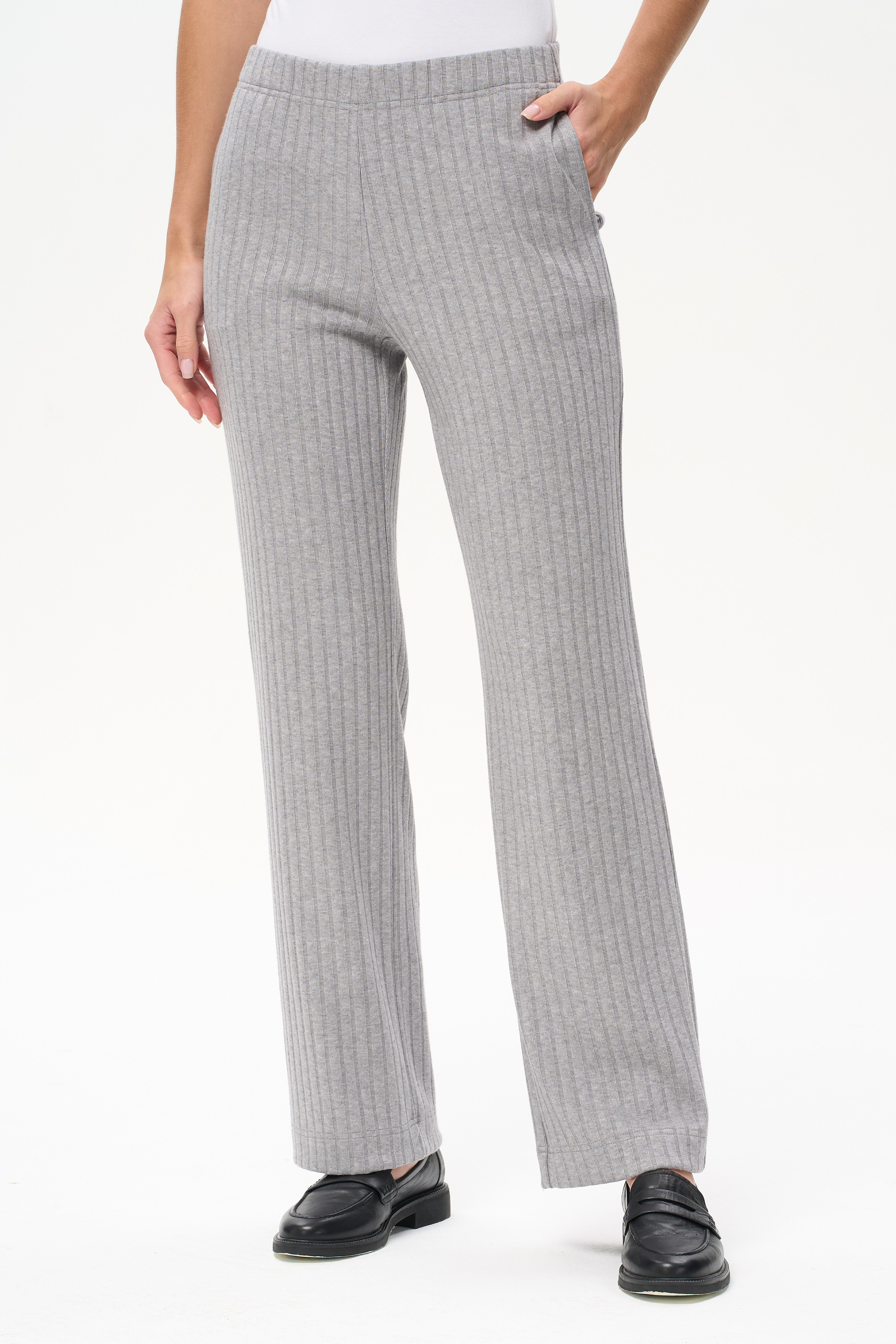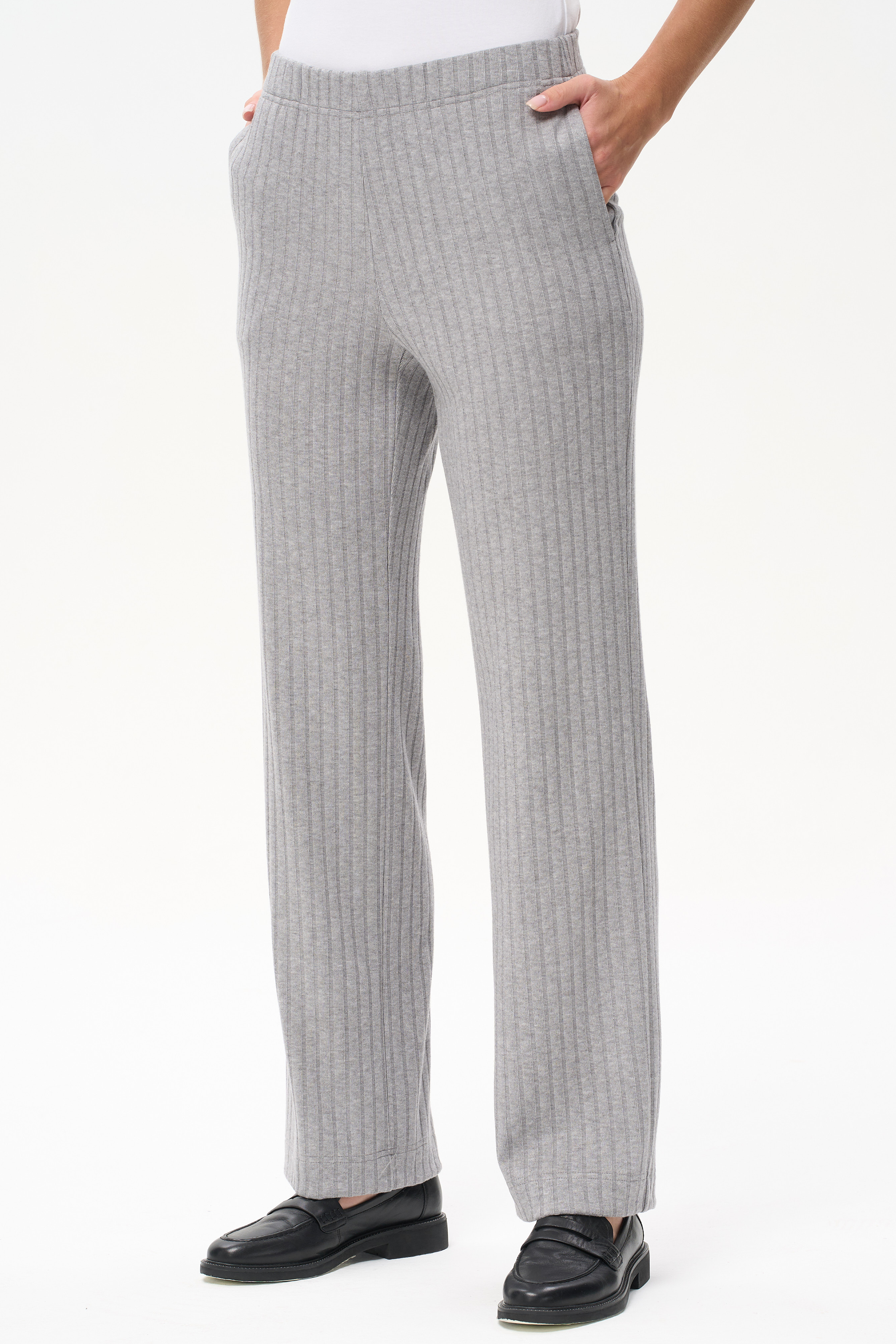 Прямые брюки из фактурного вискозного полотна серого цвета. В боковых швах карманы, пояс с эластичной лентой внутри. Длина брюк по боковому шву в 44 размере - 103 см. Рост модели на фото 178 cм.