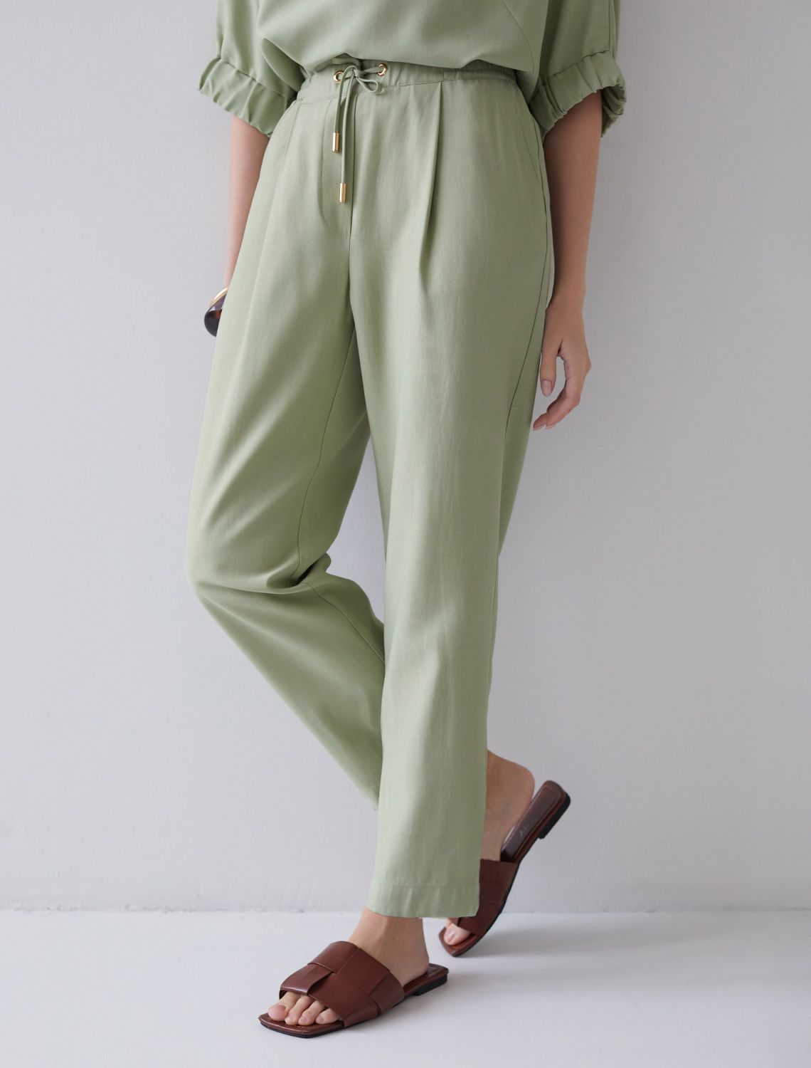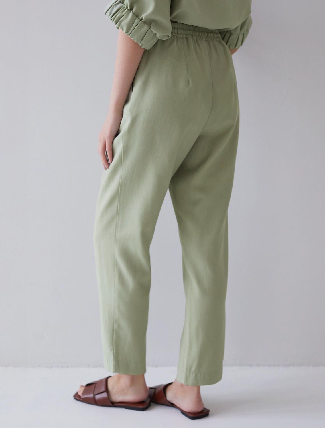 Брюки бананы с поясом на резинке из плотного лиоцелла D24.311 зеленый чай