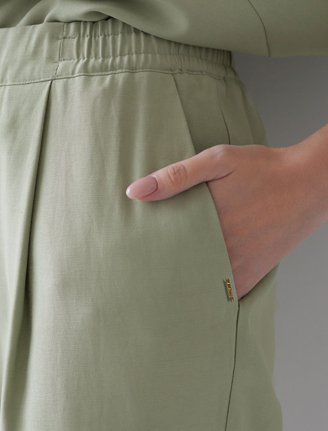 Брюки бананы светло-зеленого цвета выполнены из плотного лиоцелла. Лиоцелл это более дорогой и экологичный вариант вискозы, очень прочный и шелковистый. Модель отличается свободным кроем в бедрах и заужены к щиколотке. Удобный пояс на мягкой на резинке обеспечивает идеальную посадку по фигуре и гарантирует комфорт. Свободные брюки с высокой посадкой и аккуртными защипами создают идеальный силуэт и будут базовым элементом гардероба. Летние брюки отлично сочетаются с монохромным верхом, с ними можно создавать эффектные наряды как на выход, так и для ежедневных рабочих дел или простых прогулок.