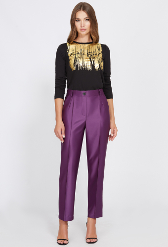 Свободные брюки со стрелками на поясе, сосборенном на резинке, кулисой, манжетами, по передним частям два вертикальных прорезных кармана с листочками.