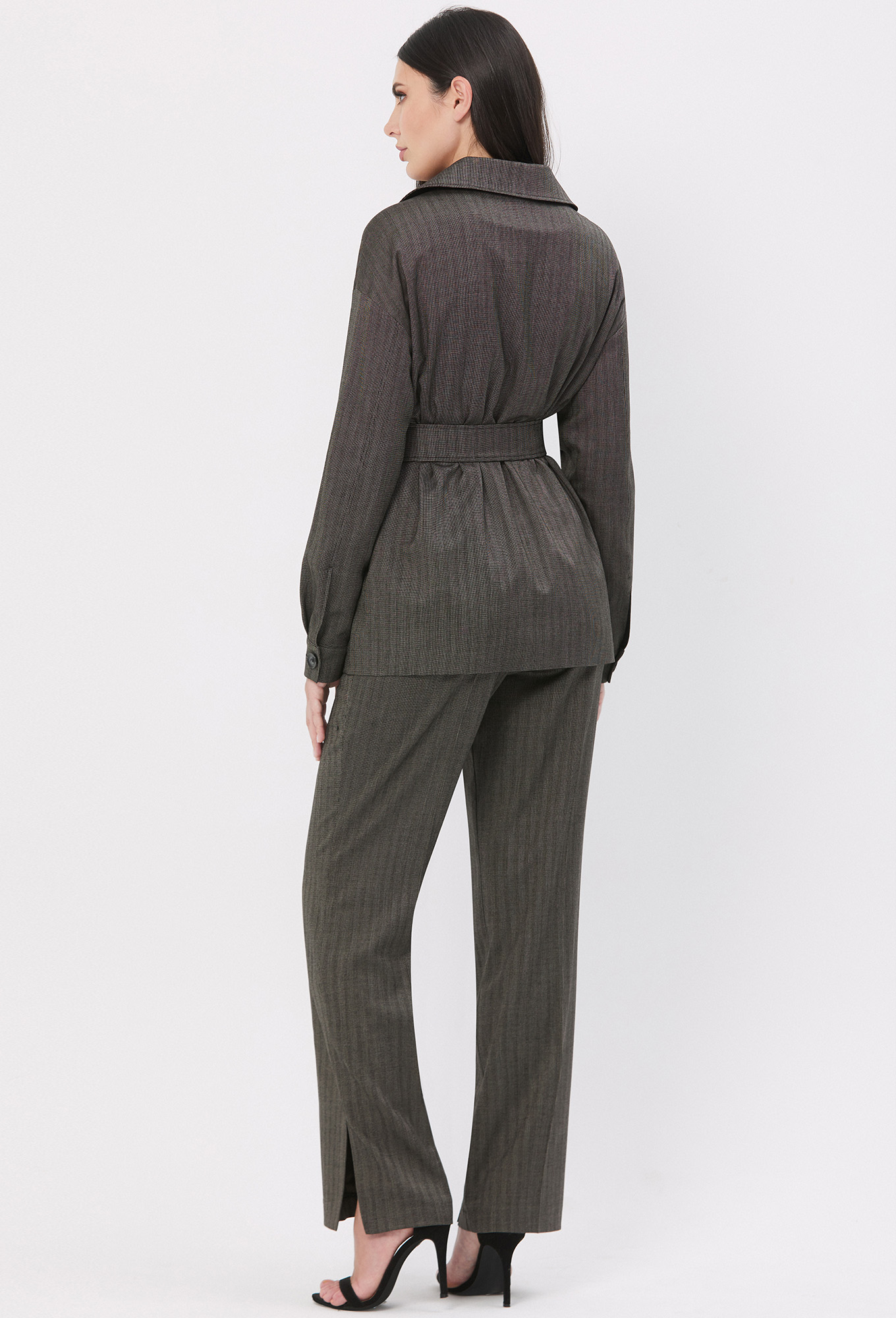 Свободные брюки со стрелками на узком притачном поясе. Изделие с застёжкой на молнию и петлю-пуговицу. Задние части с карманами-обманками с рамками. Добавить динамичности модели помогают разрезы в боковых швах.