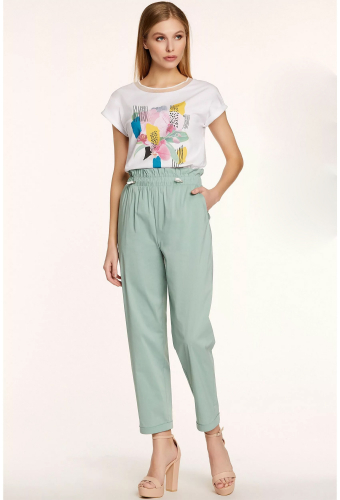 Свободные брюки на поясе сосборены на резинке. По передним частям два вертикальных прорезных кармана.