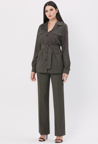 Стильные брюки со стрелками сшили из льняной ткани с добавлением вискозы. Изделие на притачном поясе, частично собранном на эластичную тесьму, с застежкой на молнию и петлю-пуговицу. Передние части с косыми карманами и широкими шлёвками, задние части с карманами с клапанами и рамками и широкими шлевками. Оригинальность брюкам придает интересное решение оформления низа и расположение съёмного пояса.