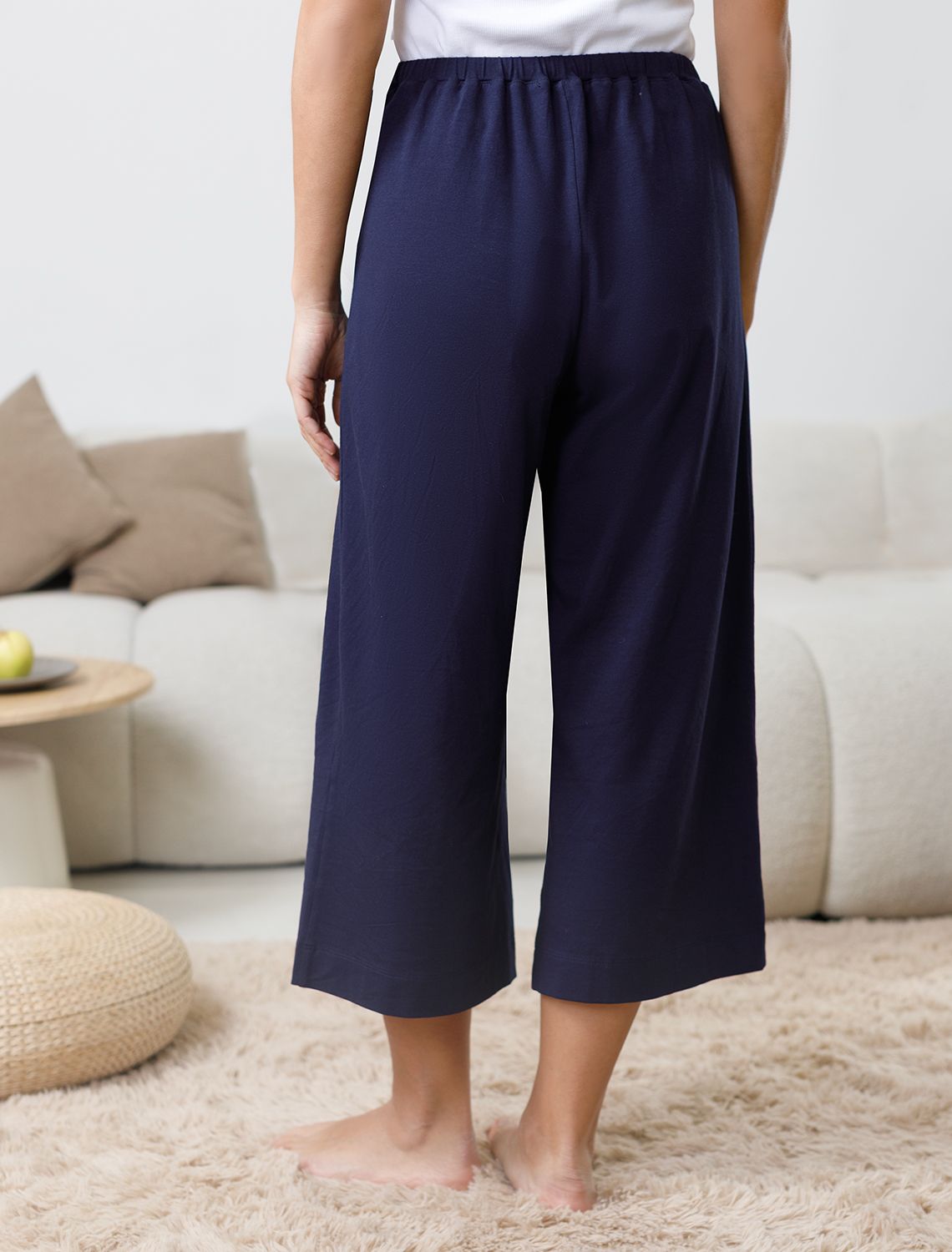 Комфортные укороченные широкие брюки кюлоты темно-синего цвета на тонкой резинке выполнены из 100% хлопка плотностью 140 Г/м2. Главная особенность этого изделия — тонкое кулирное полотно, которое легче и воздушнее стандартного трикотажа. Благодаря своей деликатной текстуре модель идеально подходит для домашних образов и пижамных комплектов. Ткань отлично «дышит», обеспечивая максимальный уют во время сна и отдыха. Эти свободные брюки обеспечивают максимальную свободу движений благодаря широкому крою. Эластичная резинка в области талии гарантирует удобную посадку и индивидуальное прилегание по фигуре. Защипы добавляют выразительность образу и помогают сформировать актуальный силуэт, подчеркивая современные тенденции. Повседневные брюки подходят для больших размеров, мягко скроют возможные недостатки фигуры, подчеркивая комфорт и стиль. Домашние брюки кюлоты отлично сочетаются с разными вариантами верхней одежды, поэтому их можно носить не только дома, но и на прогулках. Удобные брюки созданы для тех, кто ценит комфорт и практичность без лишних деталей.